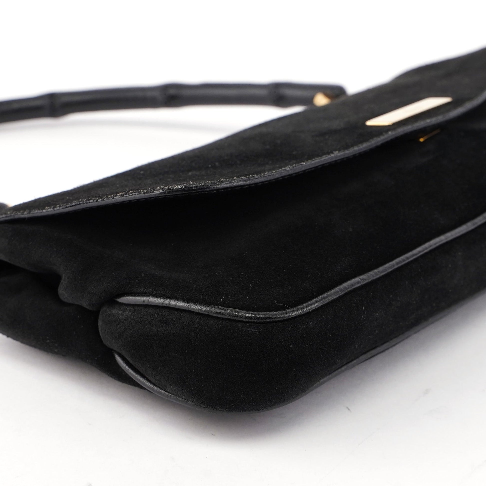 Designed by Tom Ford in the late 1990s, the Gucci Bamboo handbag is handcrafted from luxurious black suede and features gold-tone hardware with a bamboo handle including Gucci logo engraving. The magnetic closure opens to a satin-lined interior with an interior zipper pocket. The bag is finished with the Gucci logo plaque on the front.