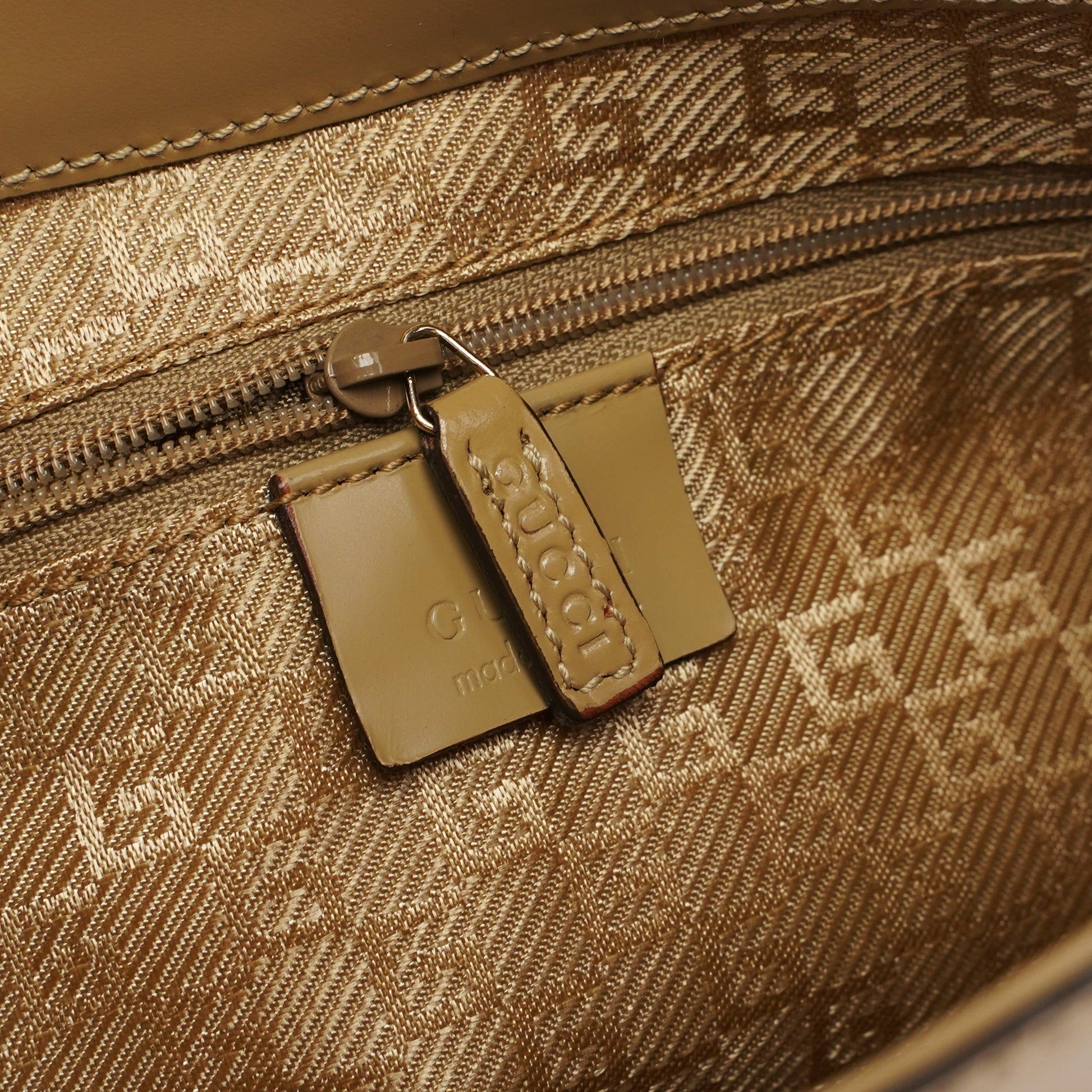 Designed by Tom Ford in the late 1990s, the Gucci Jackie shoulder bag exudes sophistication. Made from beige patent leather with gold-tone hardware engraved with the iconic Gucci logo, it features the signature Jackie clasp closure. Inside, the satin-lined interior offers practicality with a convenient interior zipper pocket.