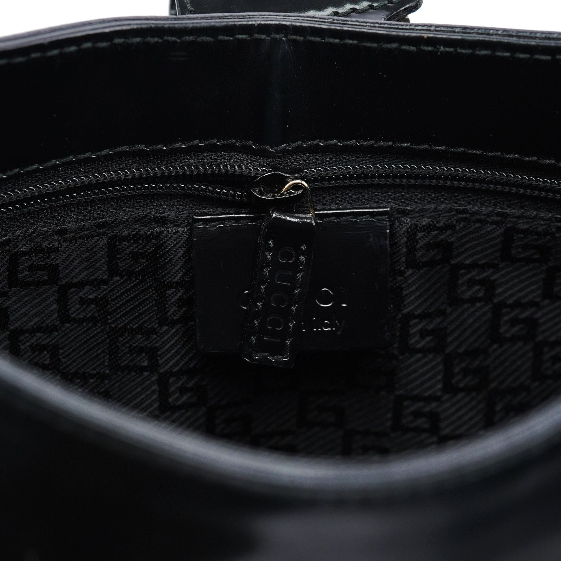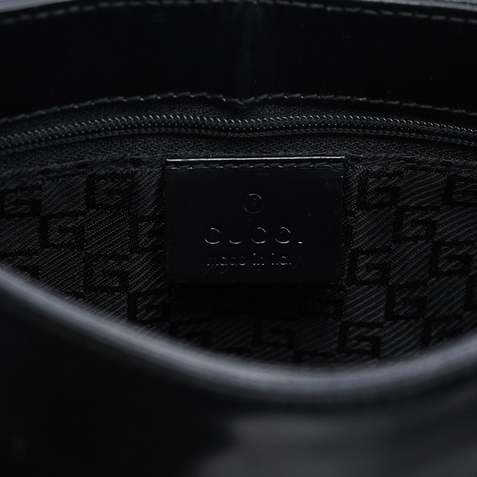 Designed by Tom Ford in the late 1990s, the Gucci Jackie shoulder bag exudes sophistication. Made from black patent leather with gold-tone hardware engraved with the Gucci logo, it features the signature Jackie clasp closure. Inside, the satin-lined interior offers practicality with a convenient interior zipper pocket.