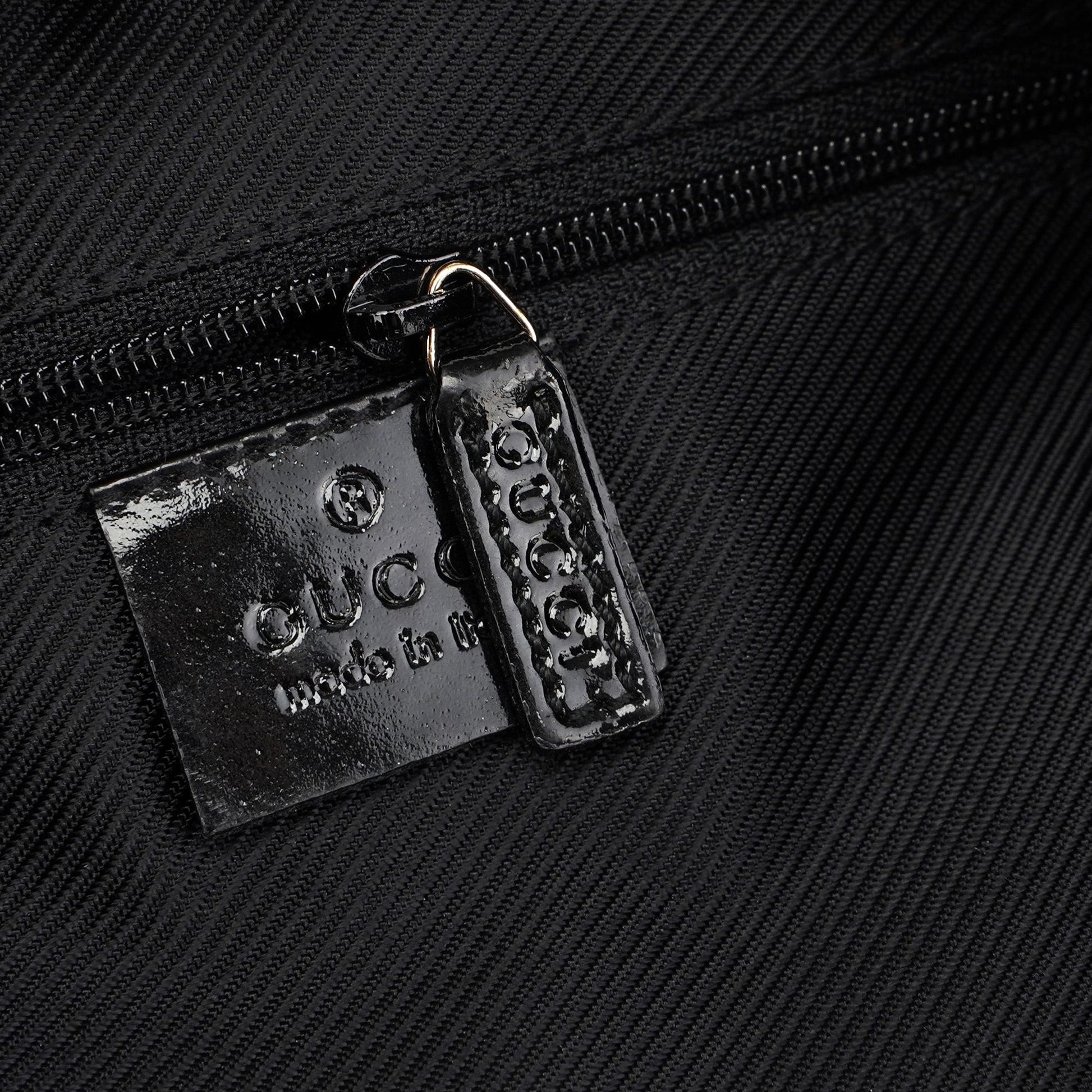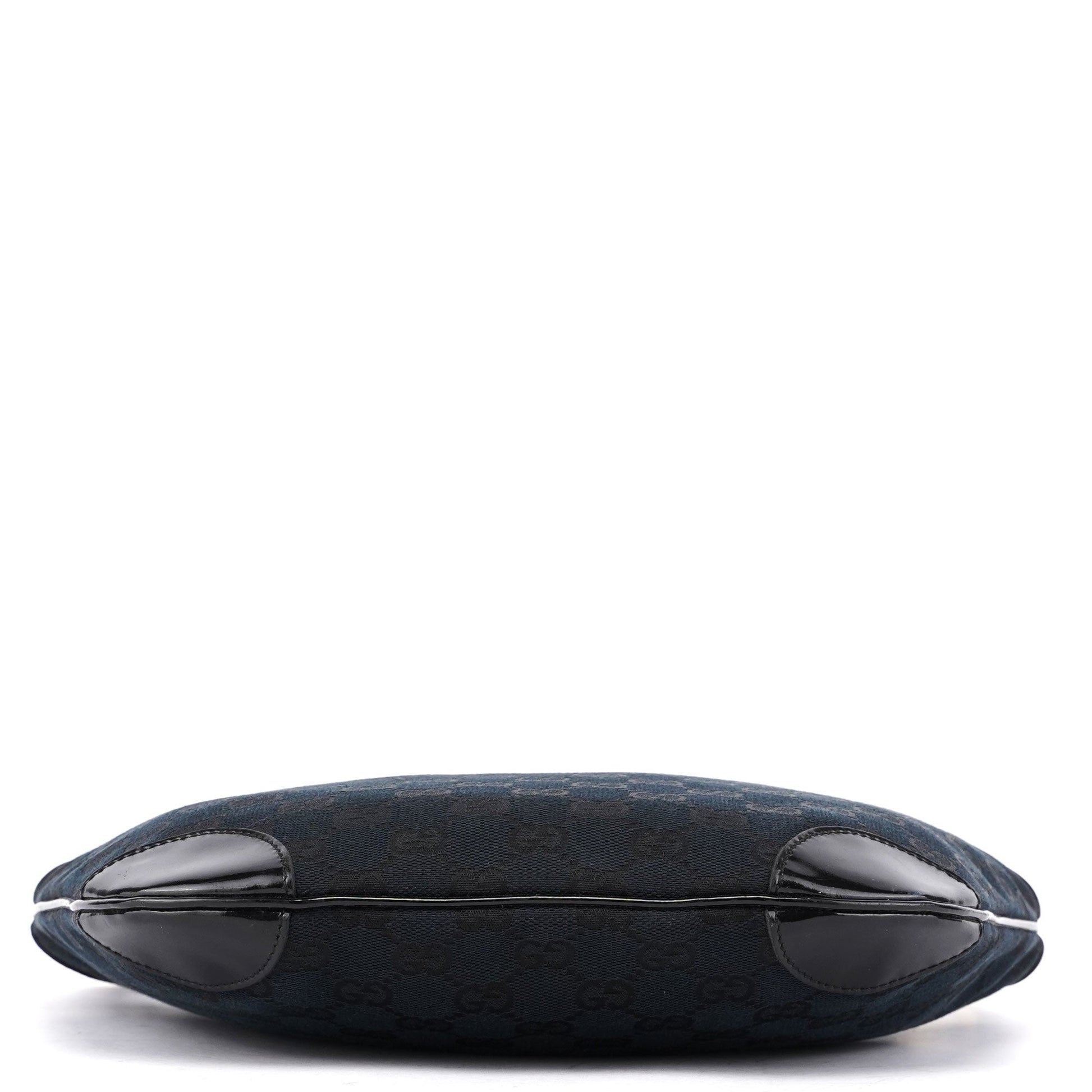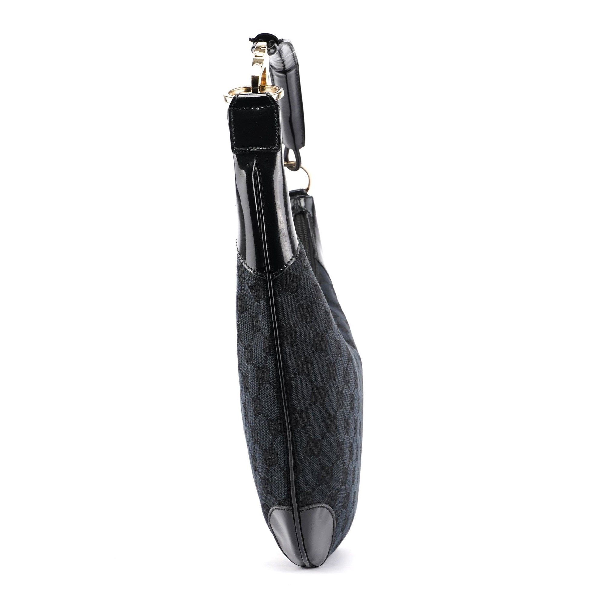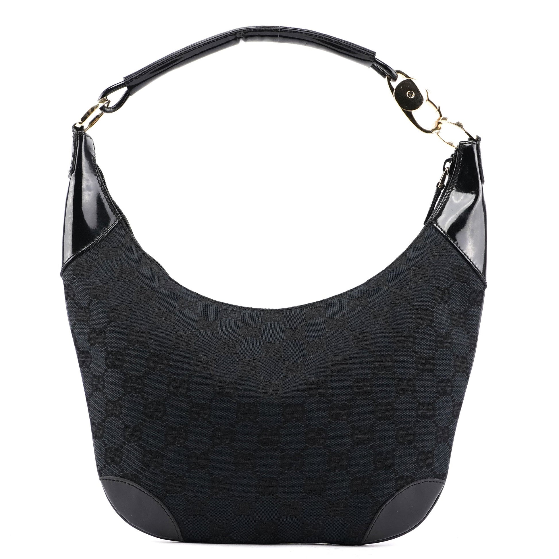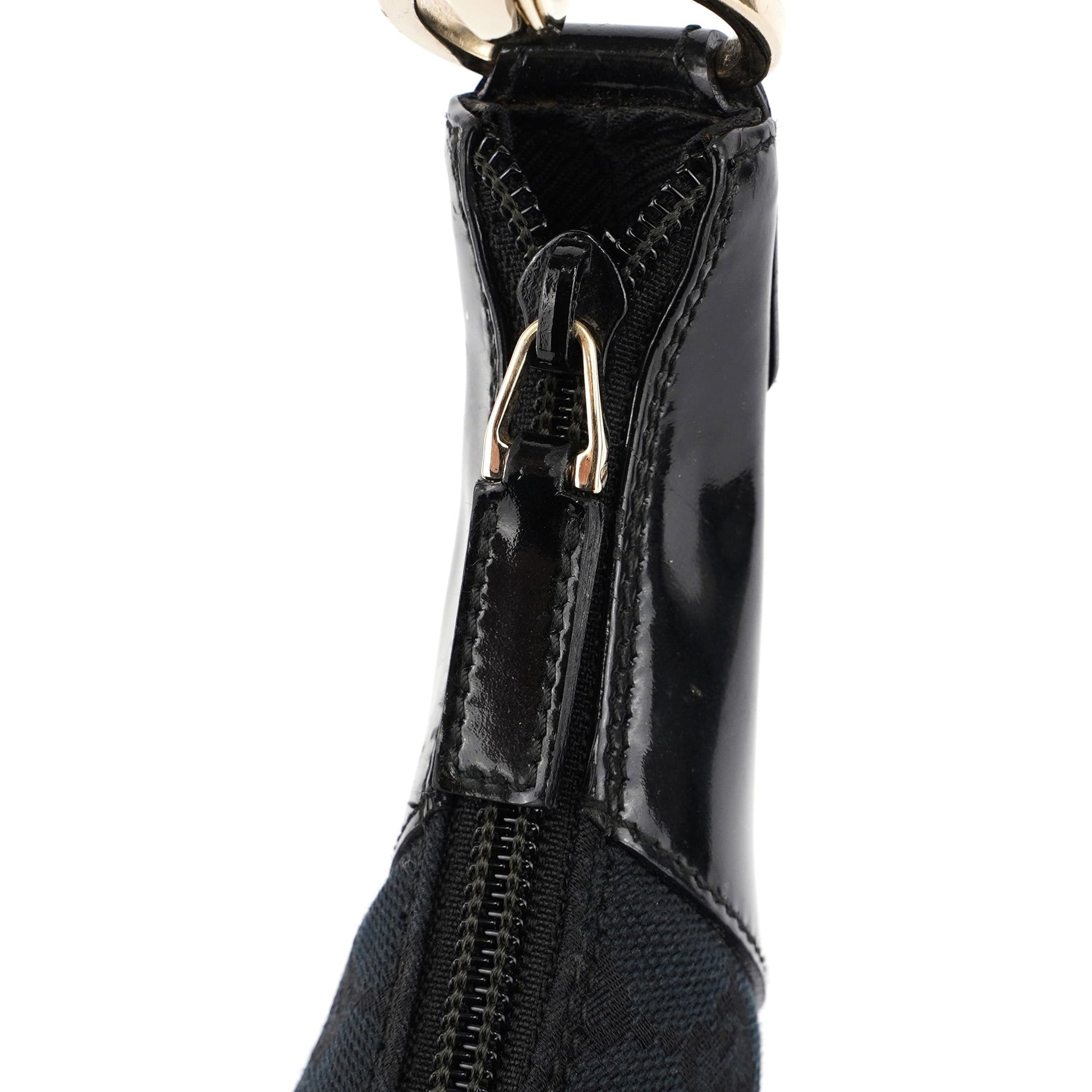 Explore the Gucci GG shoulder bag, a late 1990s design by Tom Ford. Crafted from black GG monogram canvas with sleek black patent leather trim, this bag features gold-tone hardware engraved with the Gucci logo. It includes a zipper closure and a satin-lined interior with a zip pocket for secure and organized storage.