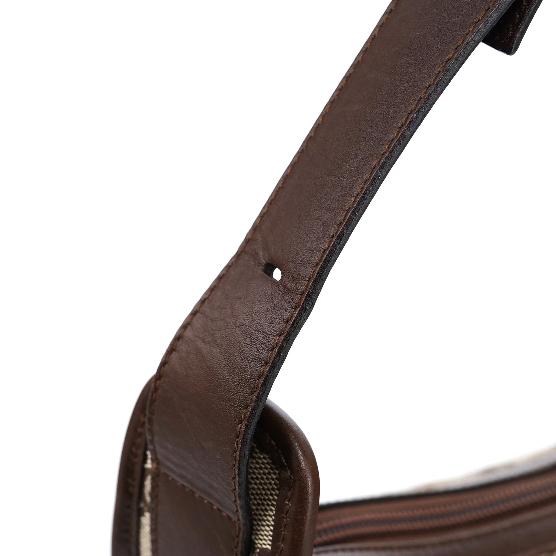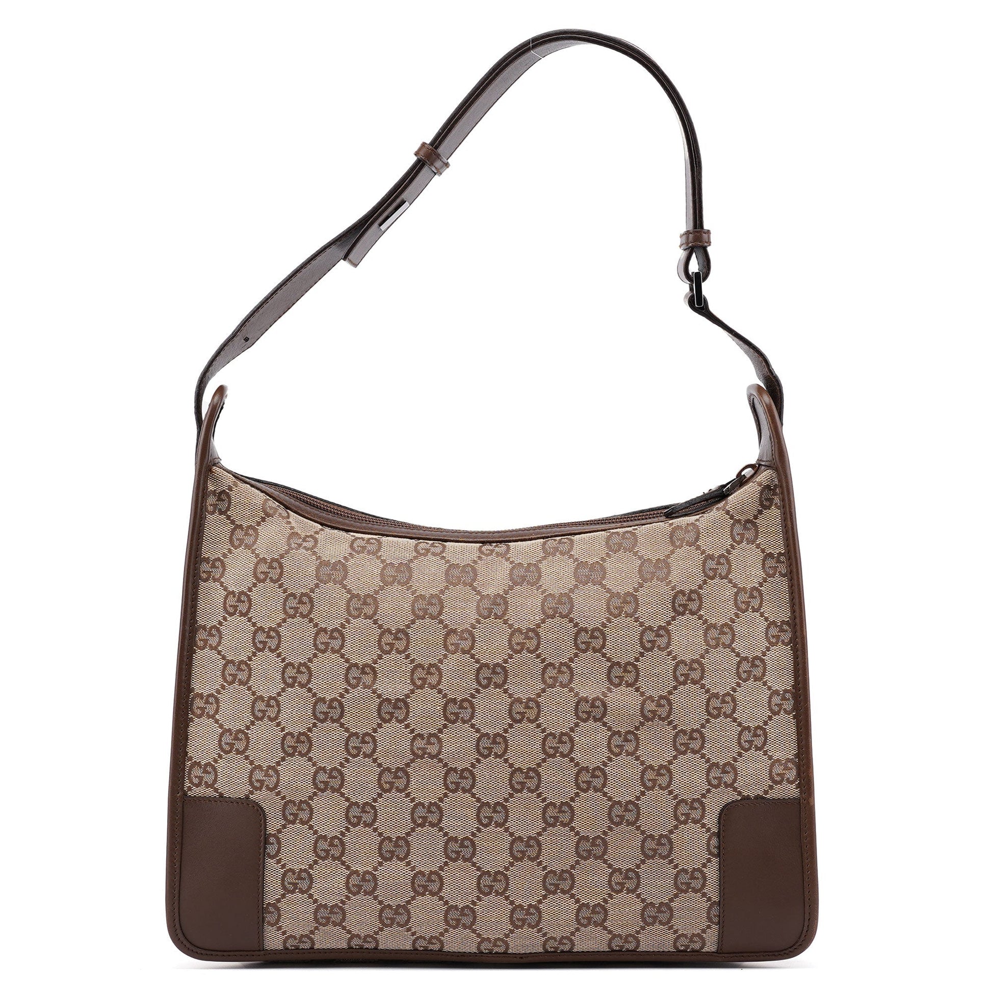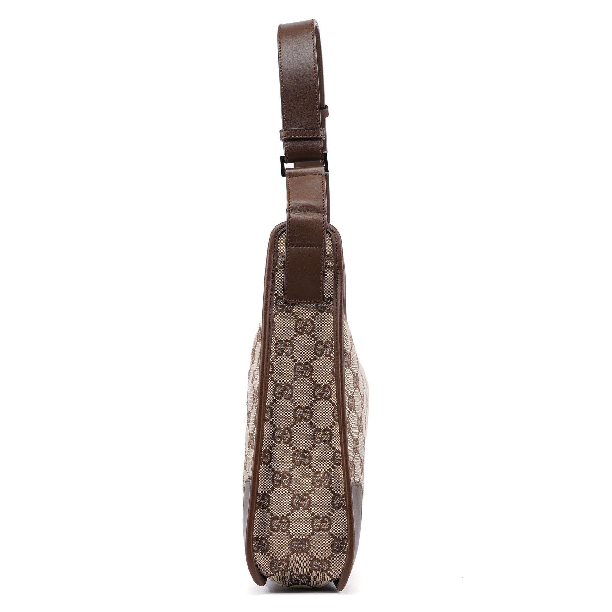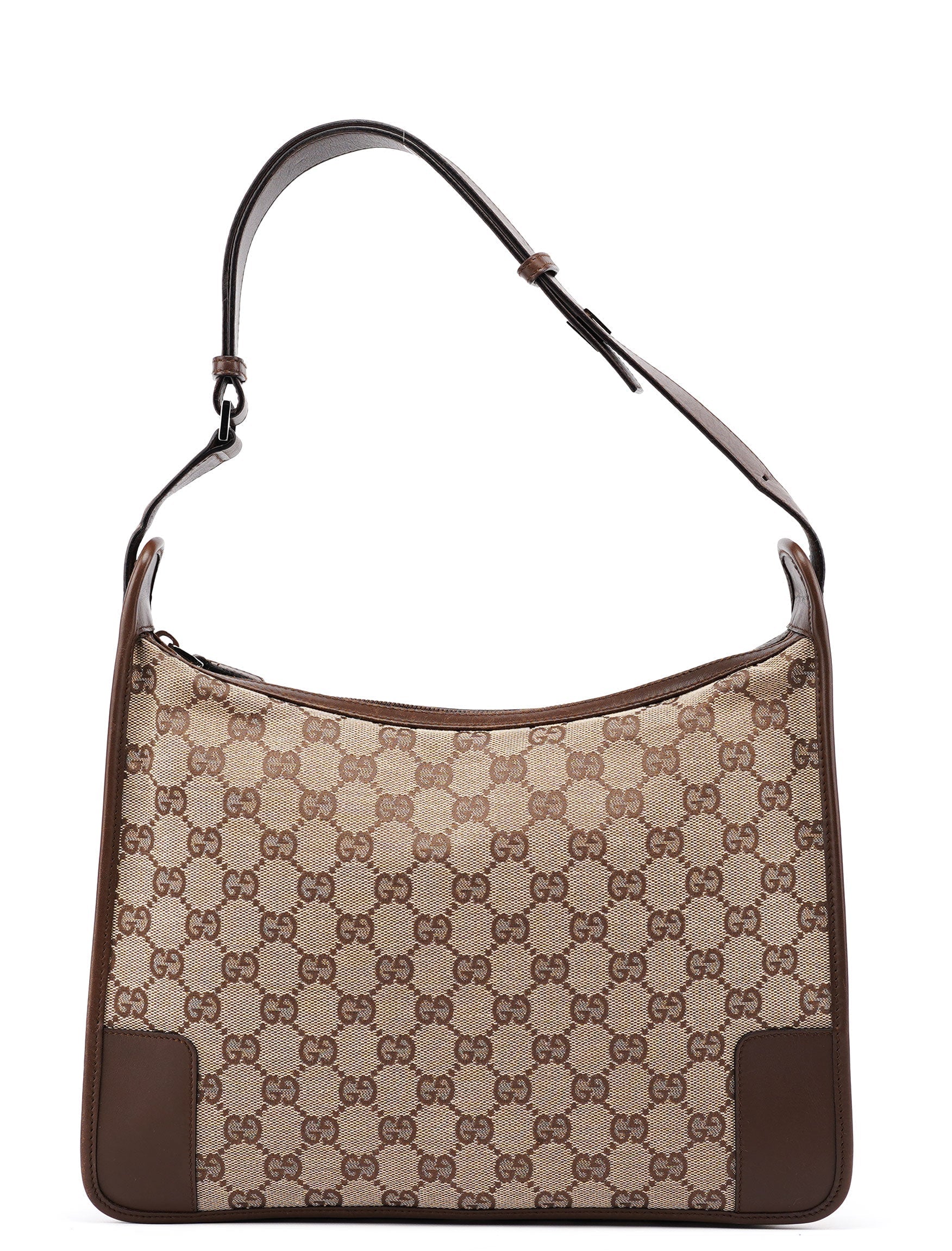 Discover the Gucci GG shoulder bag, designed by Tom Ford in the late 1990s. Handcrafted in beige GG monogram canvas with brown calfskin leather trim, it features silver-tone hardware engraved with the Gucci logo. The bag offers a zipper closure, an adjustable handle and a satin-lined interior with interior pocket for organized storage.