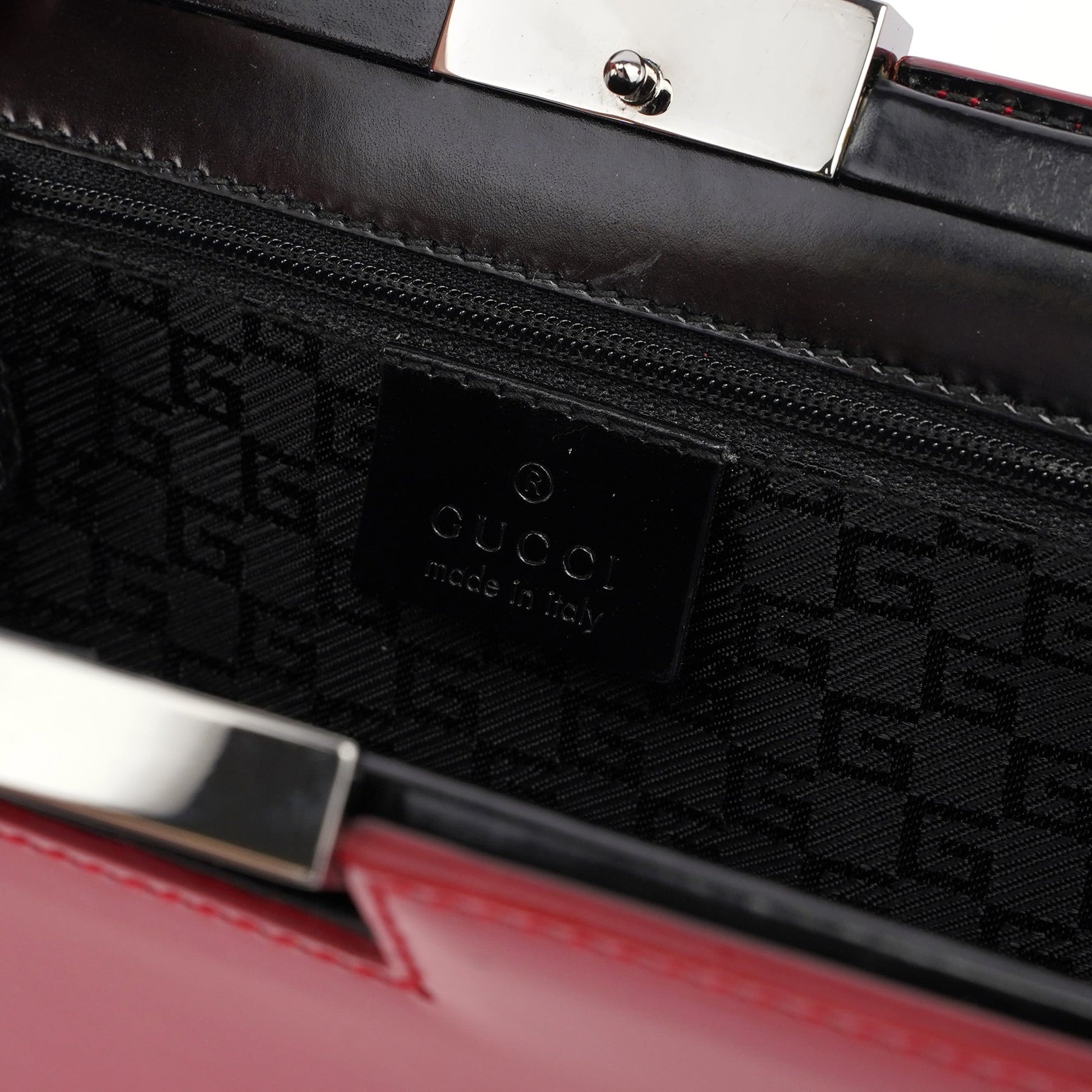 Handcrafted from red leather trim, this Gucci Vitello handbag by Tom Ford from the late 1990s features silver-tone hardware engraved with the Gucci logo and a clutch-style closure. The bag includes a Gucci logo keychain, a satin-lined interior, and an interior zipper pocket, showcasing timeless elegance.