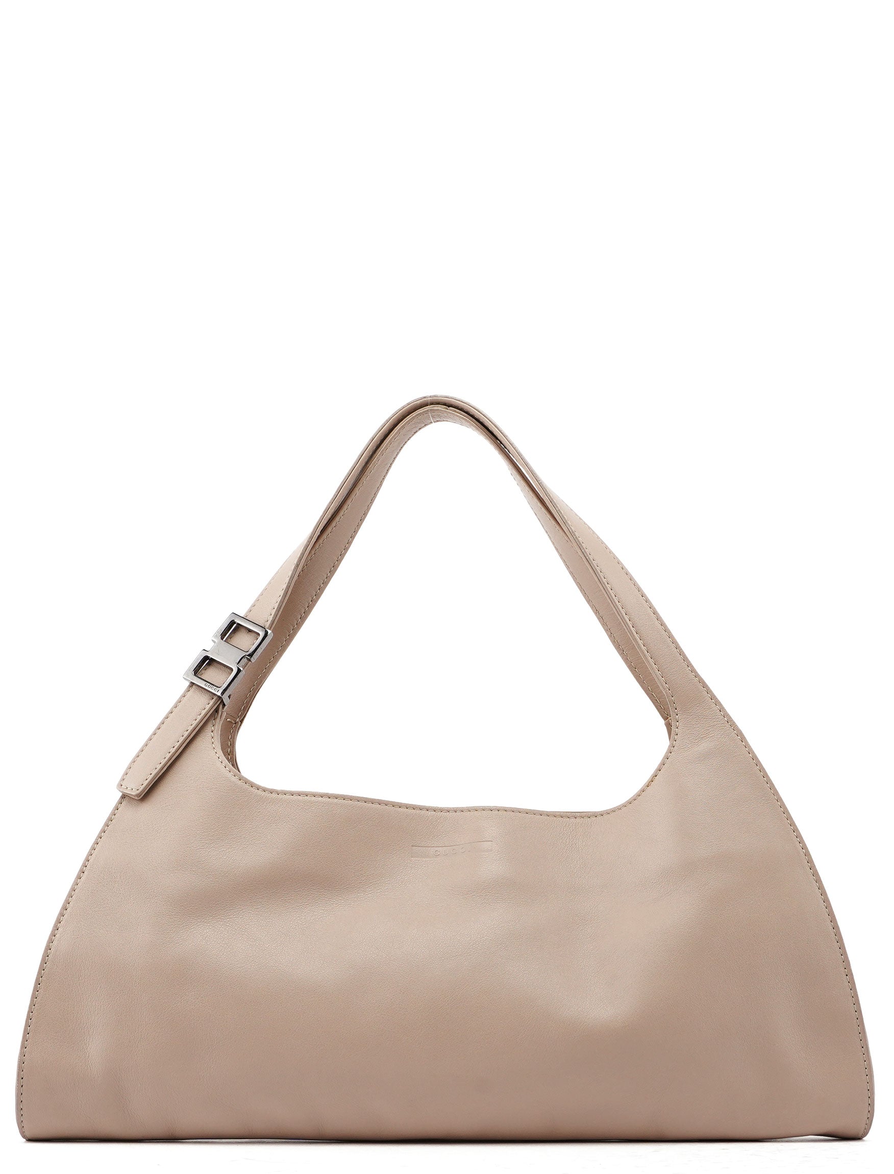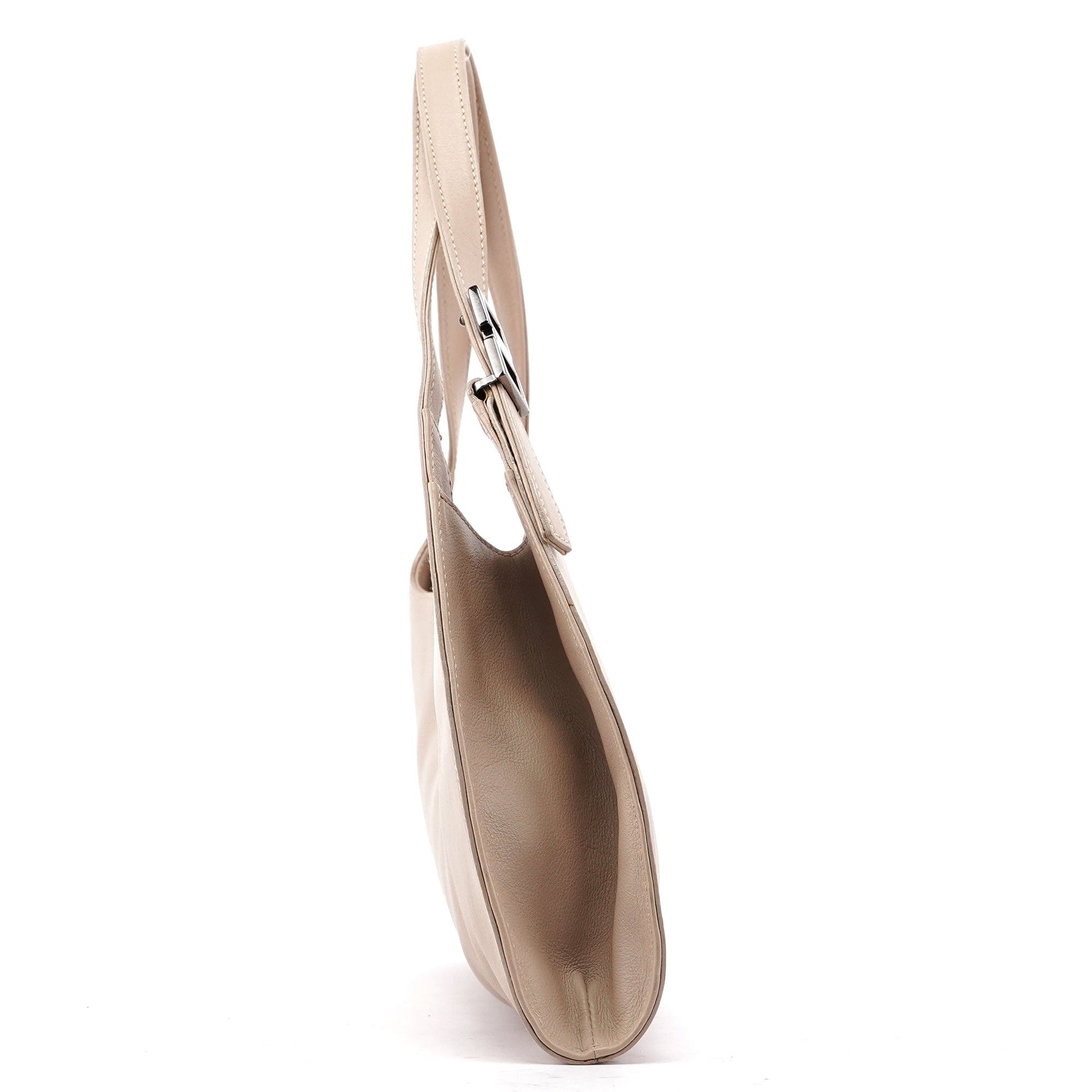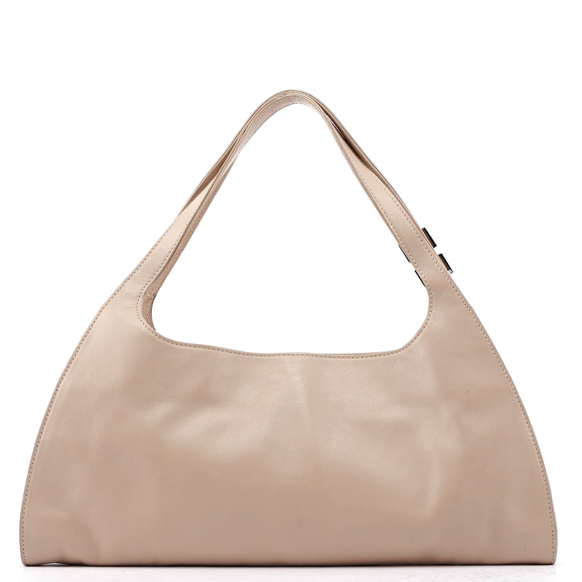 This late 1990s Gucci shoulder bag, designed by Tom Ford, is handcrafted from beige calfskin and accented with silver-tone hardware featuring the Gucci logo. A magnetic closure secures the contents, while the calfskin leather-lined interior includes a pocket. The Gucci logo, embossed on the front, enhances its elegant design.