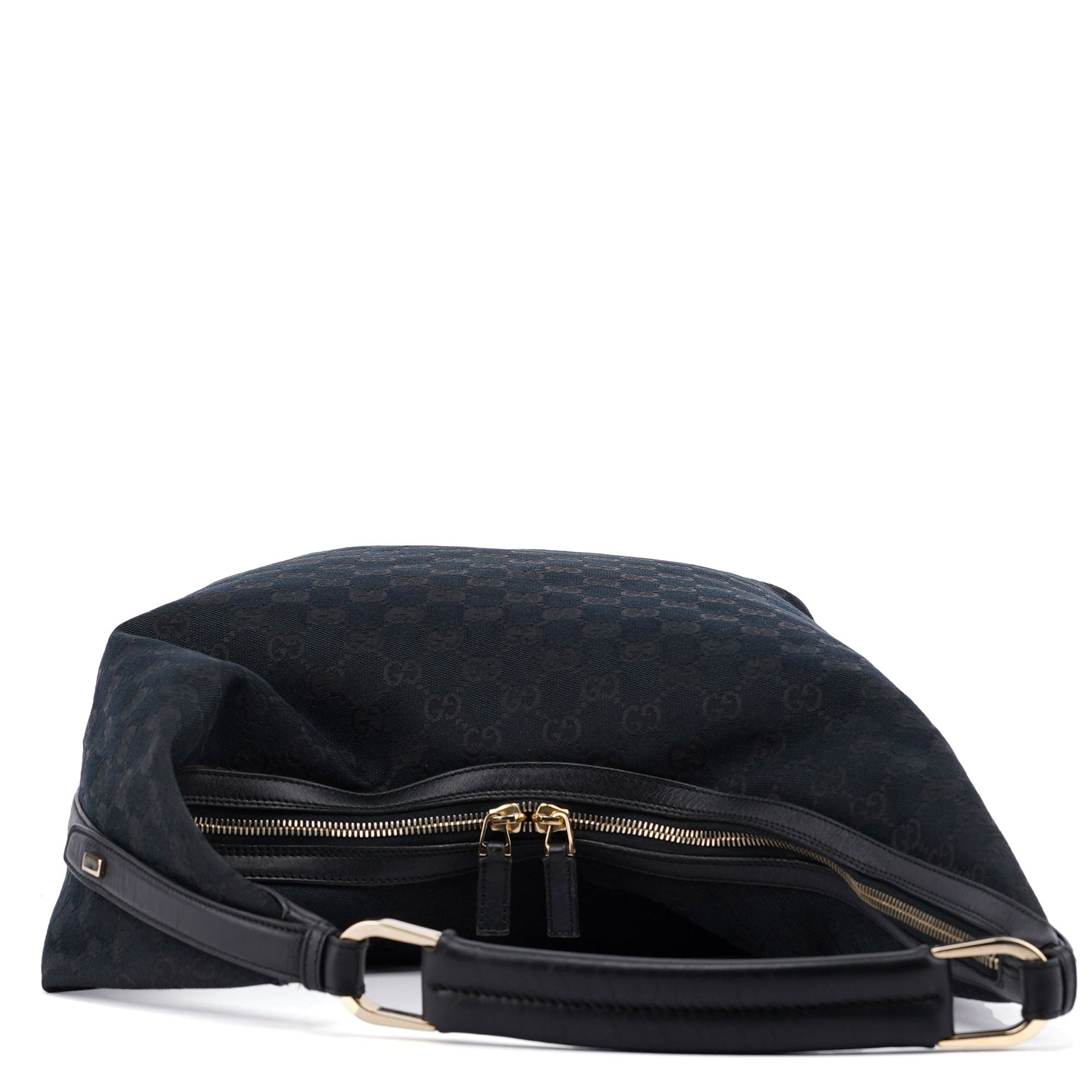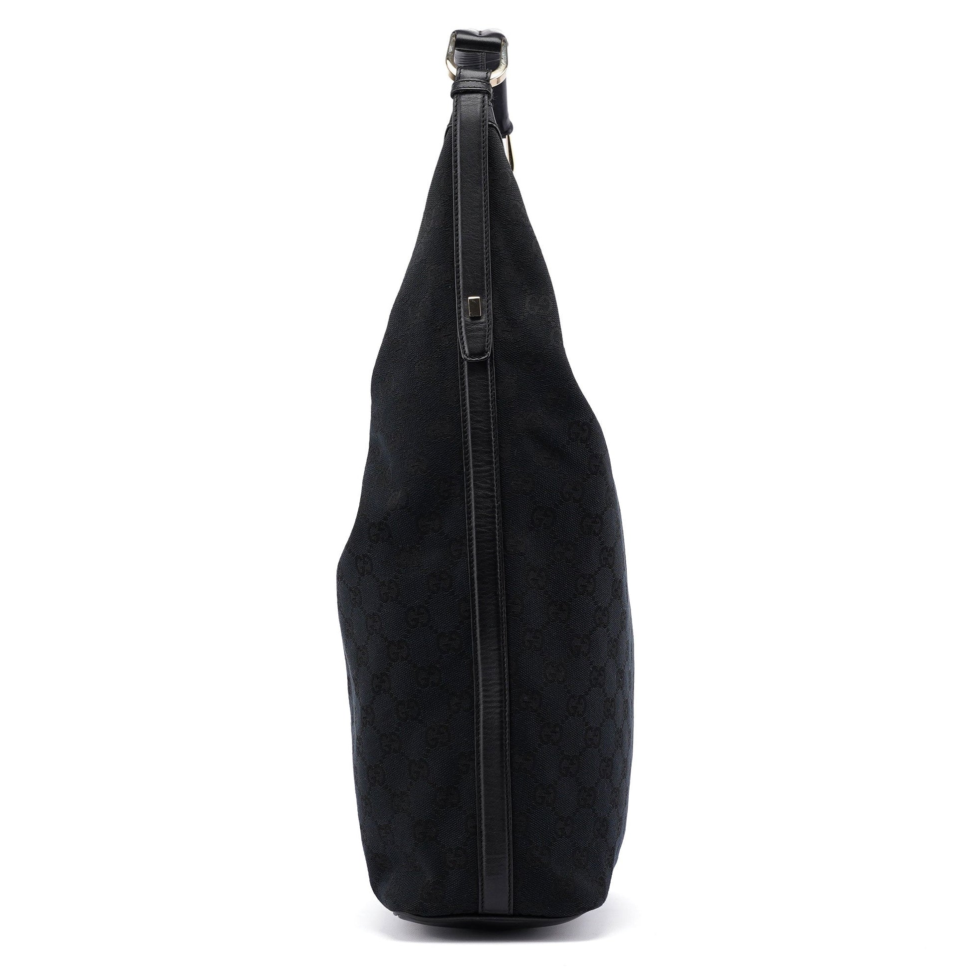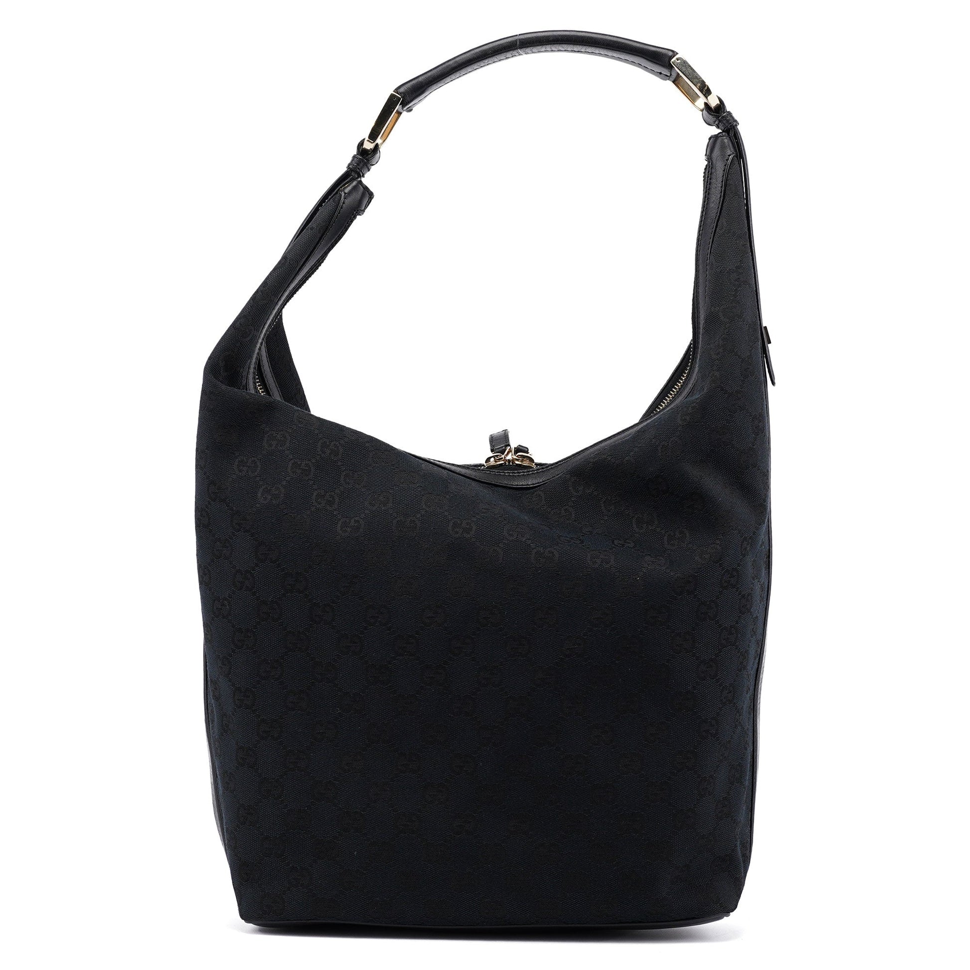 Handcrafted from black GG monogram canvas with tonal calfskin leather, this Gucci hobo bag by Tom Ford from the late 1990s features a distinctive V-shaped silhouette and gold-tone hardware. The secure zipper closure opens to a satin-lined interior with an additional zipper pocket, merging elegant style with functional design.