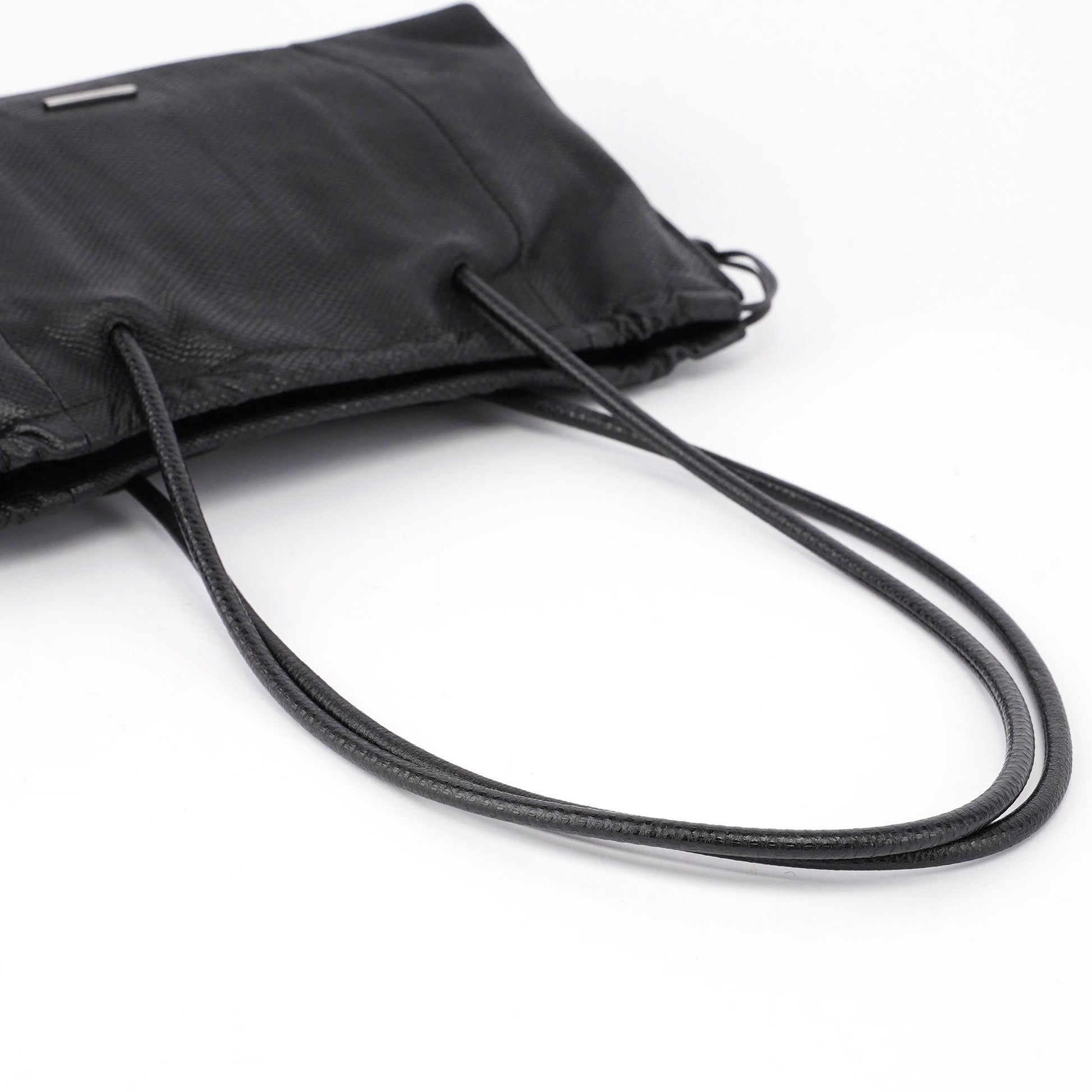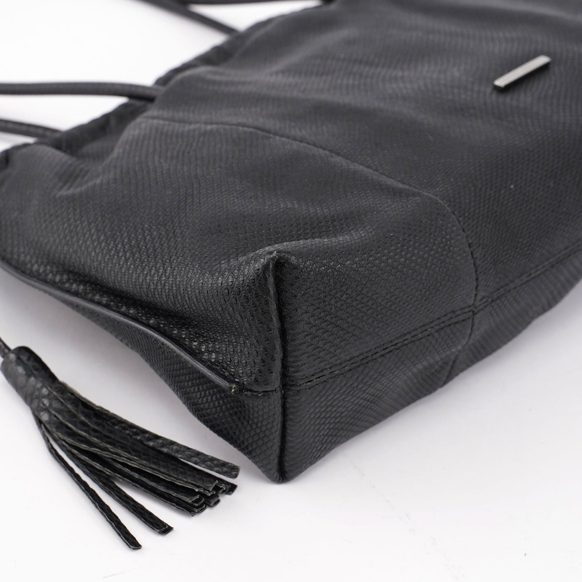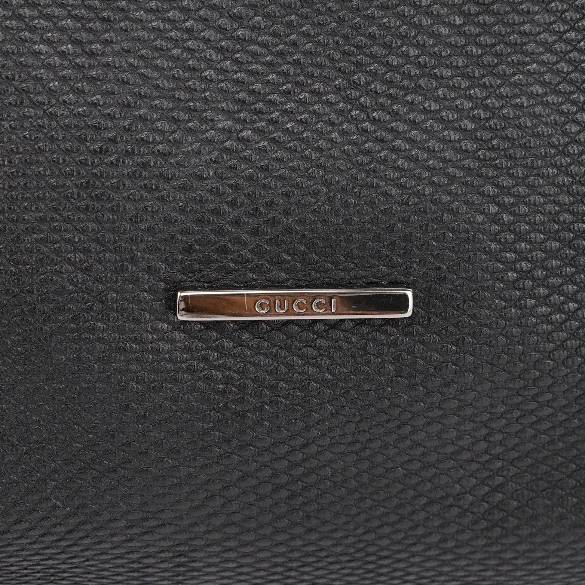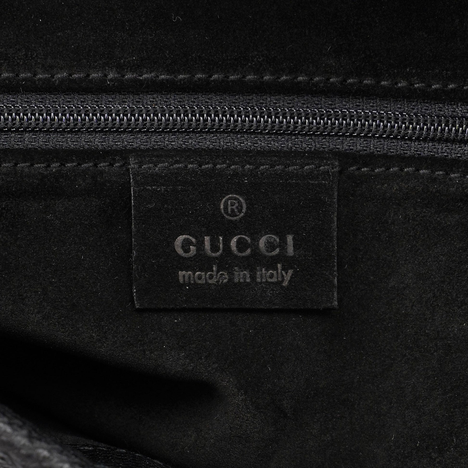 Discover the Gucci tote bag, designed by Tom Ford in the late 1990s. This sophisticated piece is handcrafted from black lizard-embossed leather and features a drawstring closure. The interior is lined in suede with an interior zipper pocket for secure storage. A Gucci logo plate at the front adds a refined finishing touch.