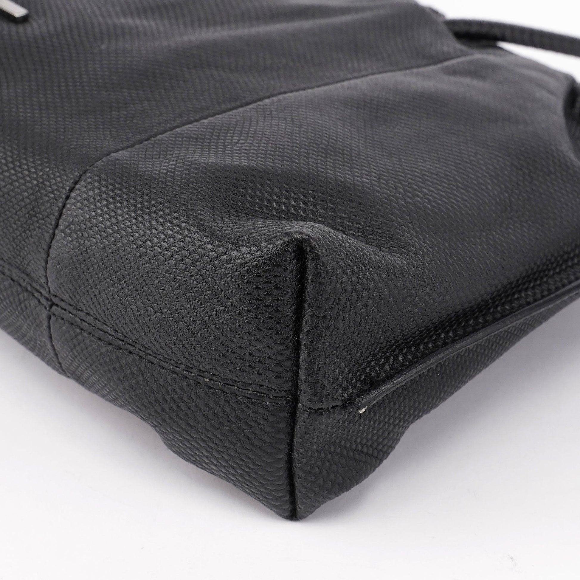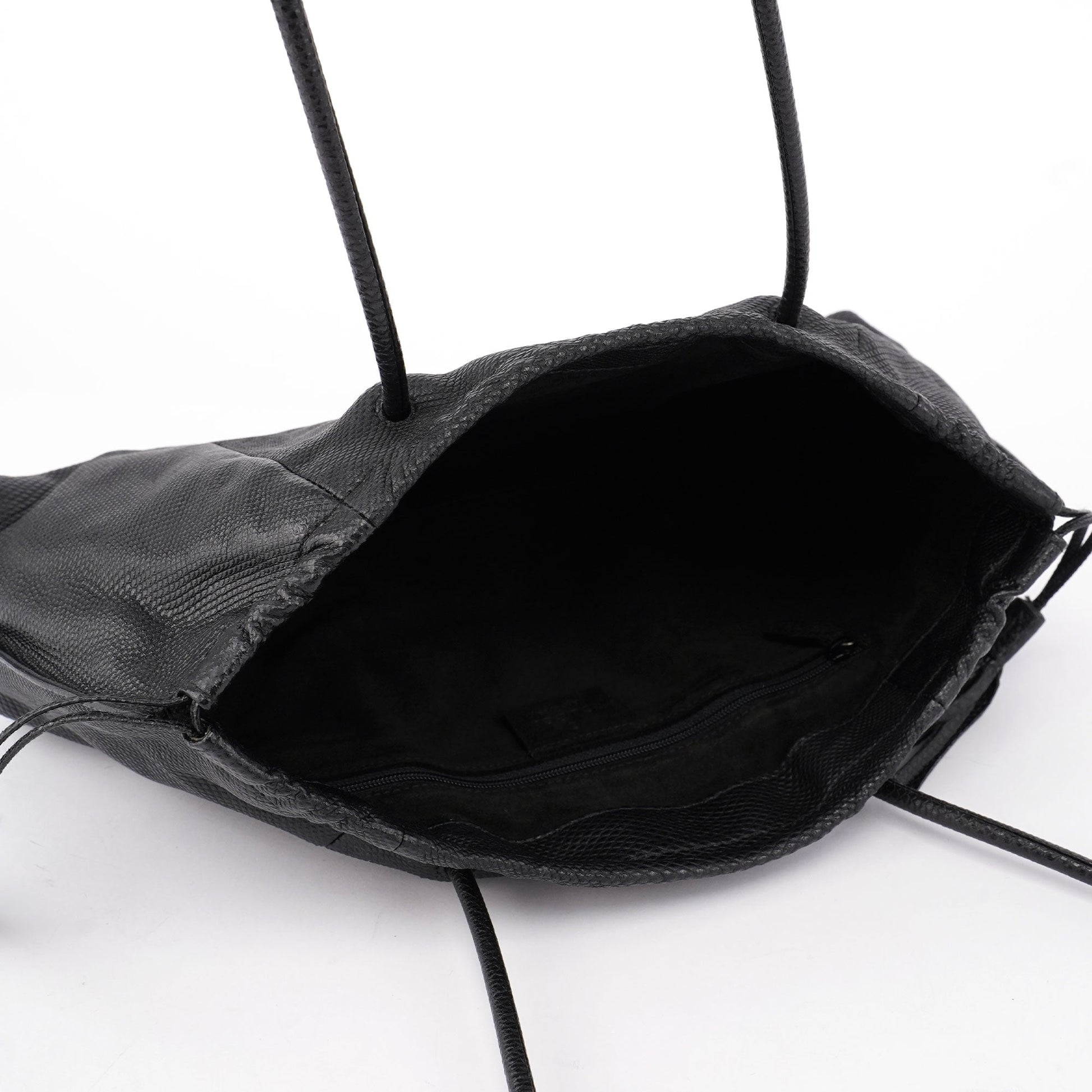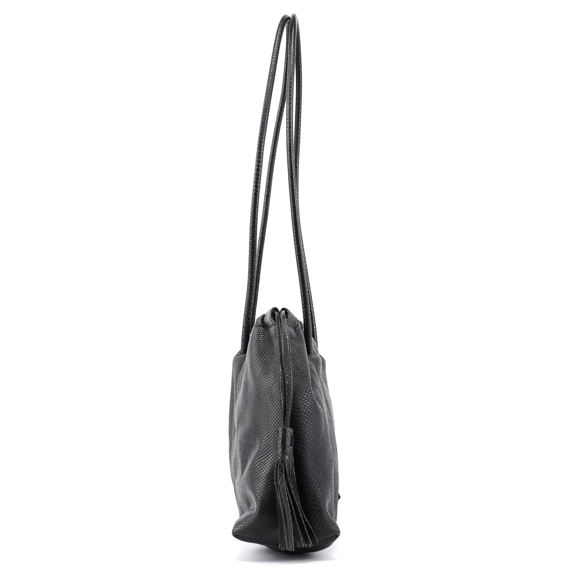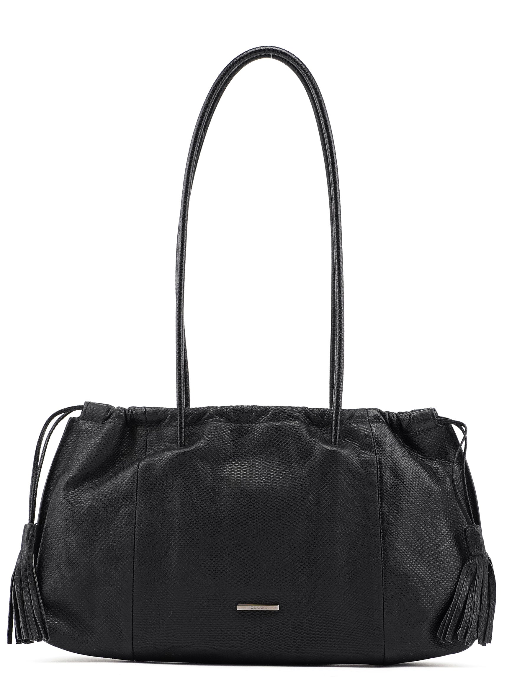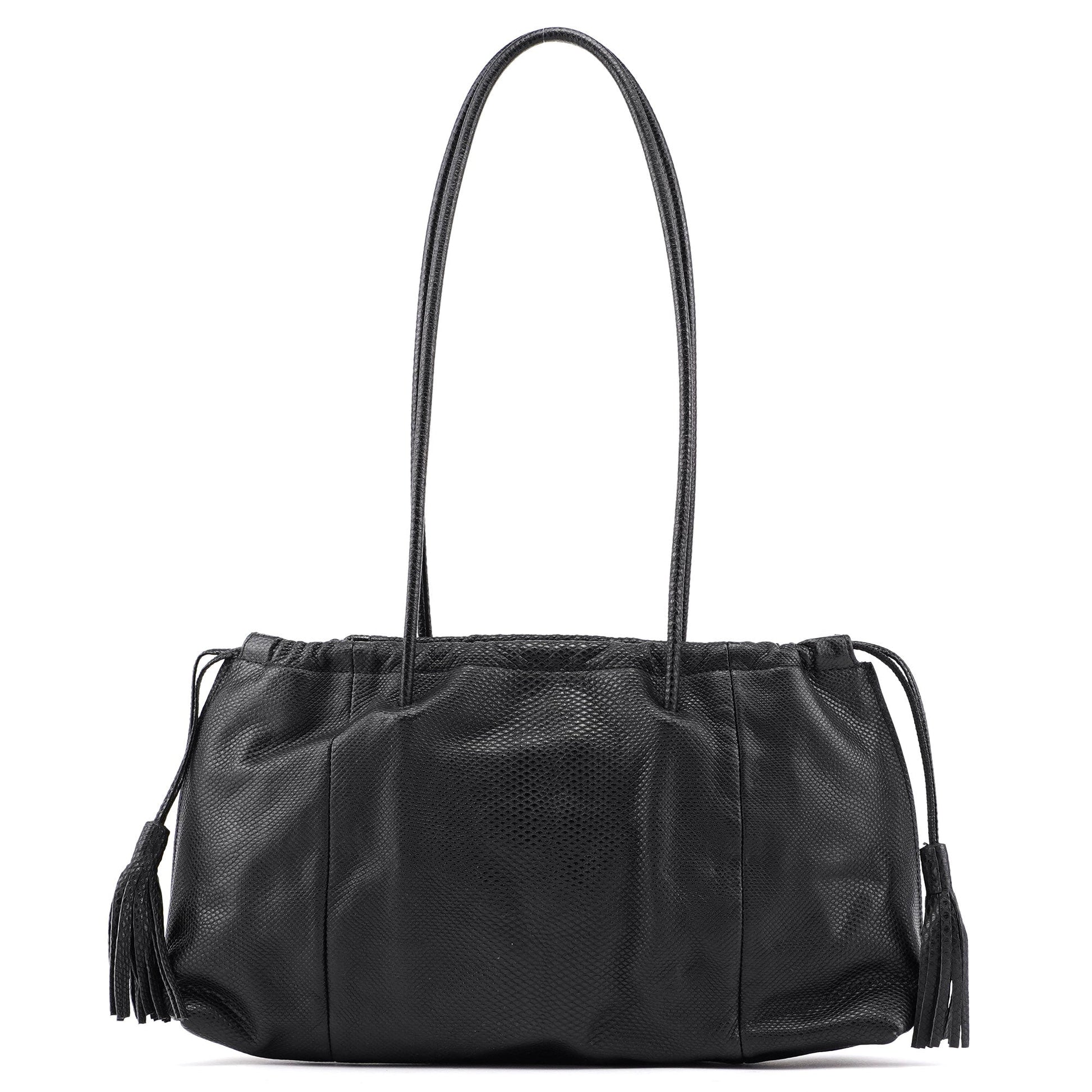 Discover the Gucci tote bag, designed by Tom Ford in the late 1990s. This sophisticated piece is handcrafted from black lizard-embossed leather and features a drawstring closure. The interior is lined in suede with an interior zipper pocket for secure storage. A Gucci logo plate at the front adds a refined finishing touch.