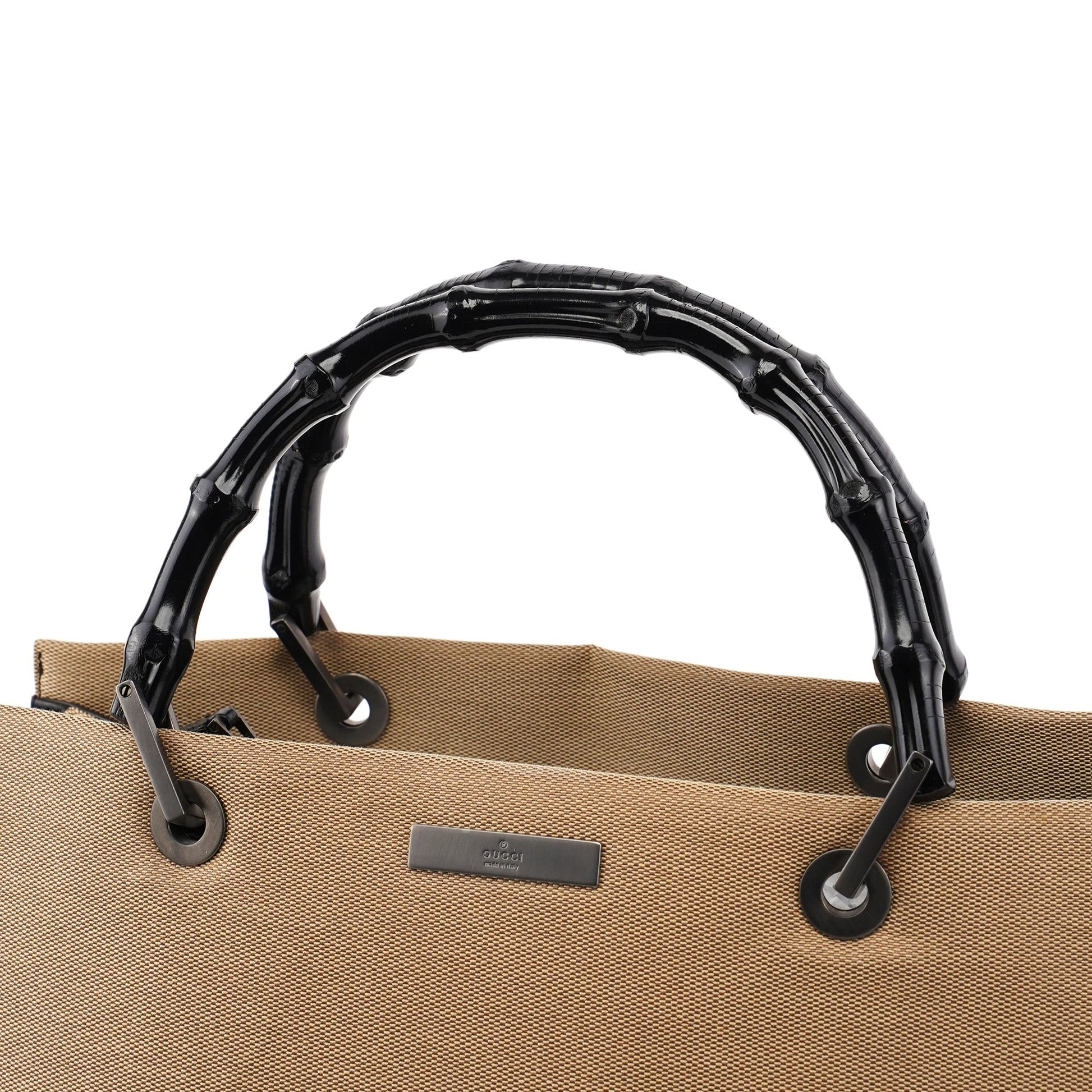 Designed by Tom Ford in the late 1990s, this Gucci Bamboo bag is handcrafted from beige canvas with black bamboo handles. It features matte grey hardware, three compartments, one with a zipper closure, and a satin-lined interior with an interior zipper pocket. The Gucci logo plate adorns the front, showcasing timeless elegance.