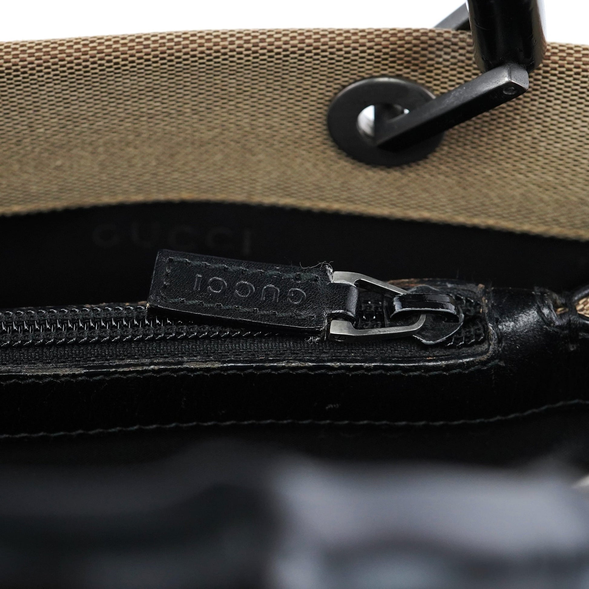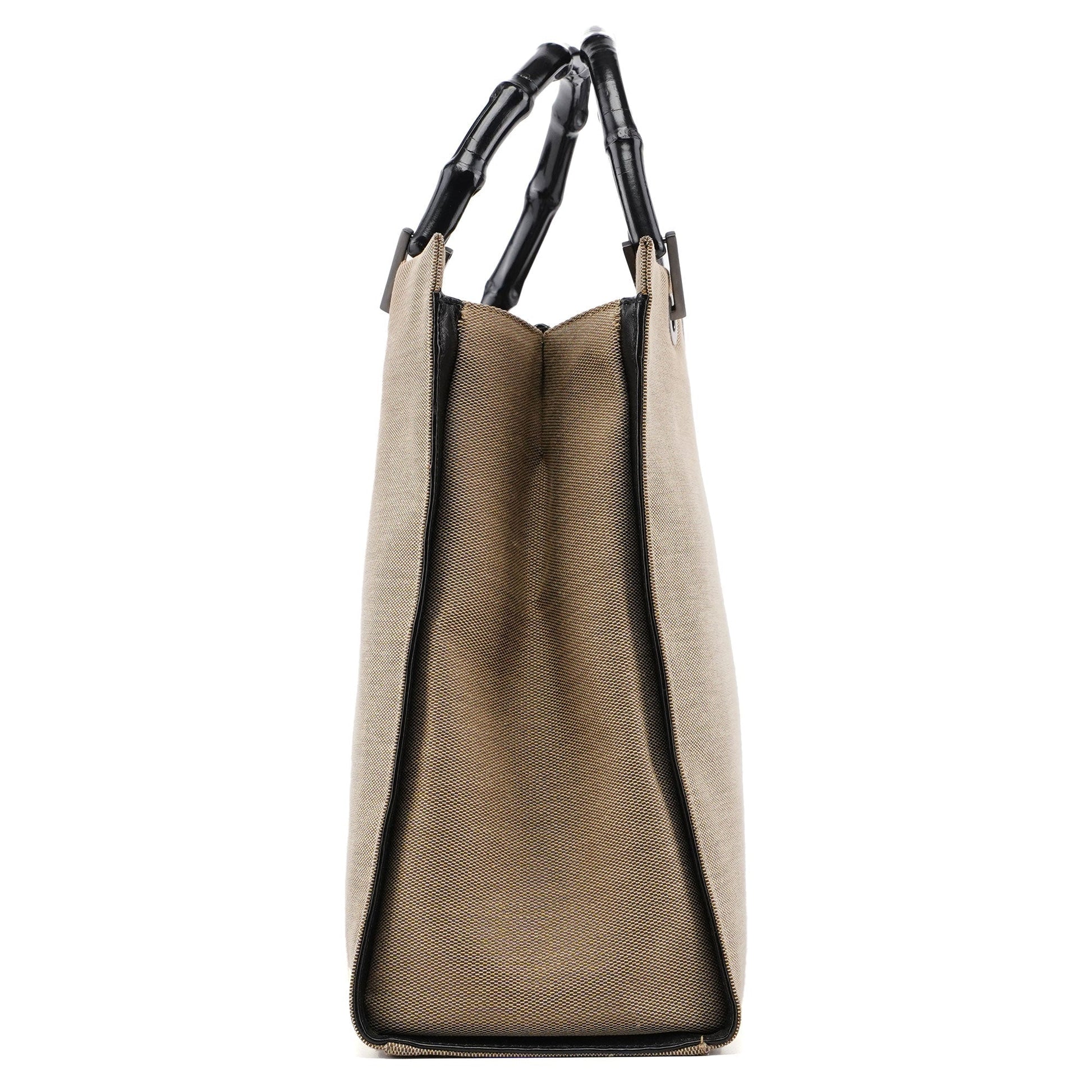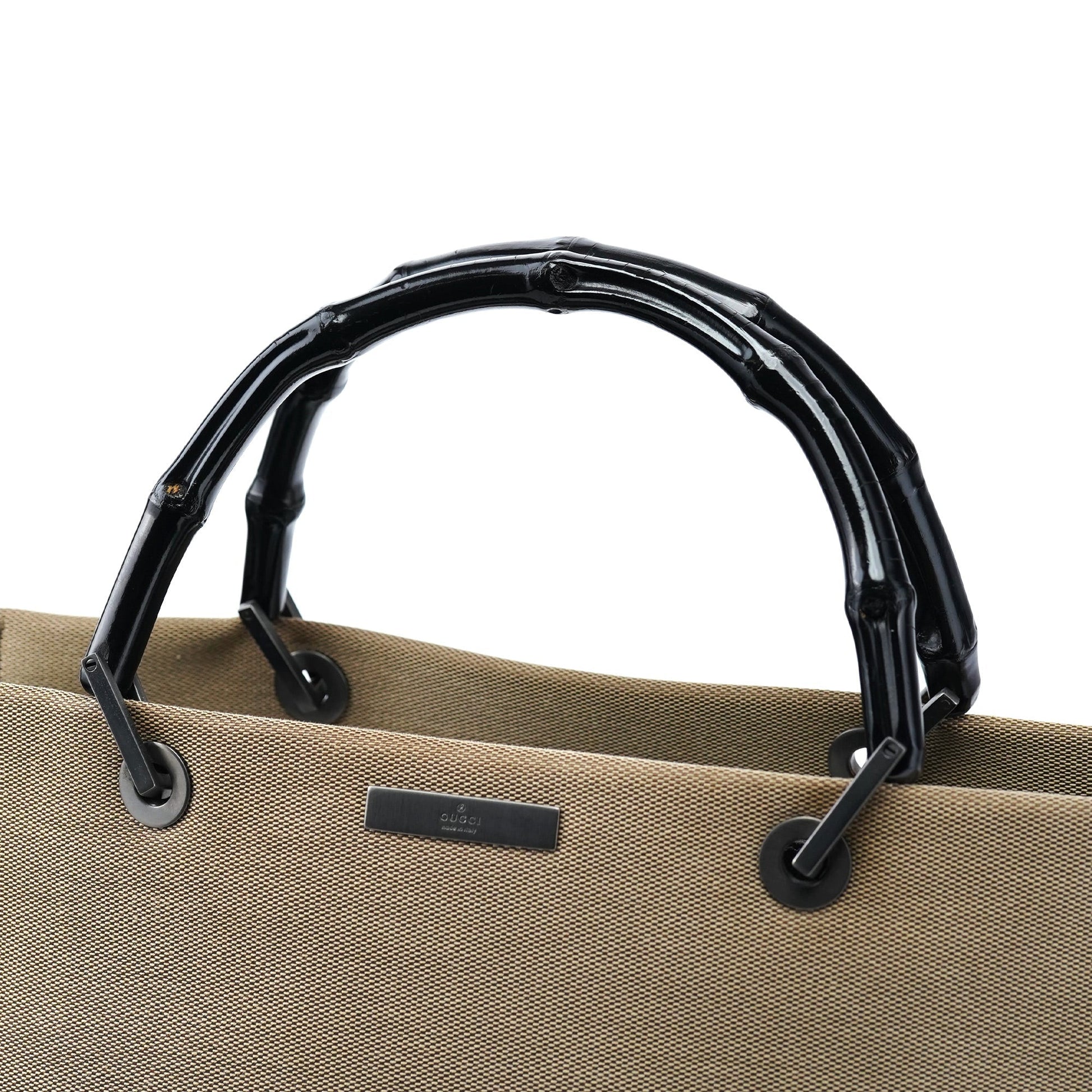 Designed by Tom Ford in the late 1990s, this Gucci Bamboo bag is handcrafted from beige canvas with two classic gloss black bamboo handles. It features matte grey hardware, three compartments, one with a zipper closure, and a satin-lined interior with an interior zipper pocket. The Gucci logo plate adorns the front, showcasing timeless elegance.