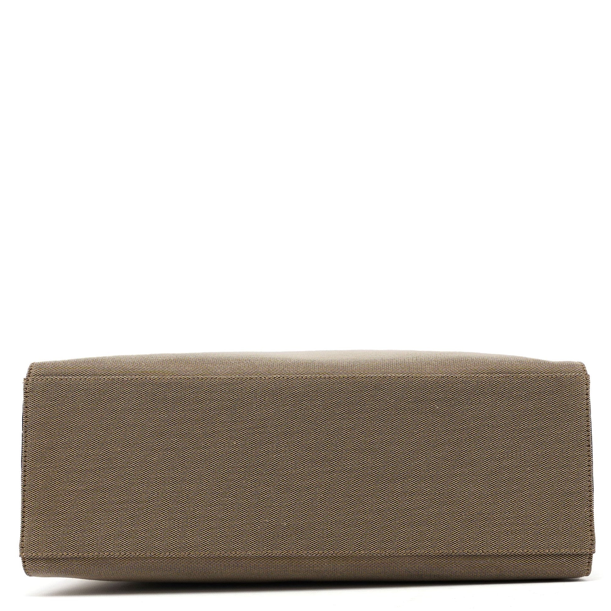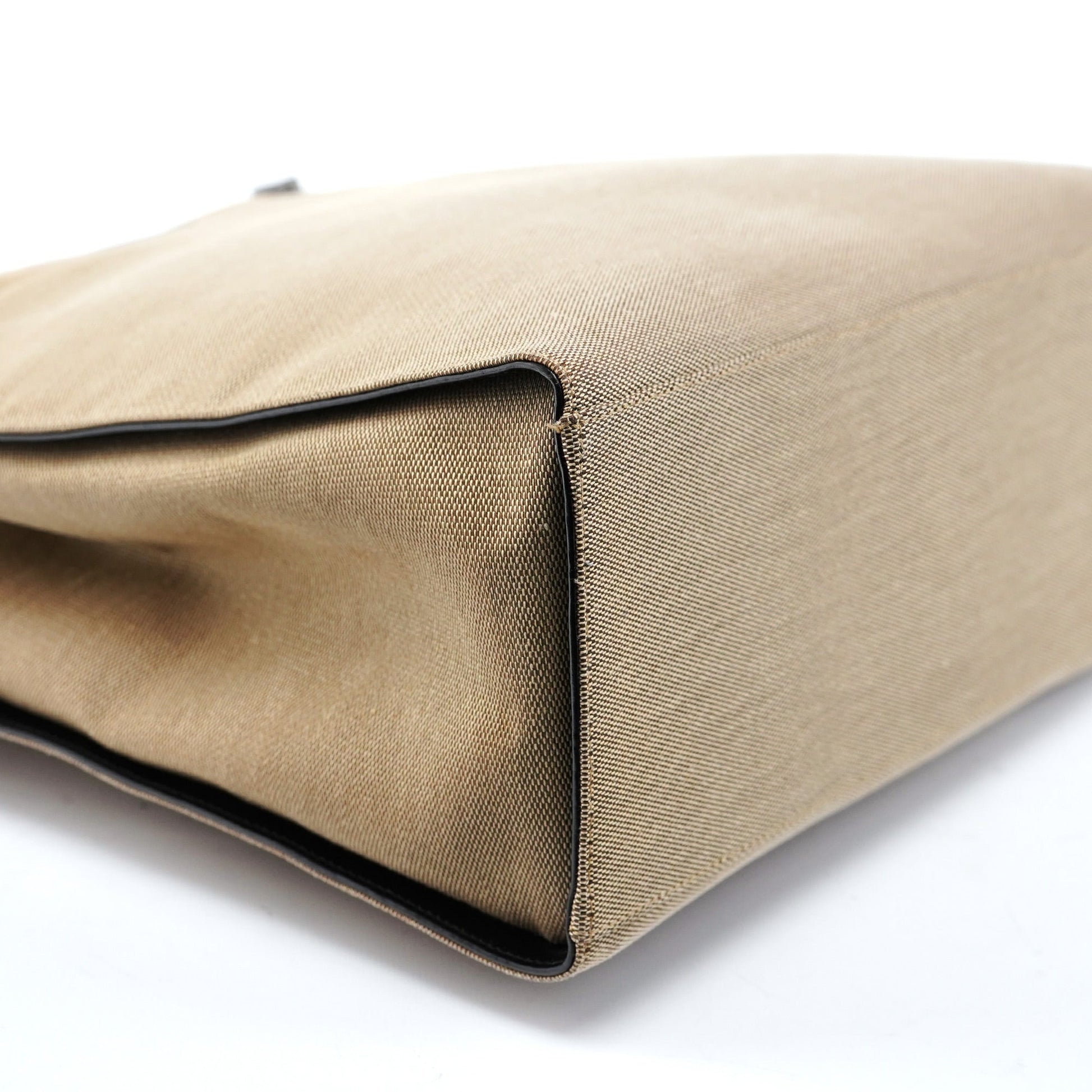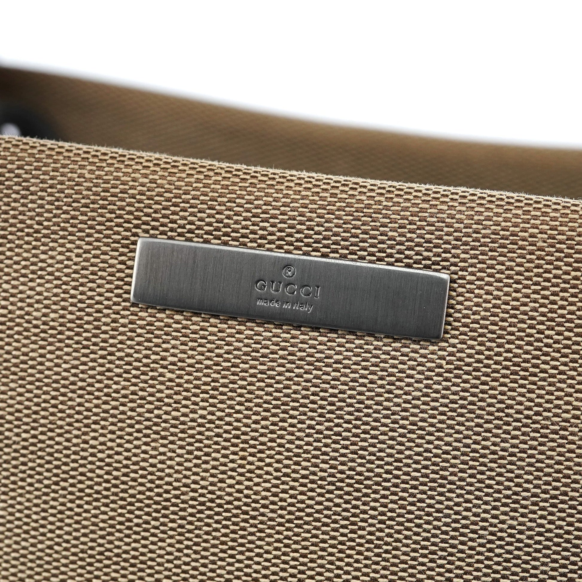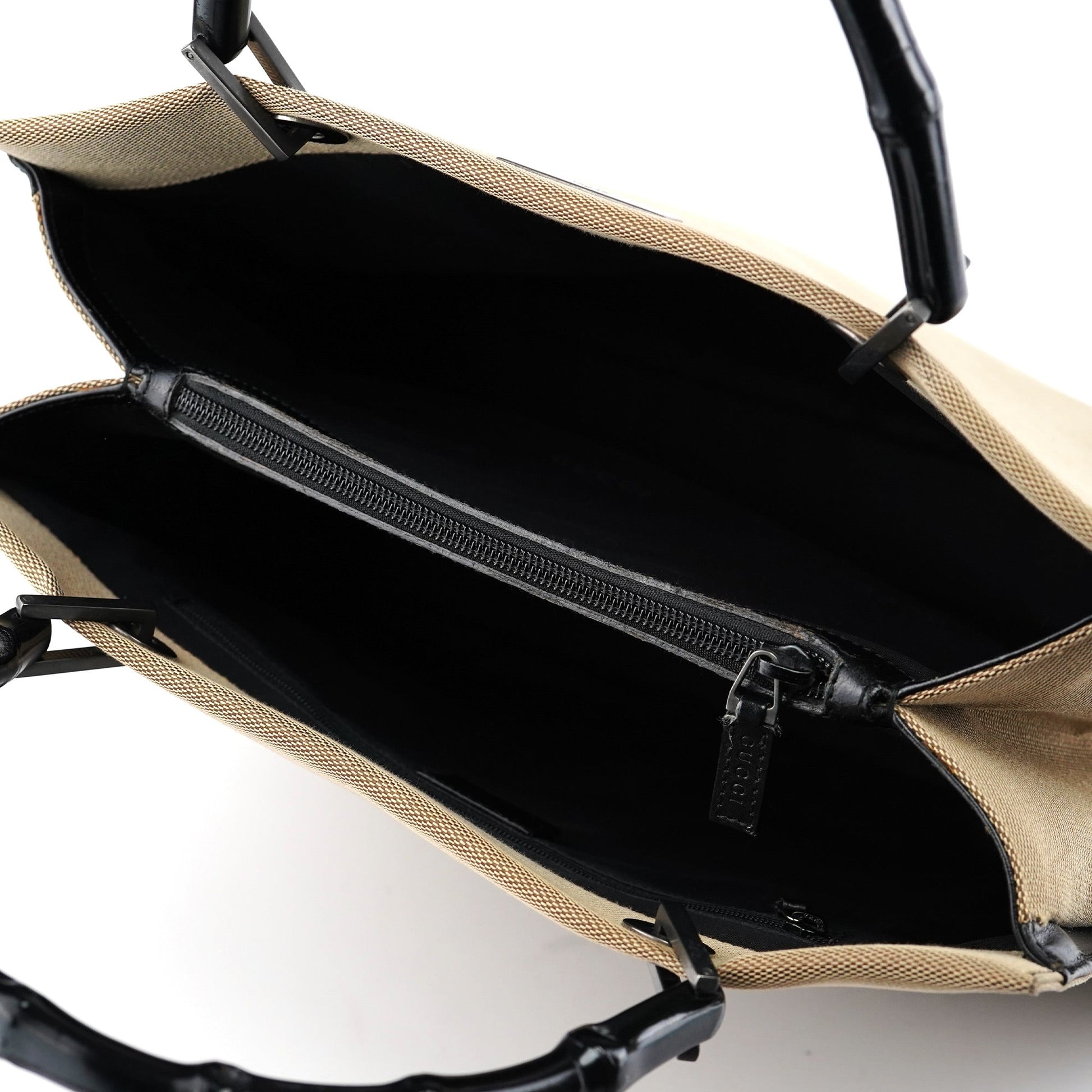 Designed by Tom Ford in the late 1990s, this Gucci Bamboo bag is handcrafted from beige canvas with two classic gloss black bamboo handles. It features matte grey hardware, three compartments, one with a zipper closure, and a satin-lined interior with an interior zipper pocket. The Gucci logo plate adorns the front, showcasing timeless elegance.