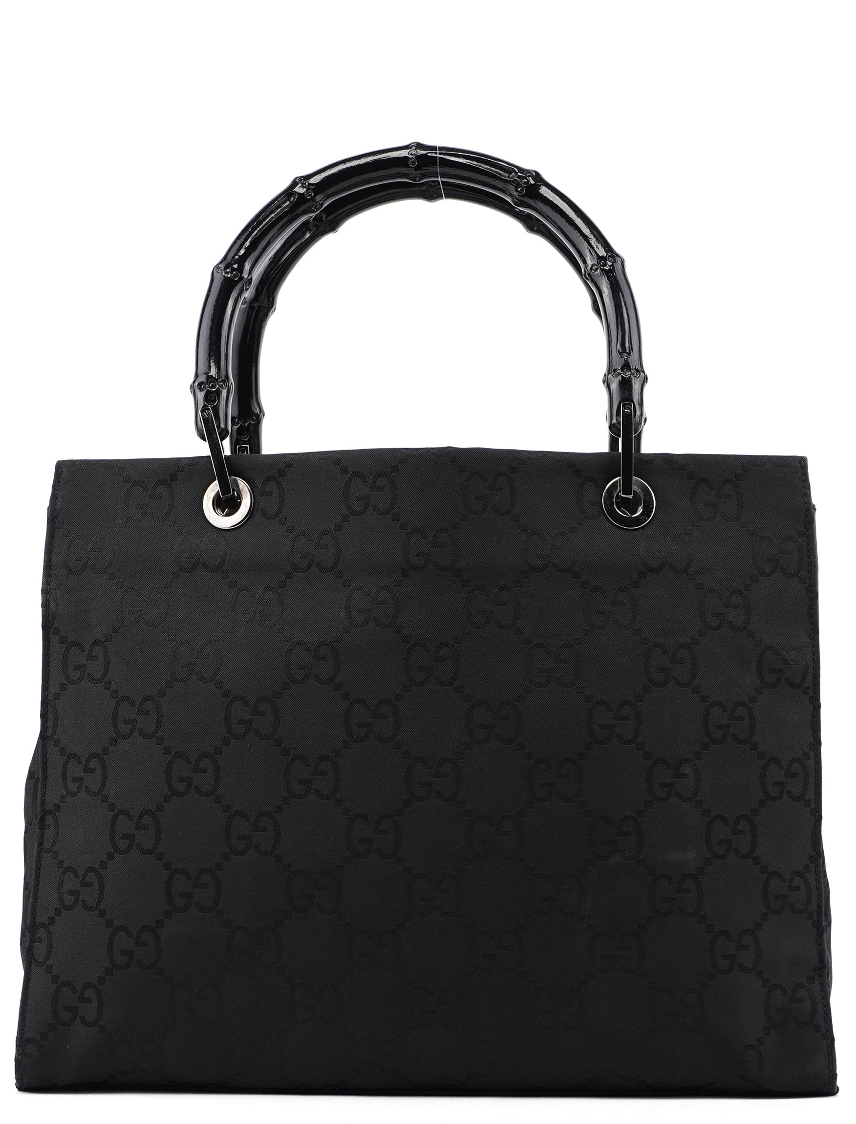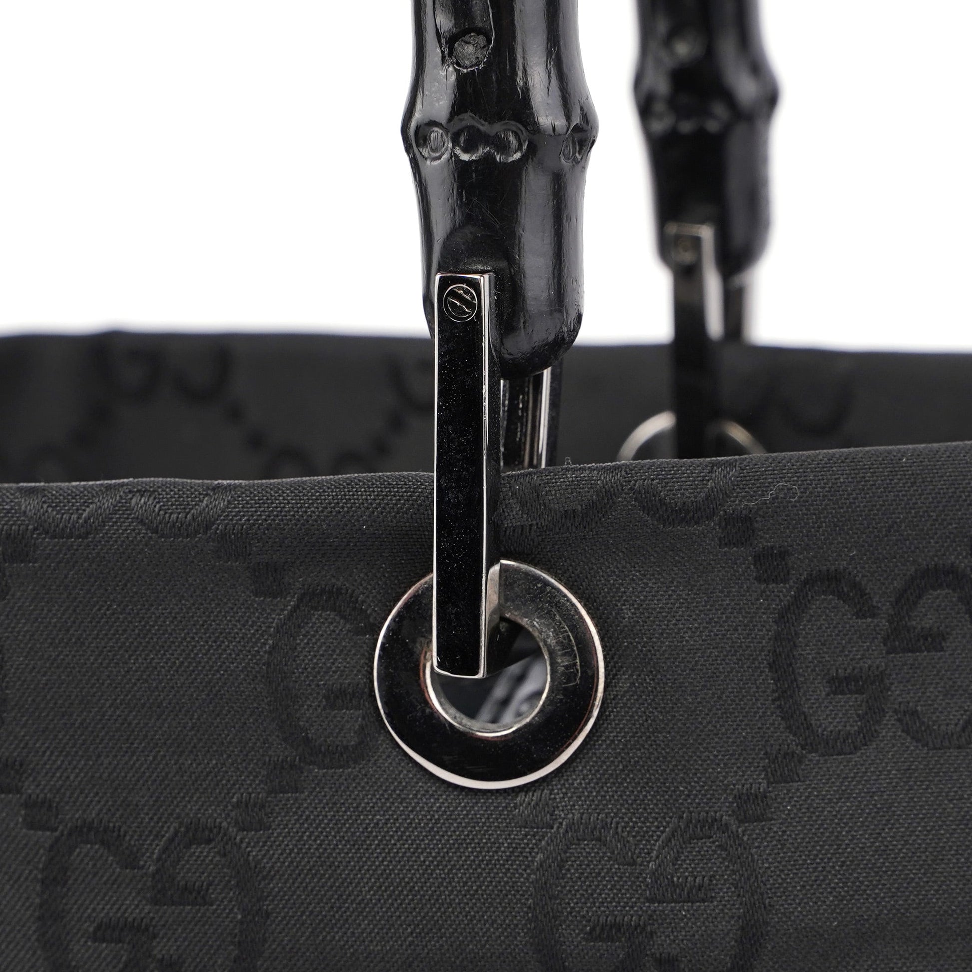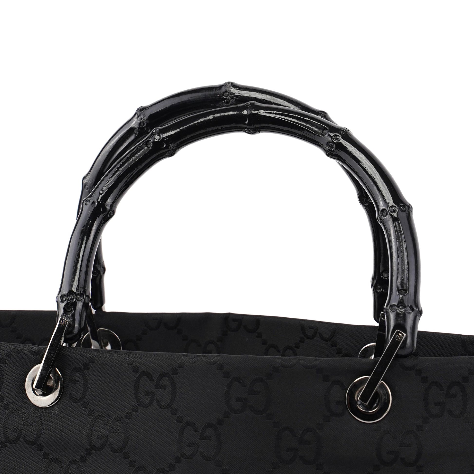 Designed by Tom Ford in the late 1990s, this Gucci Bamboo GG tote bag features two bamboo handles and silver-tone hardware. Crafted with the iconic GG monogram canvas, it offers three interior compartments lined with satin, including an interior zipper pocket for organized storage, blending luxurious design with practical functionality.