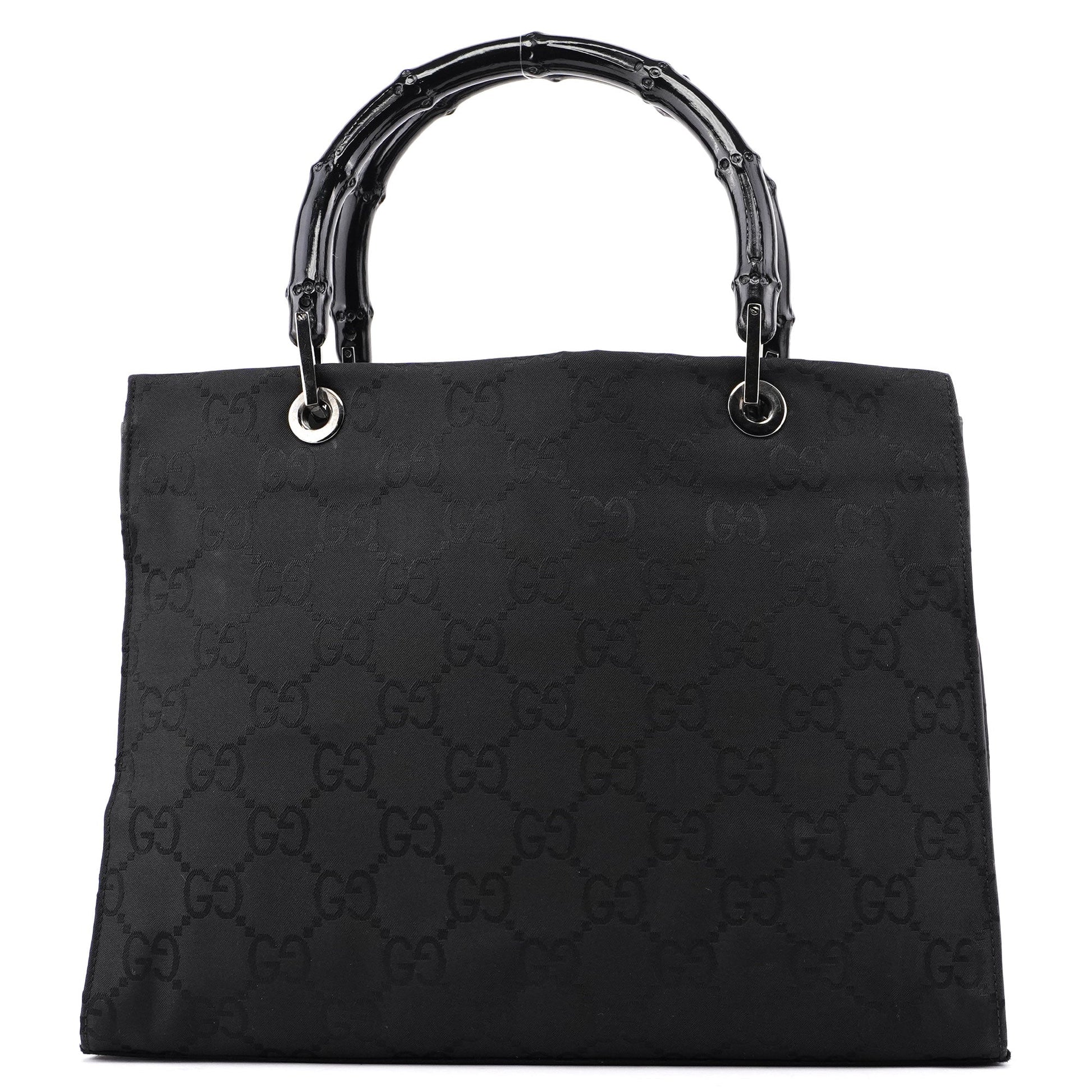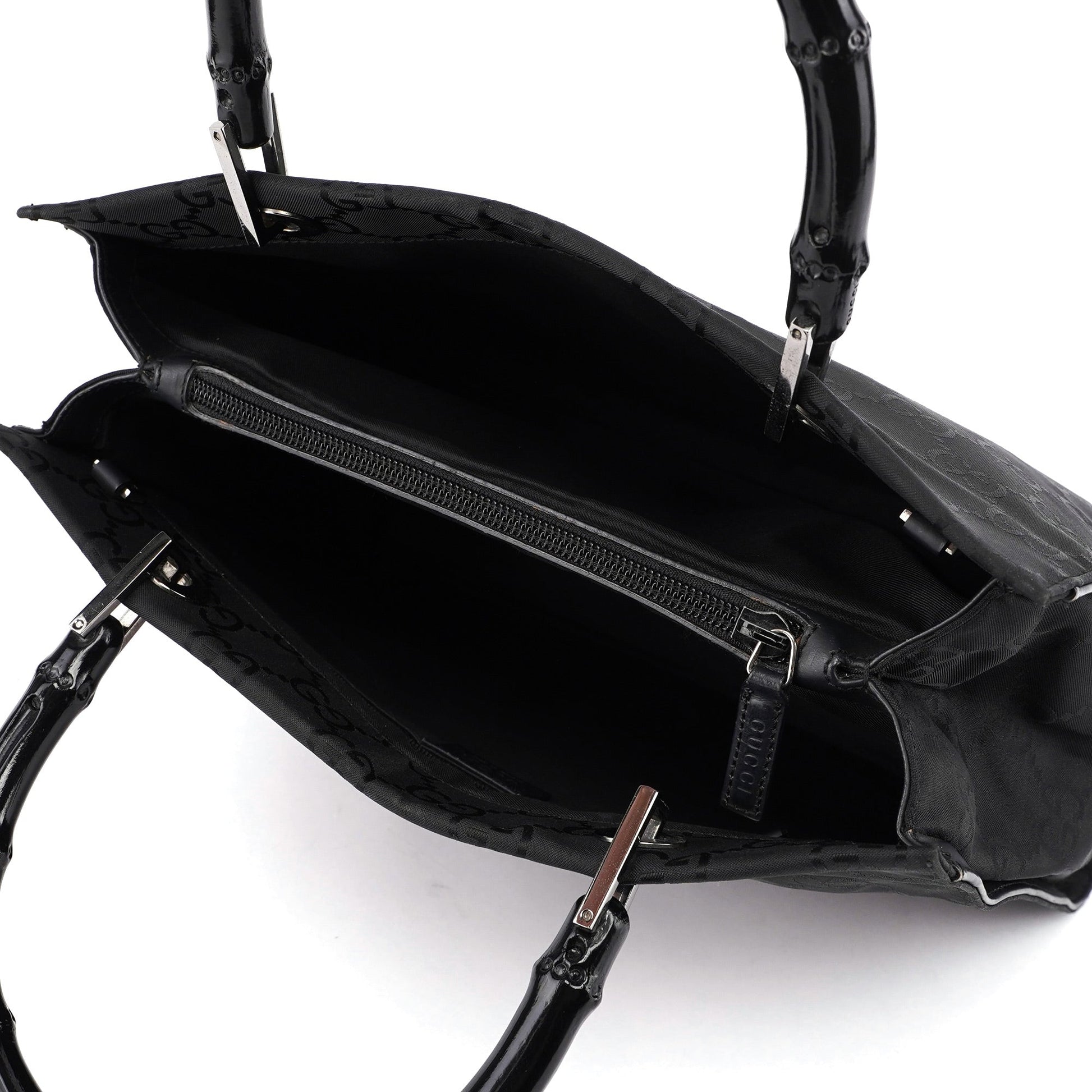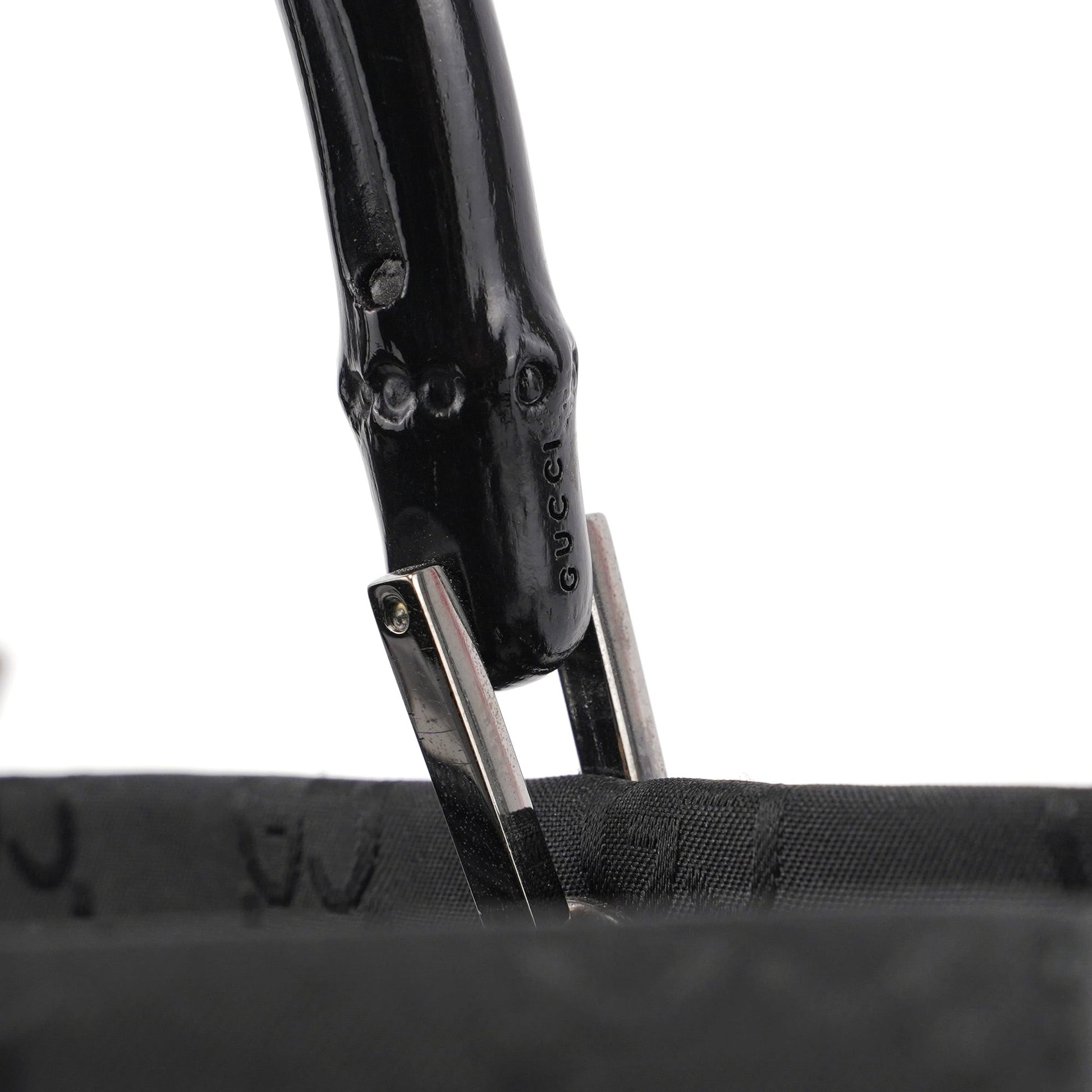 Designed by Tom Ford in the late 1990s, this Gucci Bamboo GG tote bag features two bamboo handles and silver-tone hardware. Crafted with the iconic GG monogram canvas, it offers three interior compartments lined with satin, including an interior zipper pocket for organized storage, blending luxurious design with practical functionality.