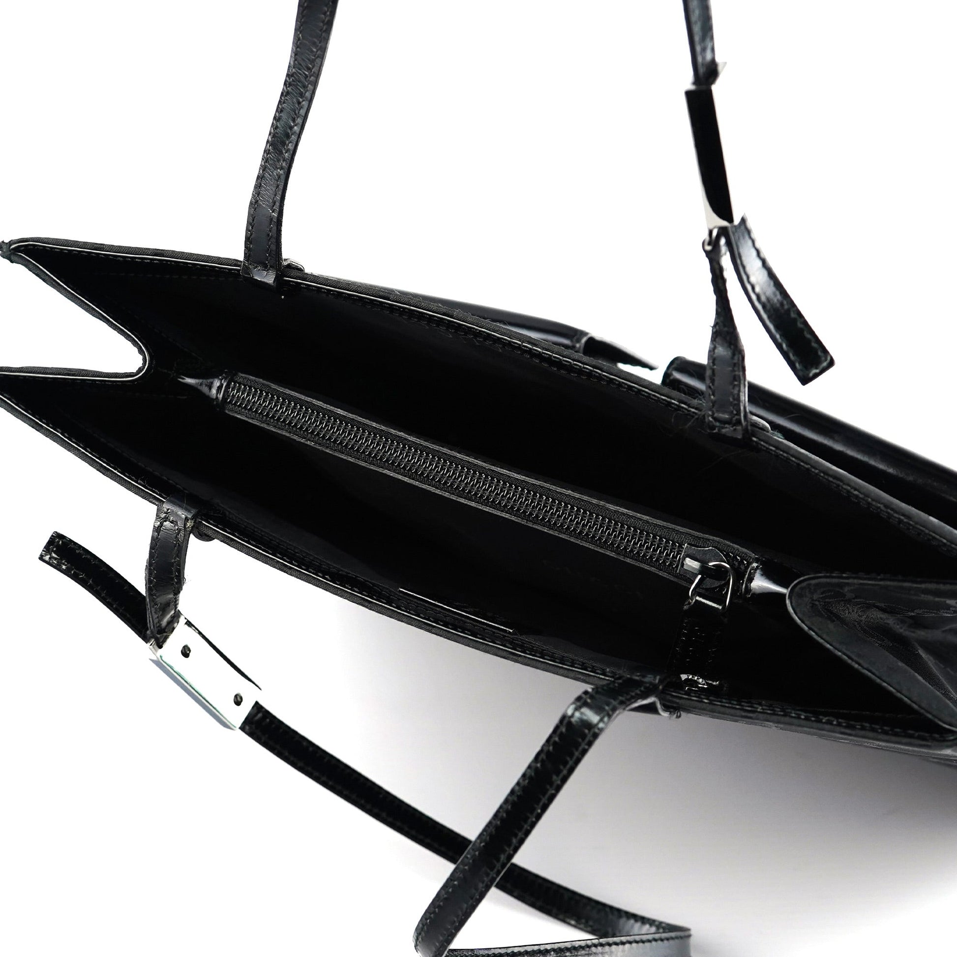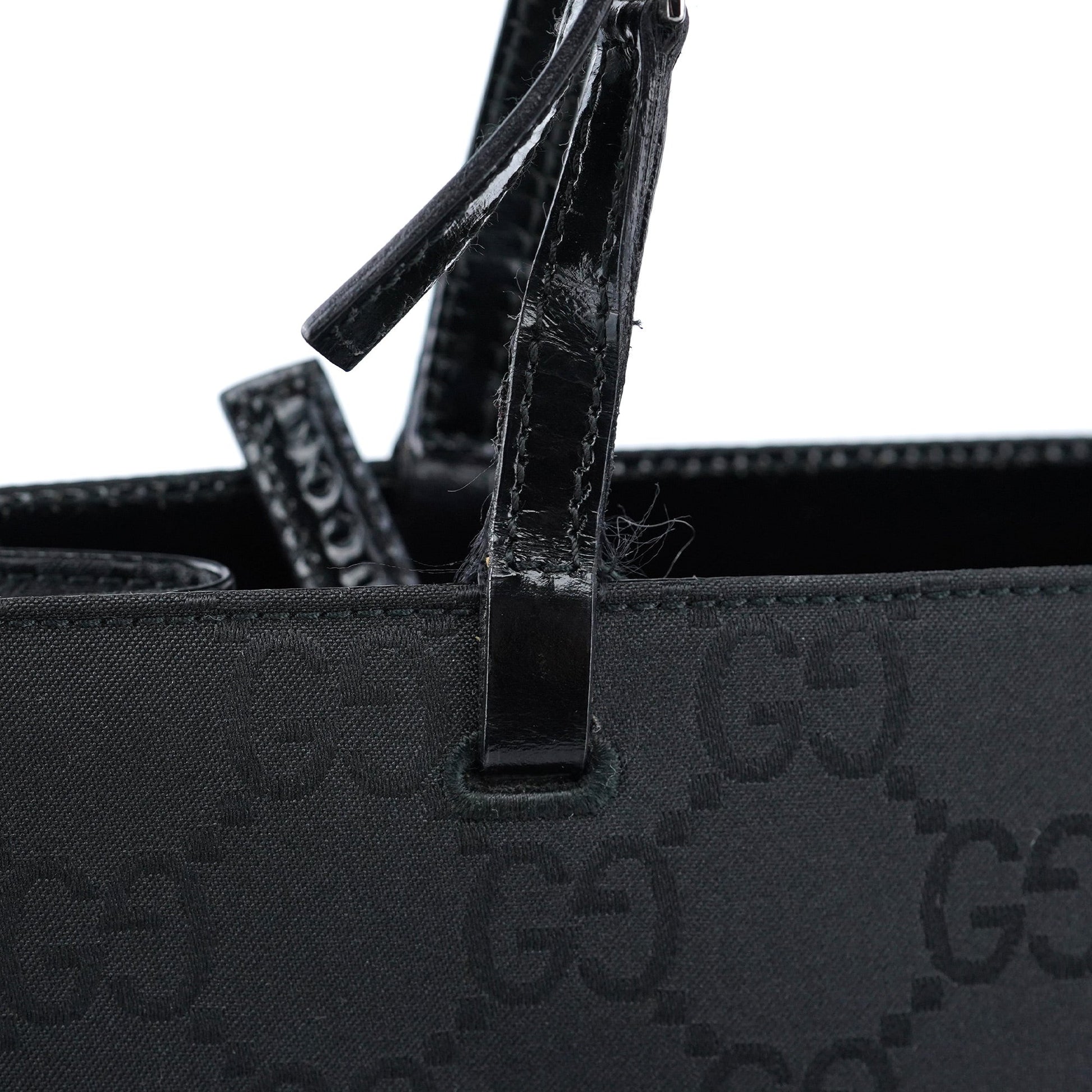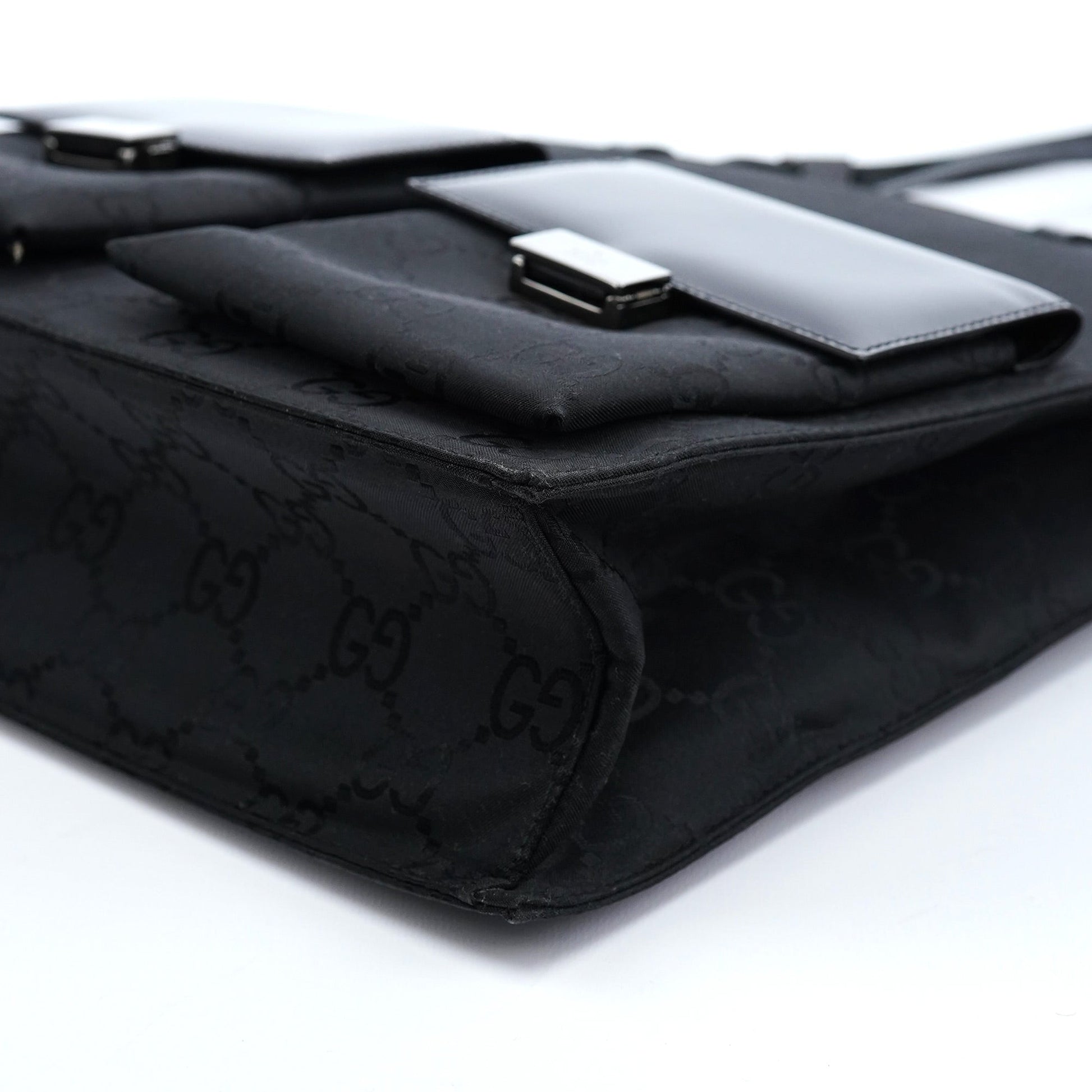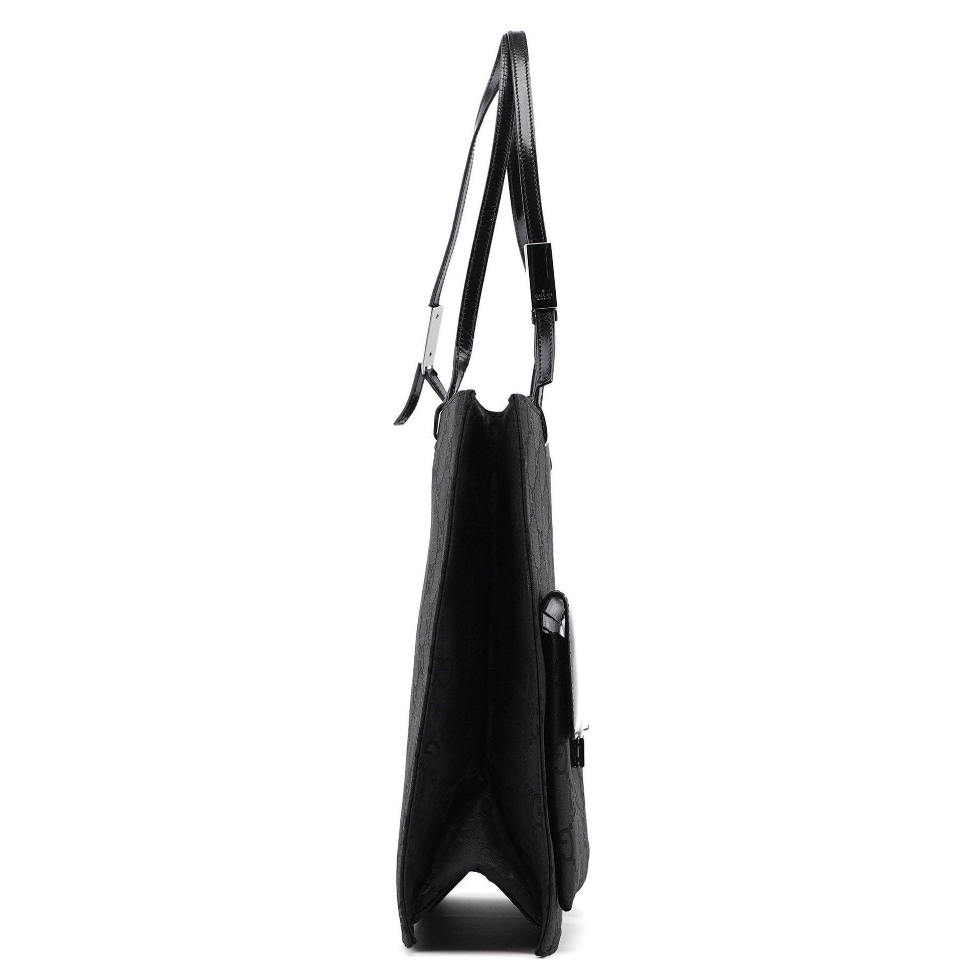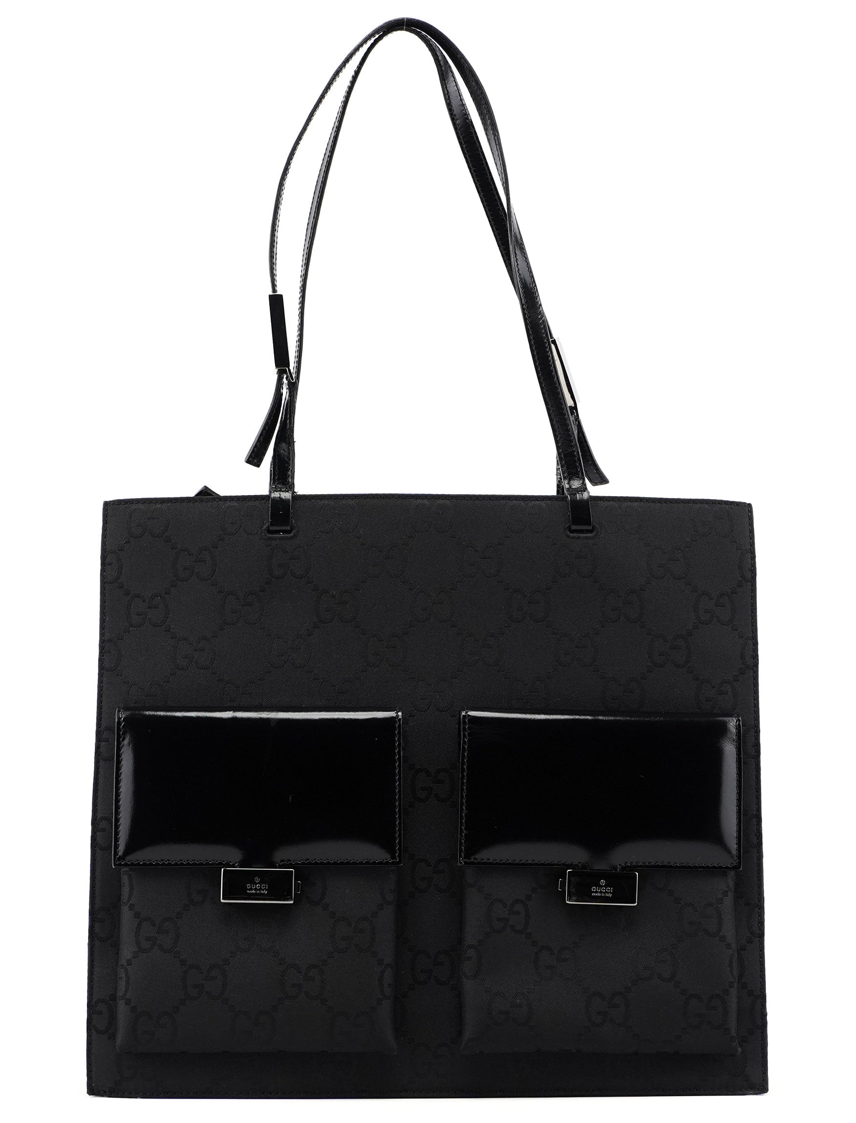 Discover the Gucci GG tote bag, designed by Tom Ford in the late 1990s. Handcrafted in black GG monogram canvas with black leather trim, it features silver-tone hardware engraved with the Gucci logo. The bag offers two front pockets and three satin-lined interior compartments, one with a zipper closure, along with an additional interior zipper pocket for organized storage.