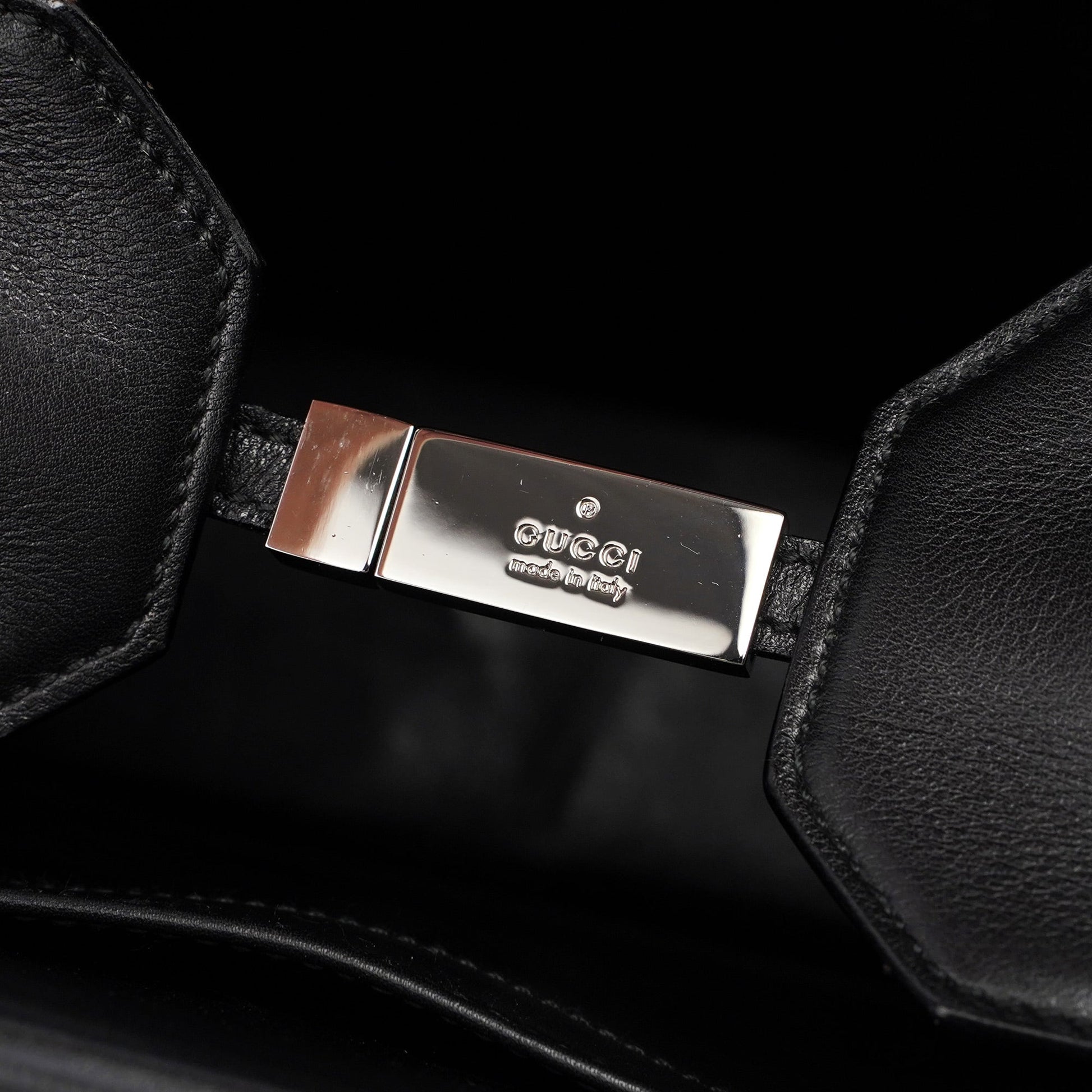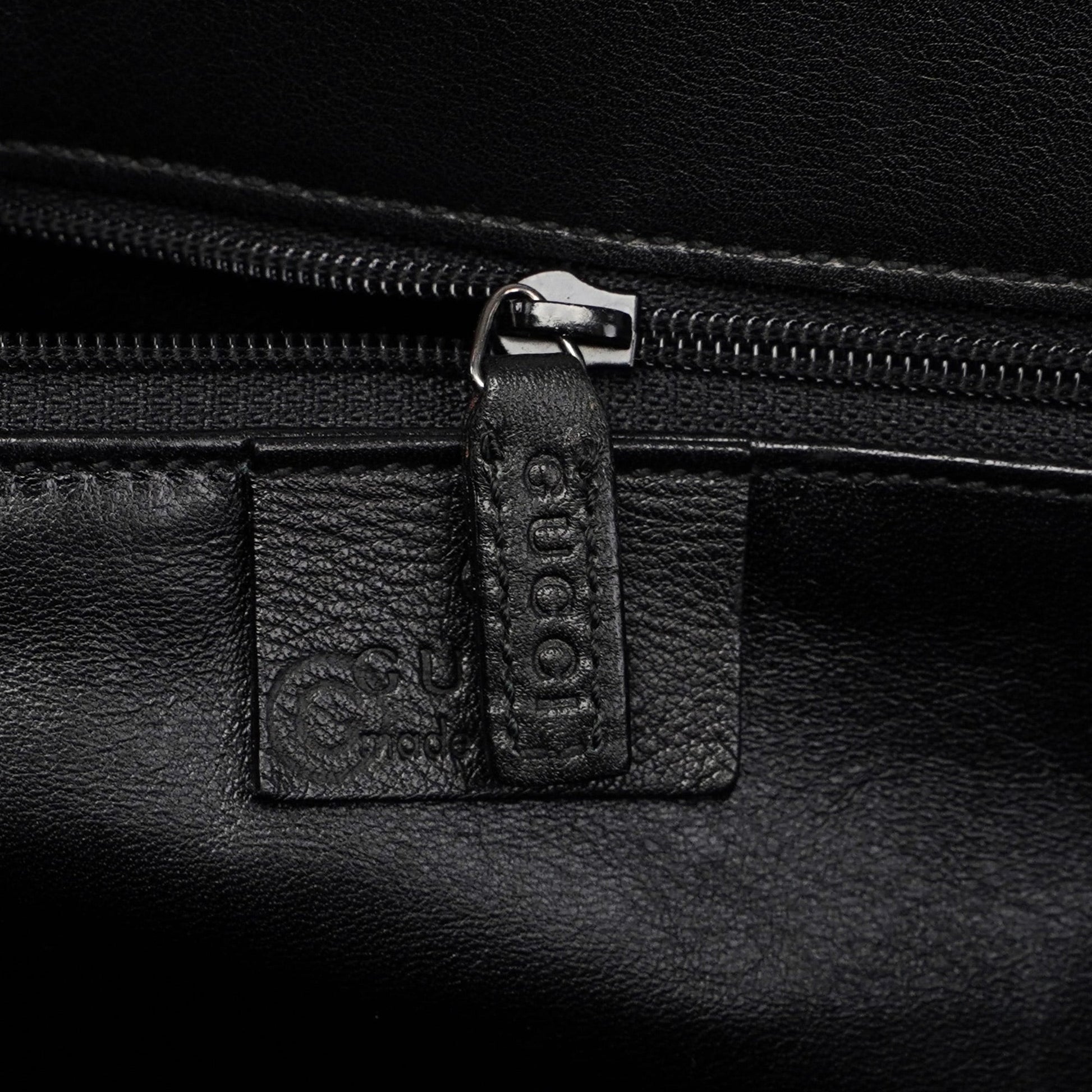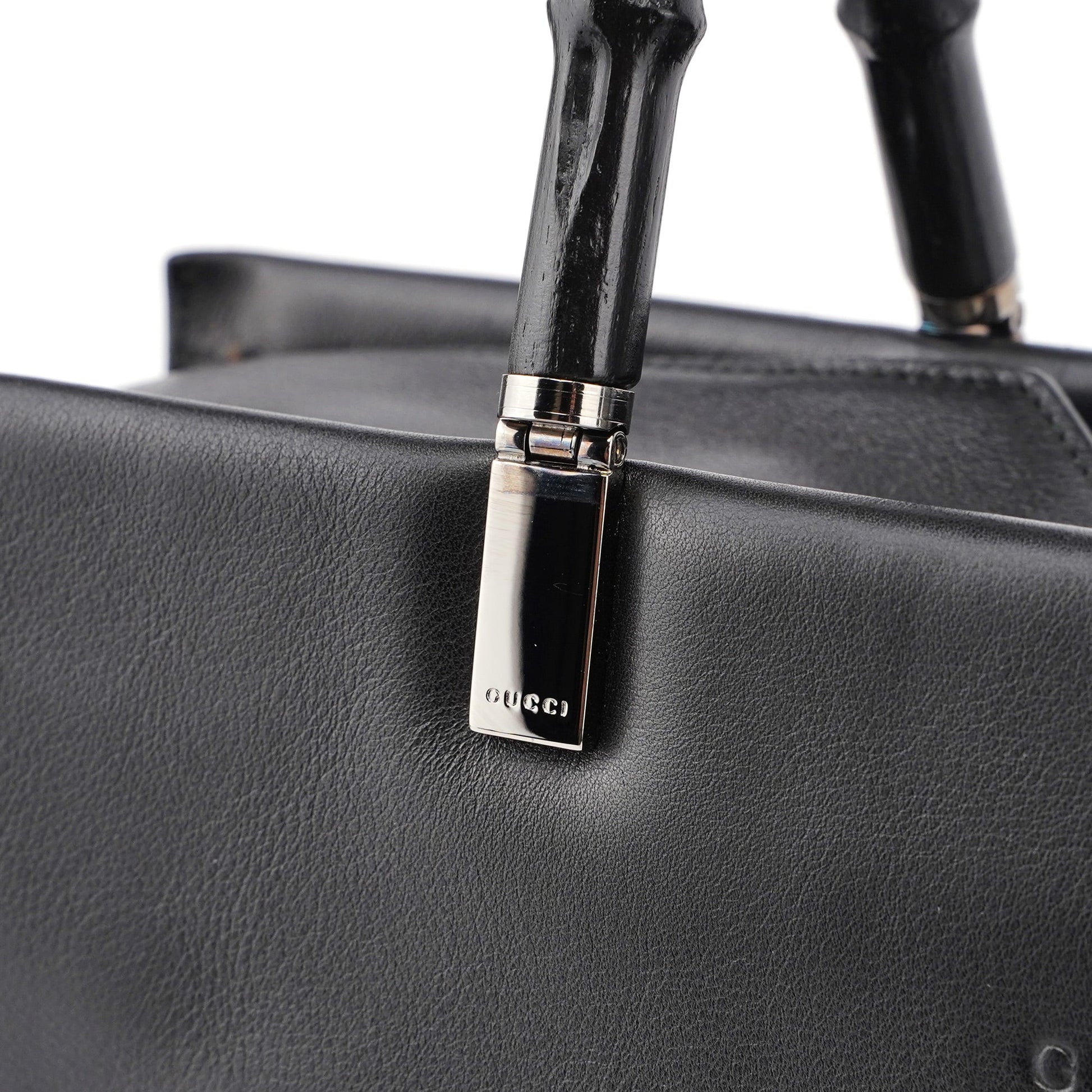 This Gucci Bamboo tote bag, a late 1990s design by Tom Ford, is crafted from black calfskin leather and silver-tone hardware with Gucci logo engraving. It features two gloss black bamboo handles and a crossbody strap. The bag's clip closure secures the contents, and the interior, lined with calfskin leather, includes two pockets for organization. The Gucci logo, embossed on the front adds a signature touch.