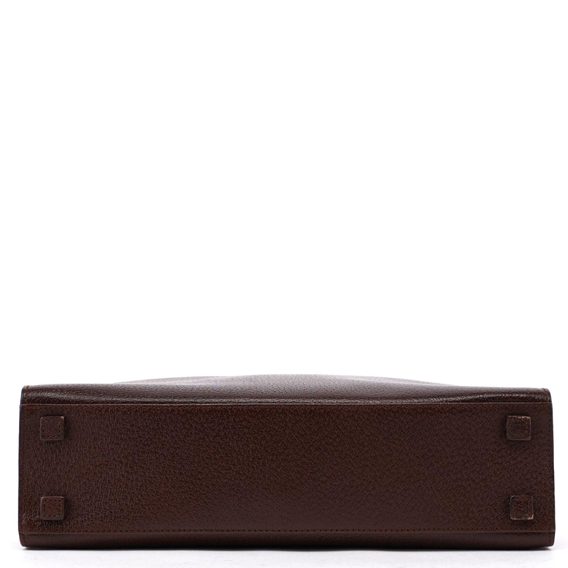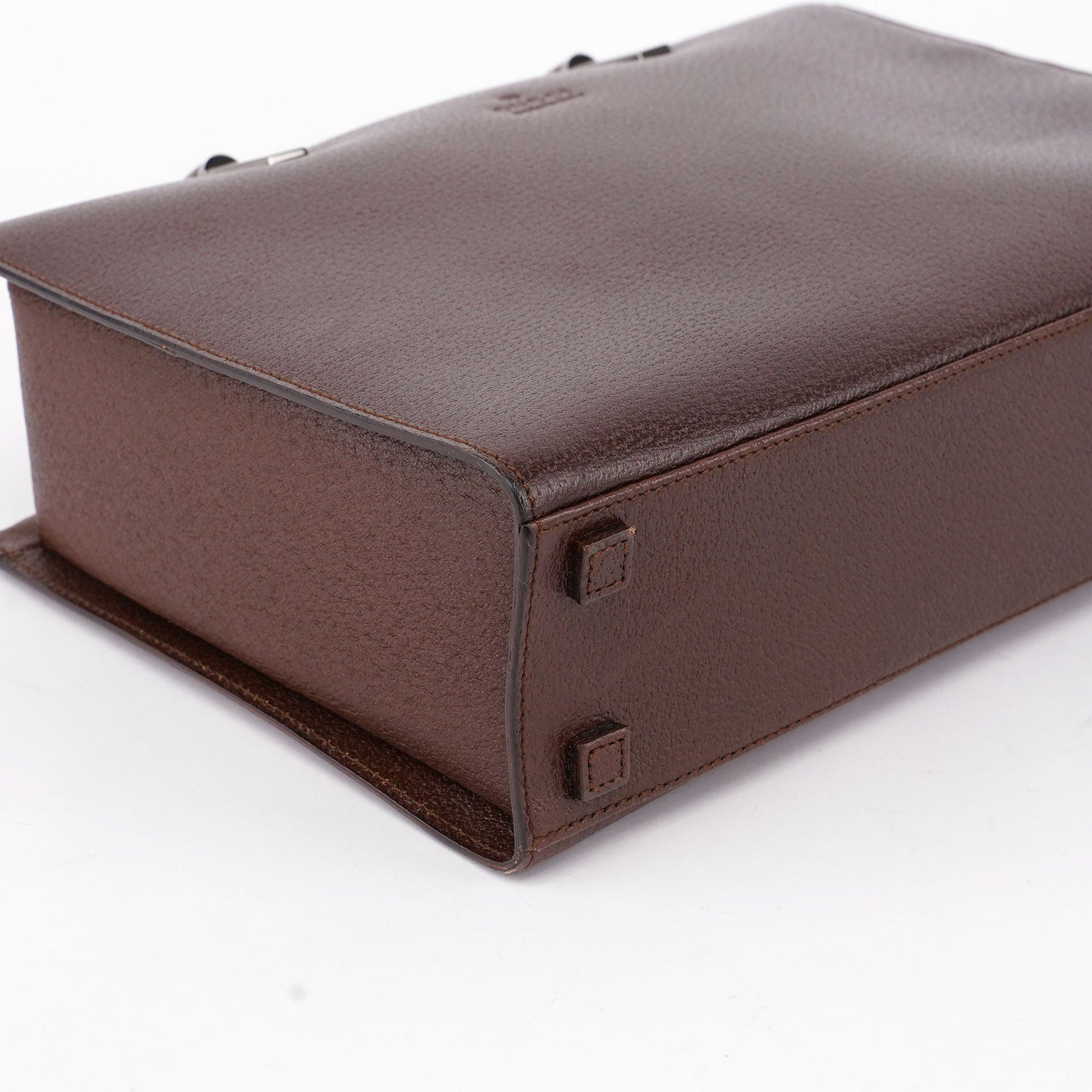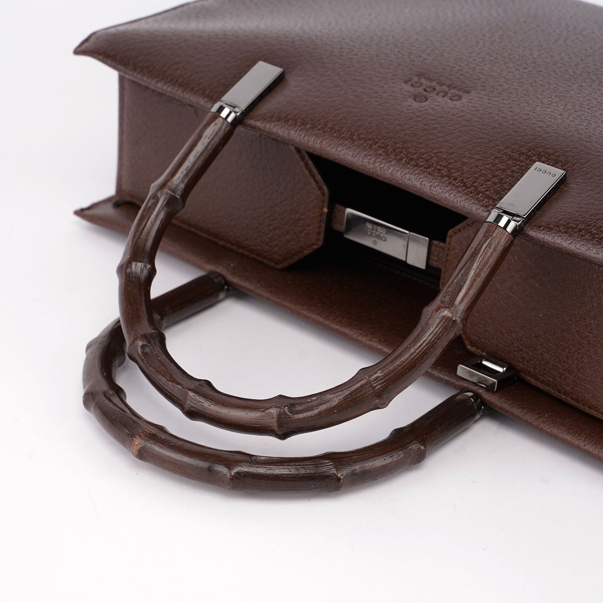 This Gucci Bamboo tote bag, a late 1990s design by Tom Ford, is handcrafted from brown leather and features silver-tone hardware with Gucci logo engraving. It boasts bamboo handles and a detachable body strap. The bag's clip closure secures the lined calfskin leather interior, which includes two pockets. The Gucci logo is embossed on the front.