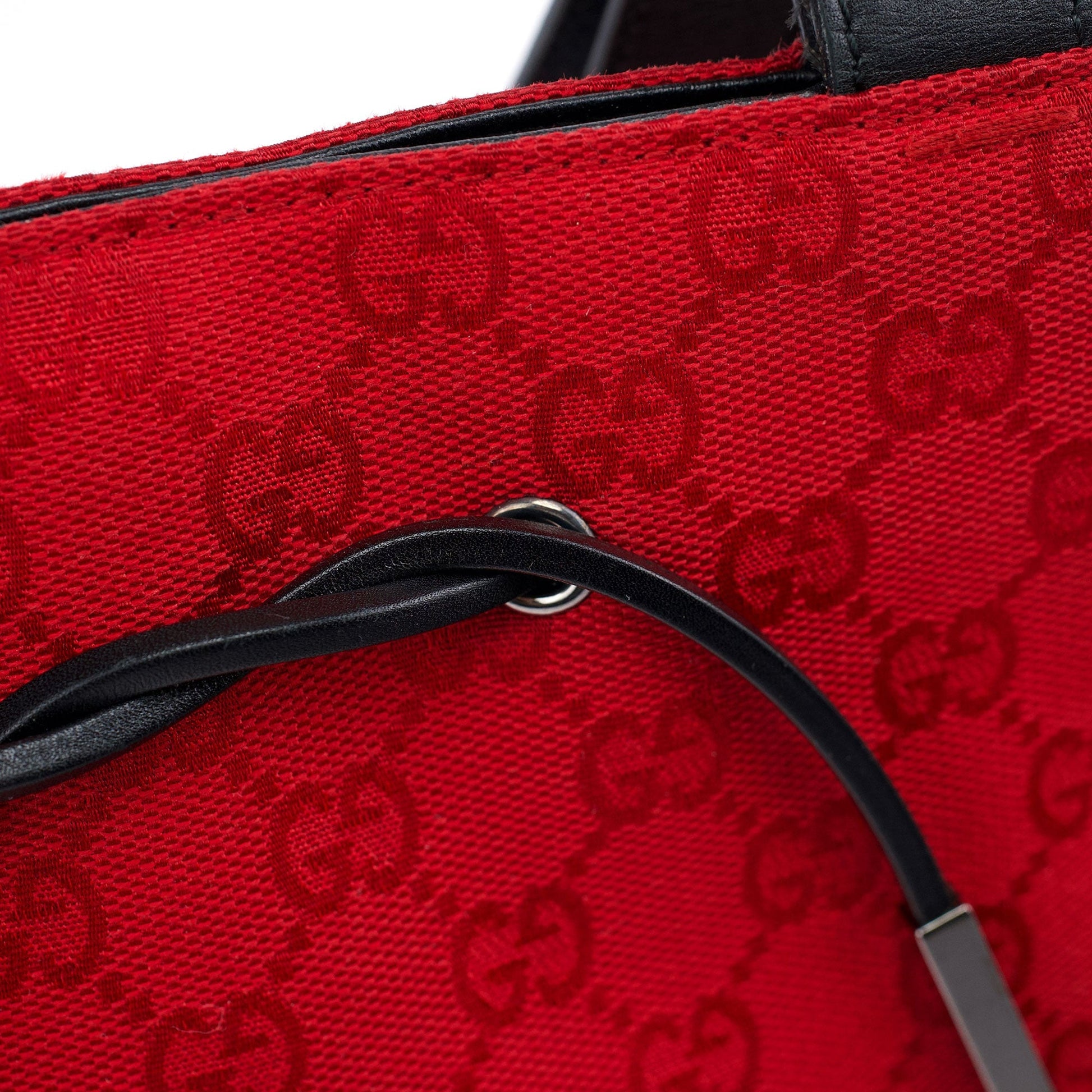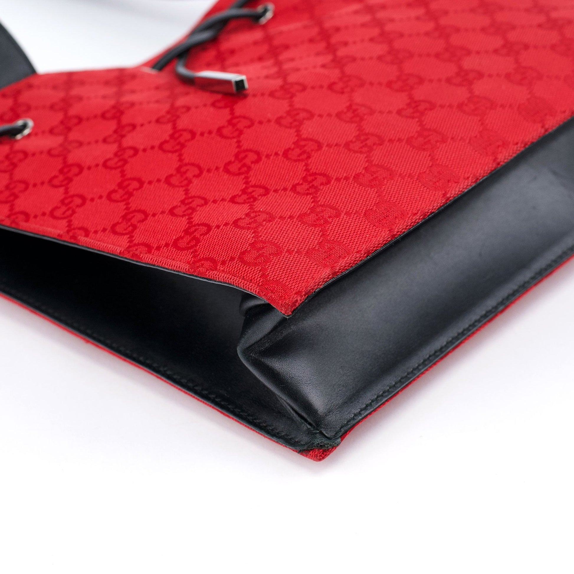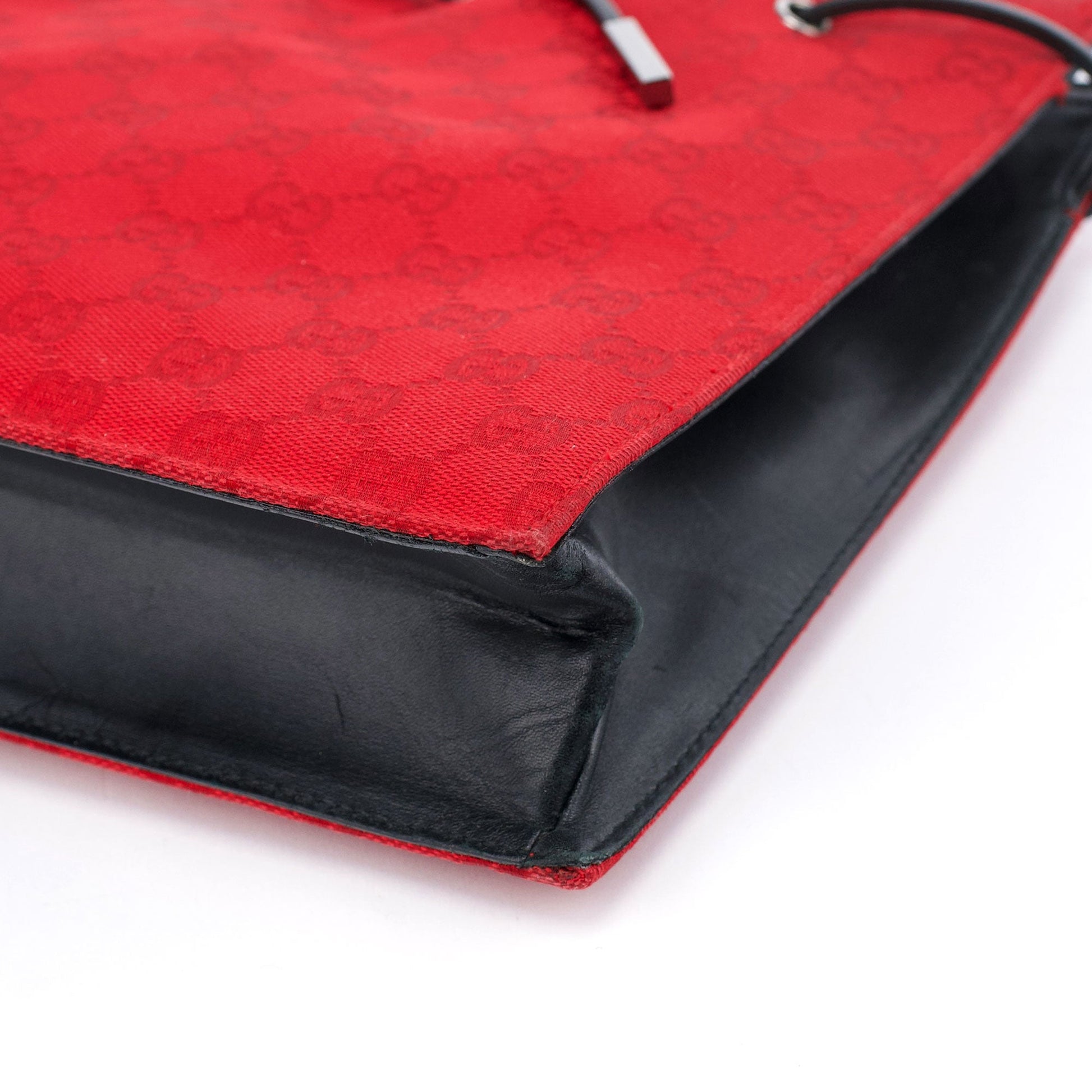 Designed by Tom Ford in the late 1990s, the Gucci GG Drawstring bag is handcrafted from red GG monogram canvas with black calfskin leather trim and silver-tone hardware. It features a drawstring closure for easy access, while the cotton-lined interior includes a zipper pocket for organization.