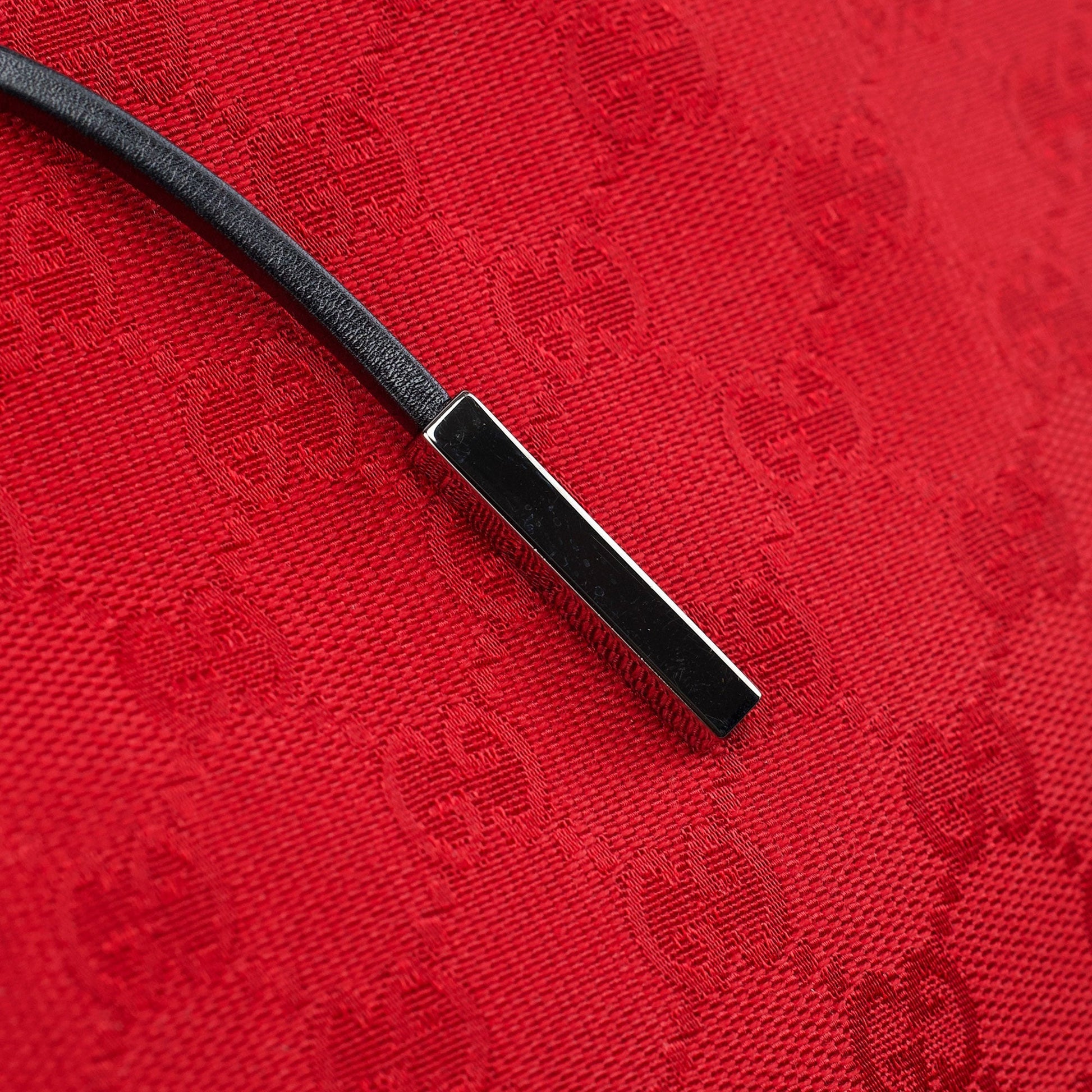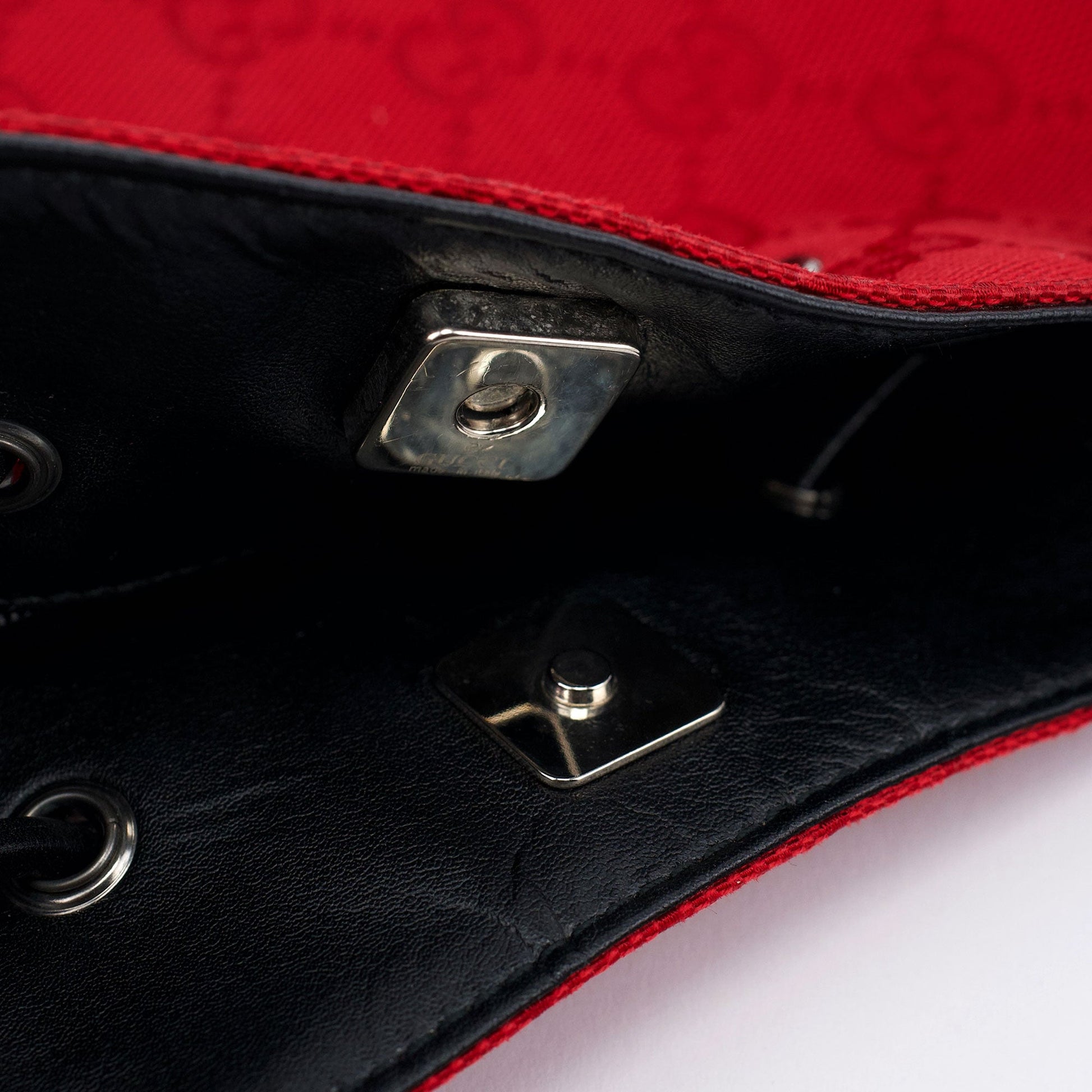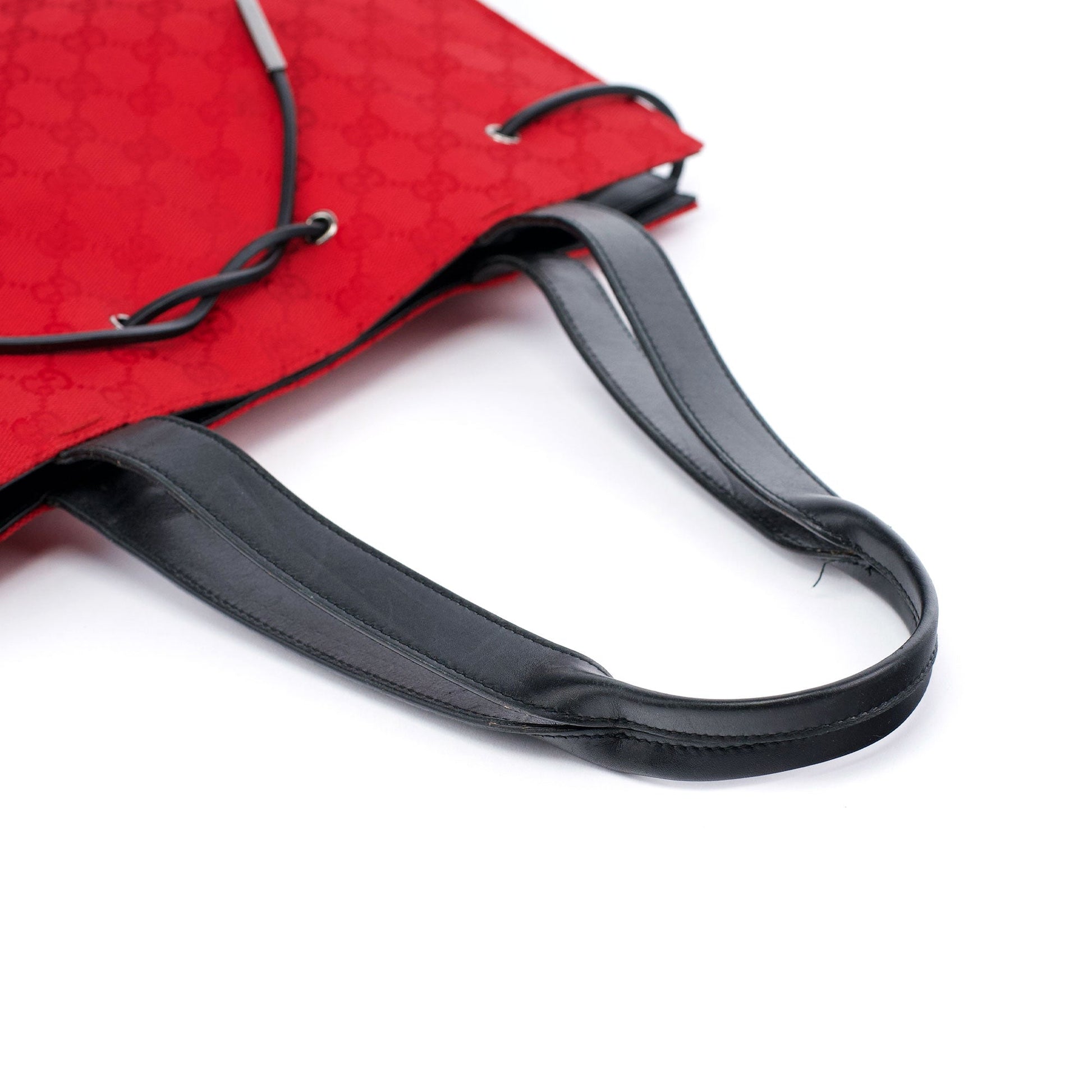 Designed by Tom Ford in the late 1990s, the Gucci GG Drawstring bag is handcrafted from red GG monogram canvas with black calfskin leather trim and silver-tone hardware. It features a drawstring closure for easy access, while the cotton-lined interior includes a zipper pocket for organization.