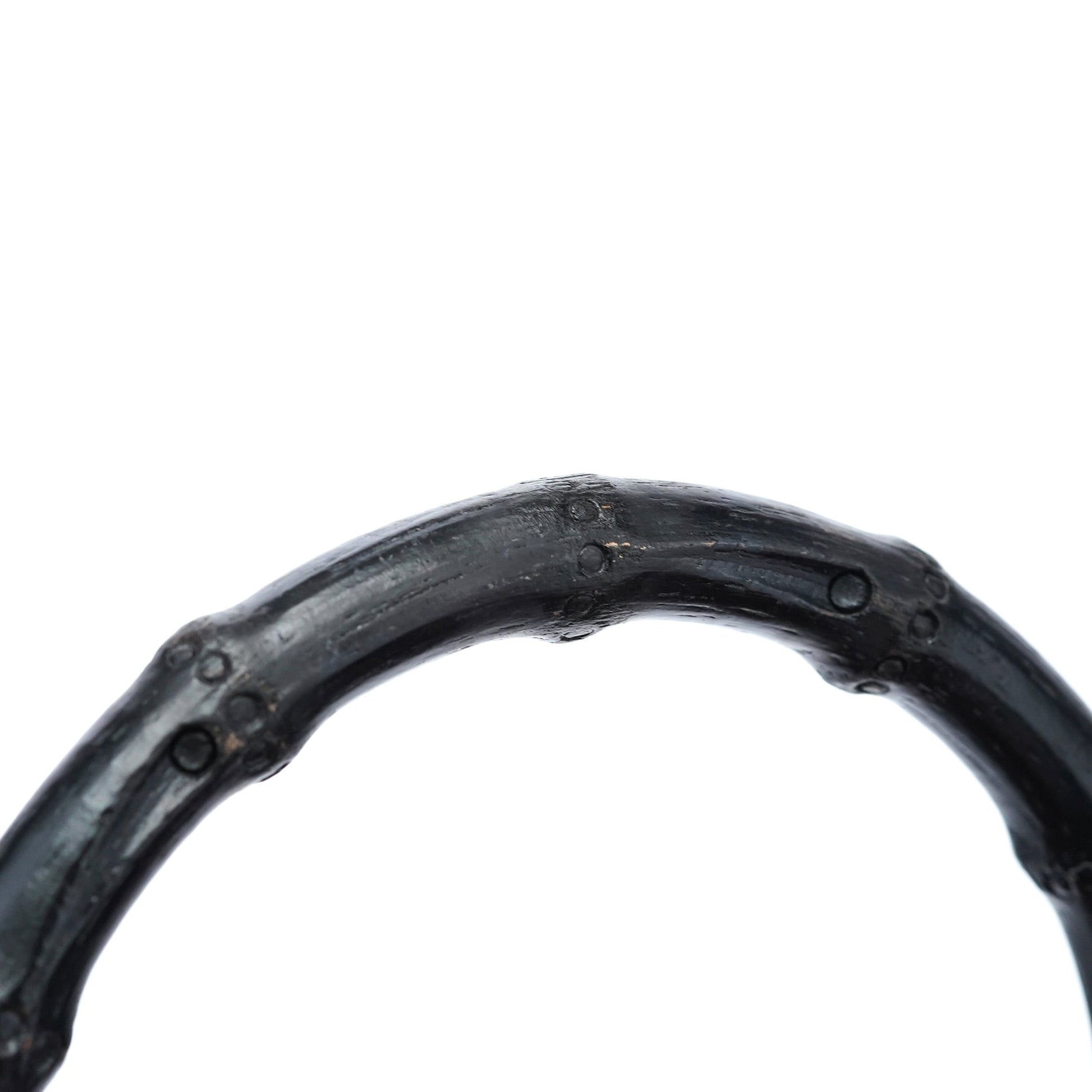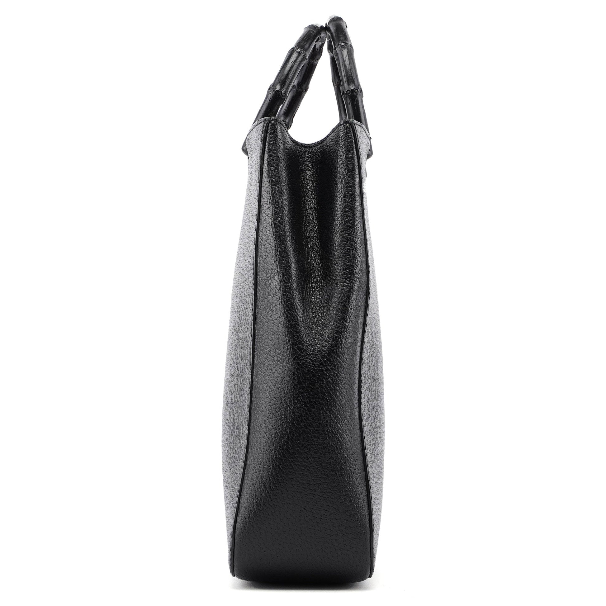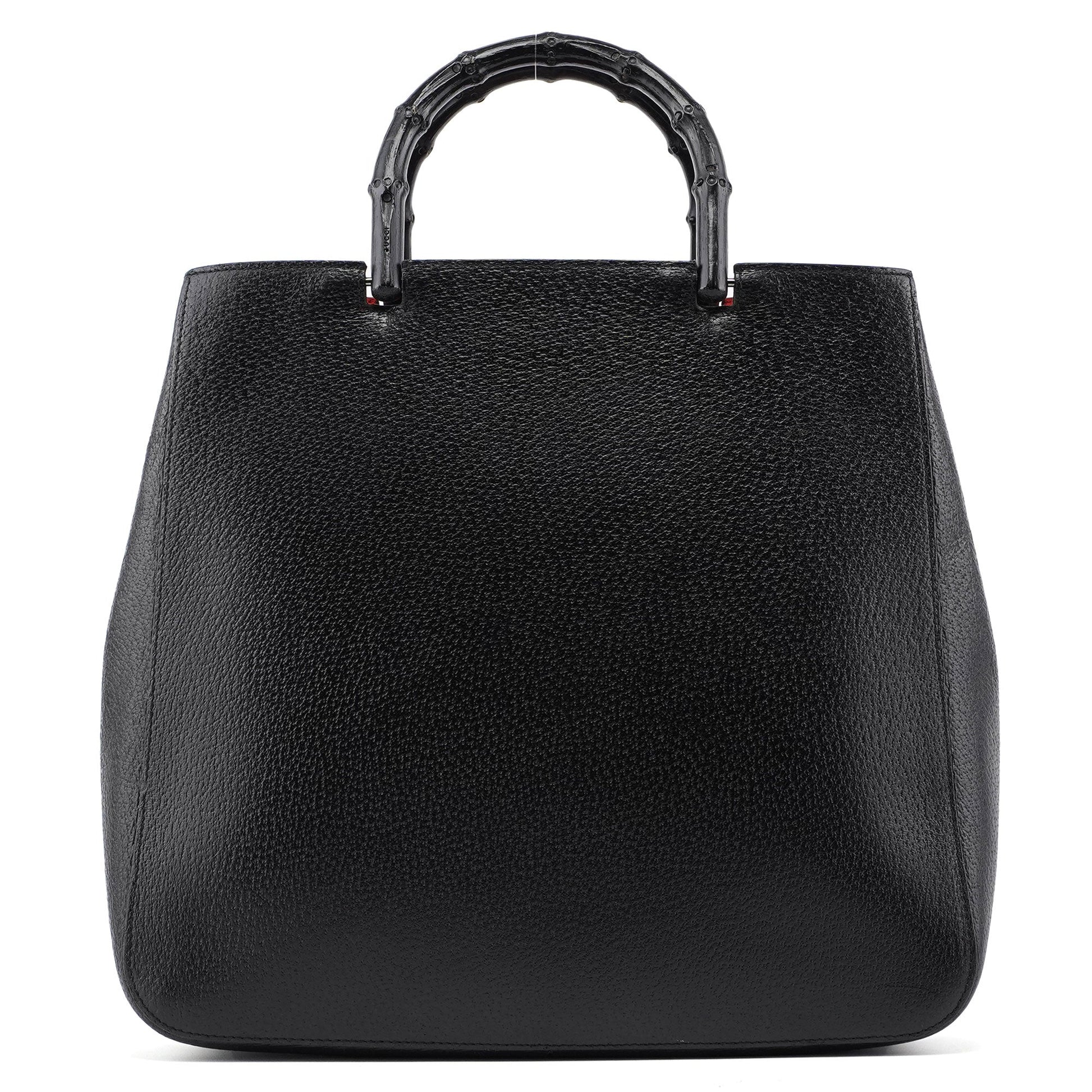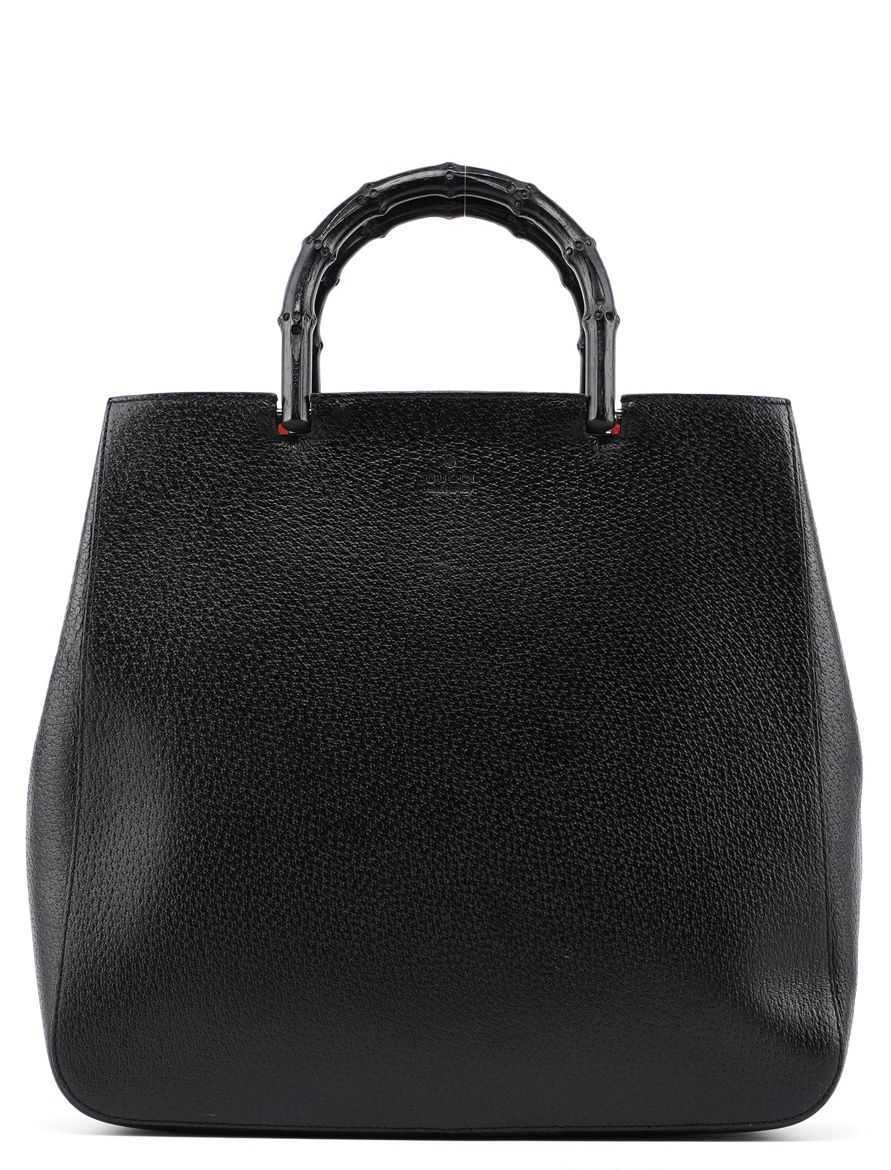Designed by Tom Ford in the late 1990s, this Gucci Bamboo tote bag is a timeless statement piece. Crafted from black leather, it features two gloss black bamboo handles engraved with the Gucci logo. The interior, lined in luxurious red suede, includes two compartments and an interior zipper pocket. Finished with an embossed Gucci logo on the front, this tote embodies both elegance and iconic design.