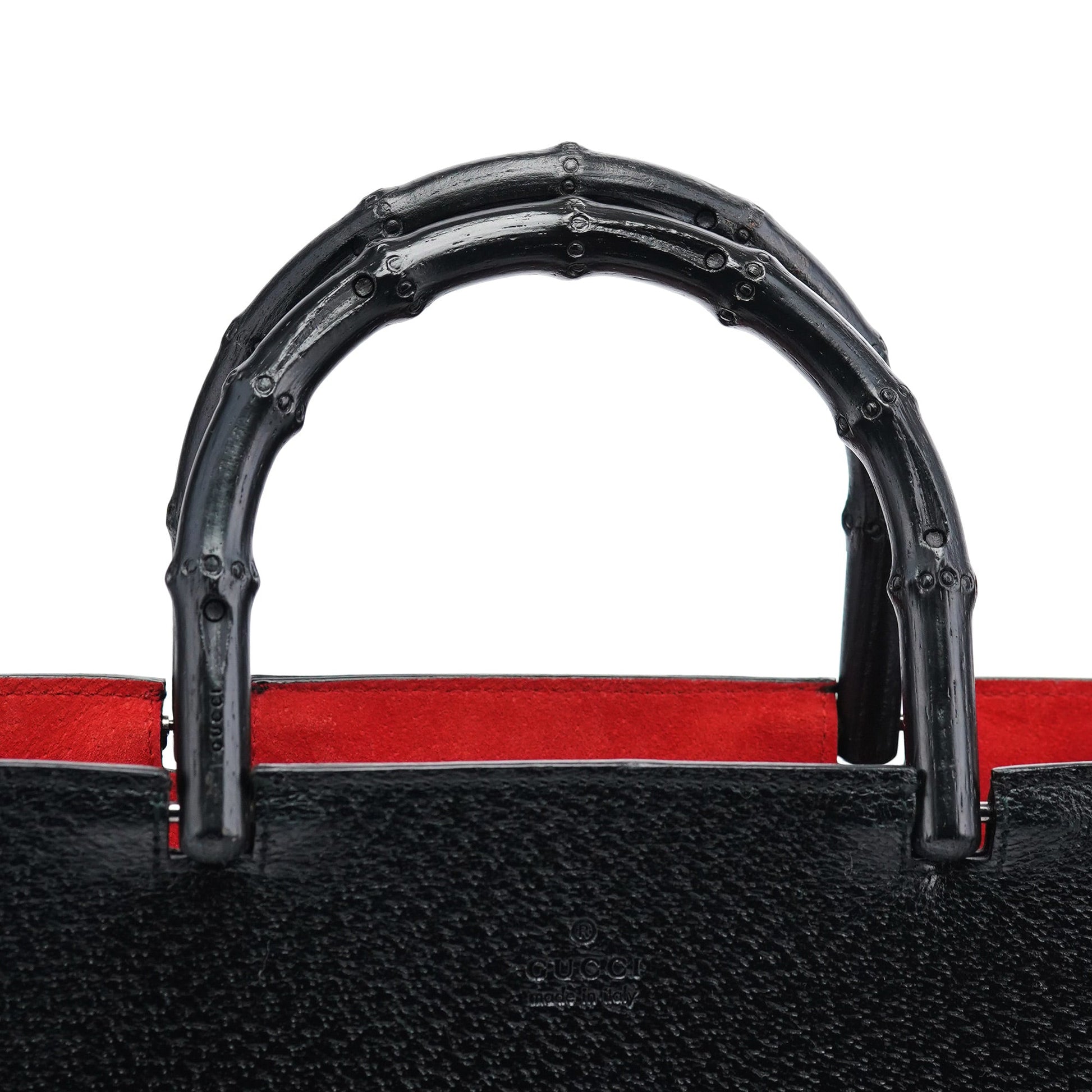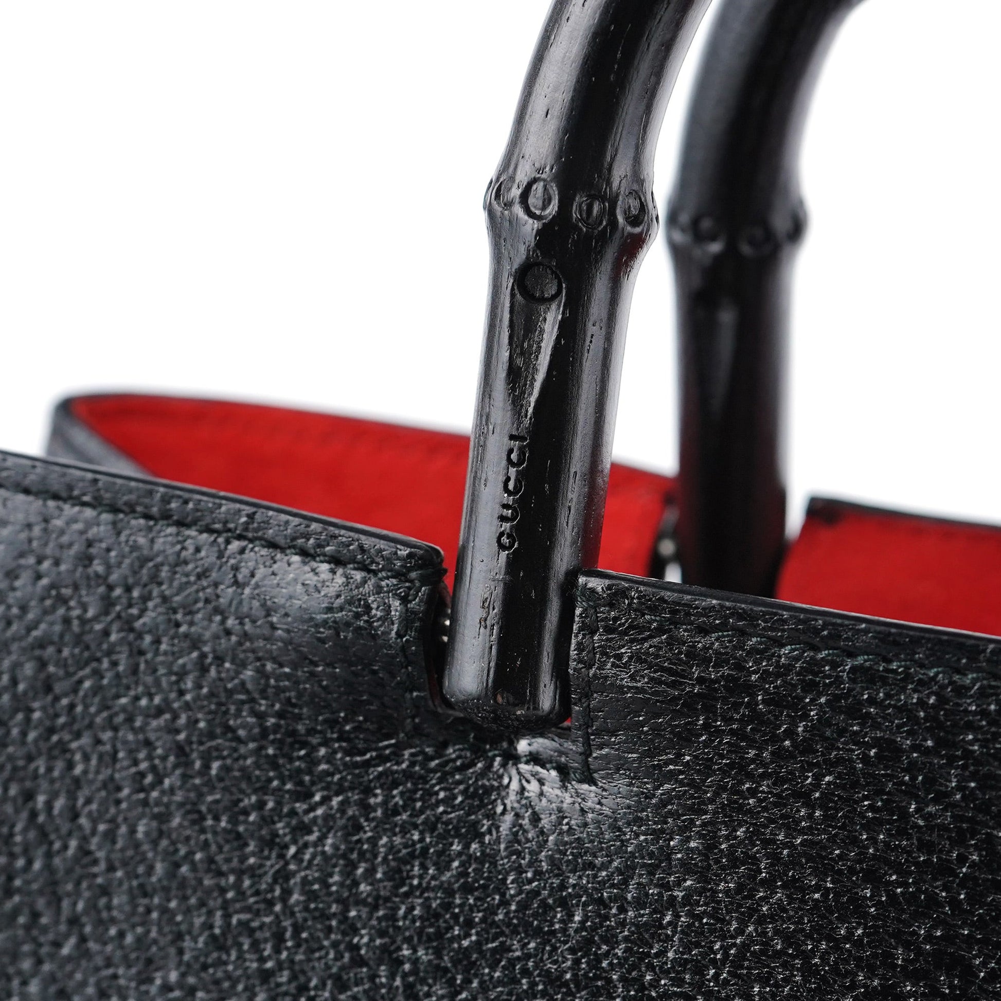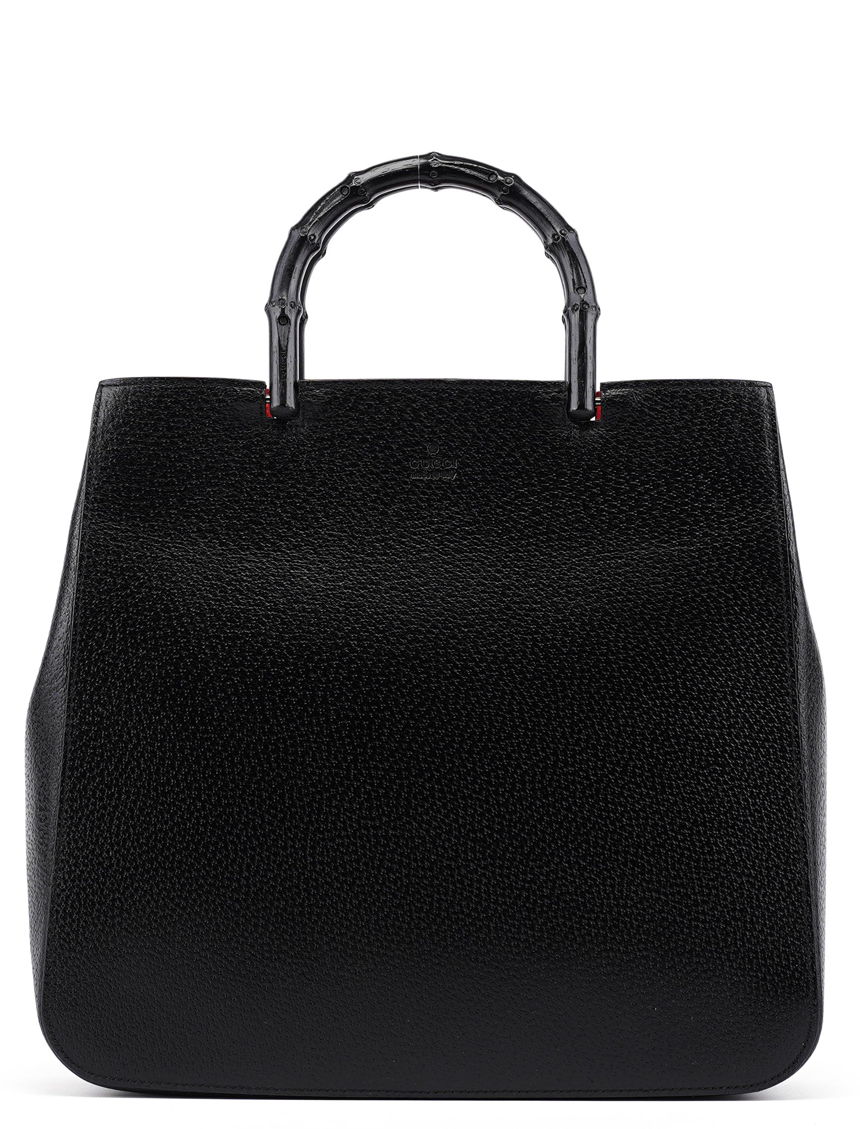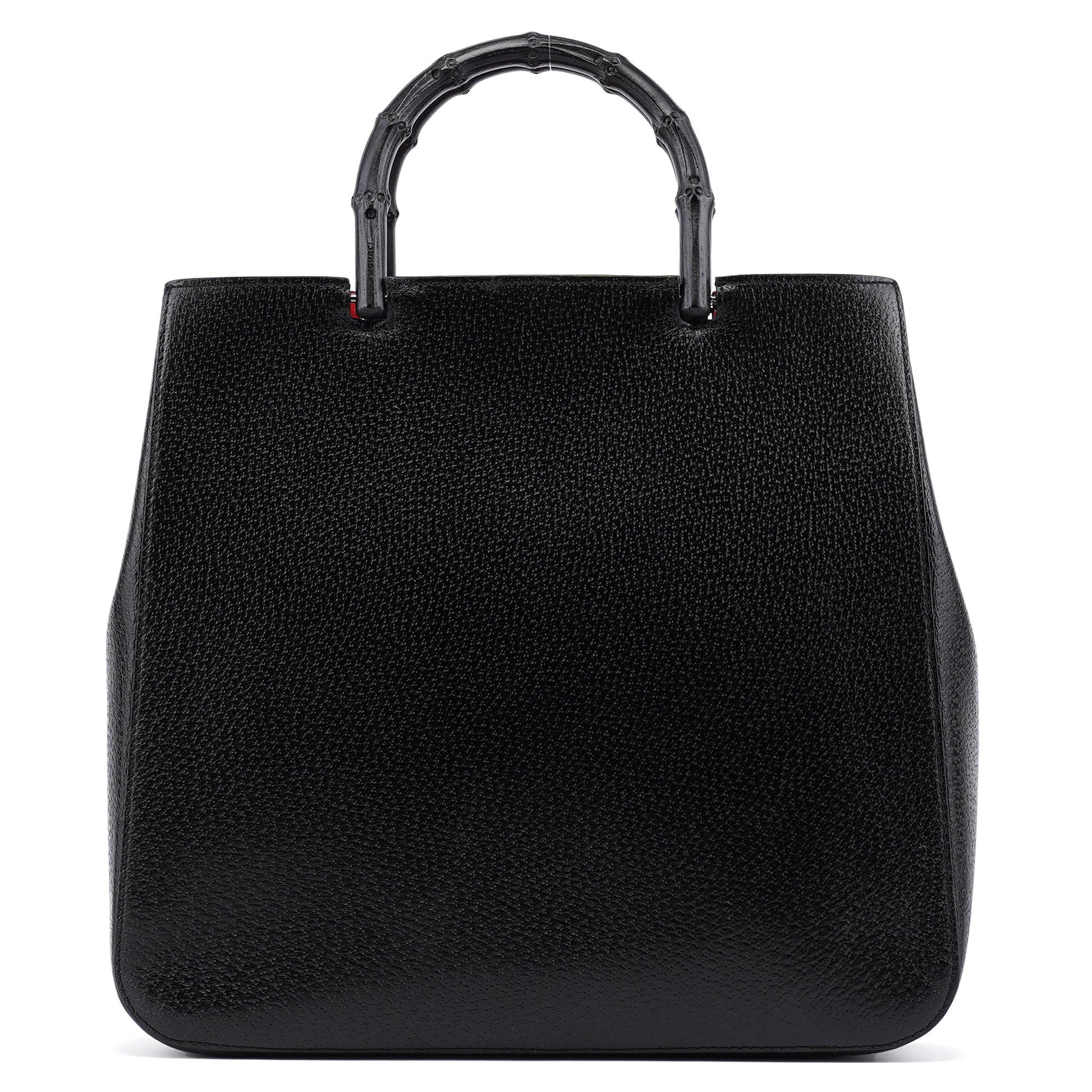 Designed by Tom Ford in the late 1990s, this Gucci Bamboo tote bag is a timeless statement piece. Crafted from black leather, it features two gloss black bamboo handles engraved with the Gucci logo. The interior, lined in luxurious red suede, includes two compartments and an interior zipper pocket. Finished with an embossed Gucci logo on the front, this tote embodies both elegance and iconic design.