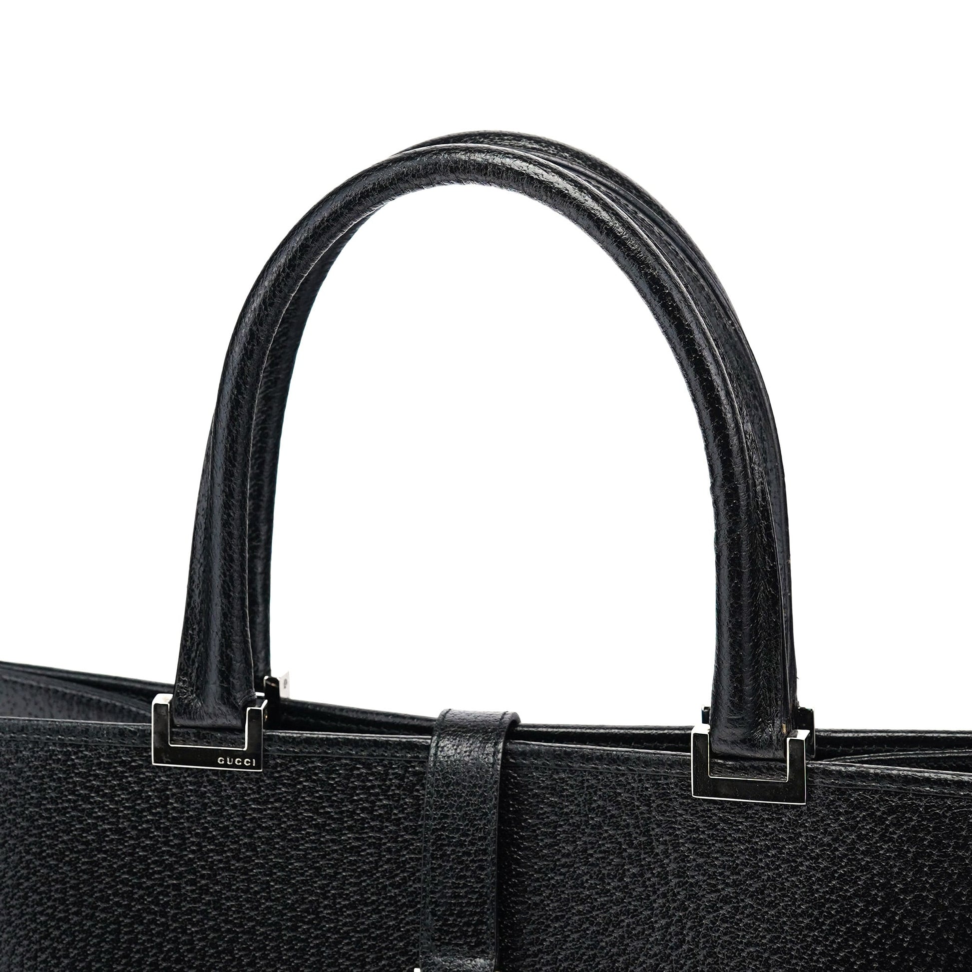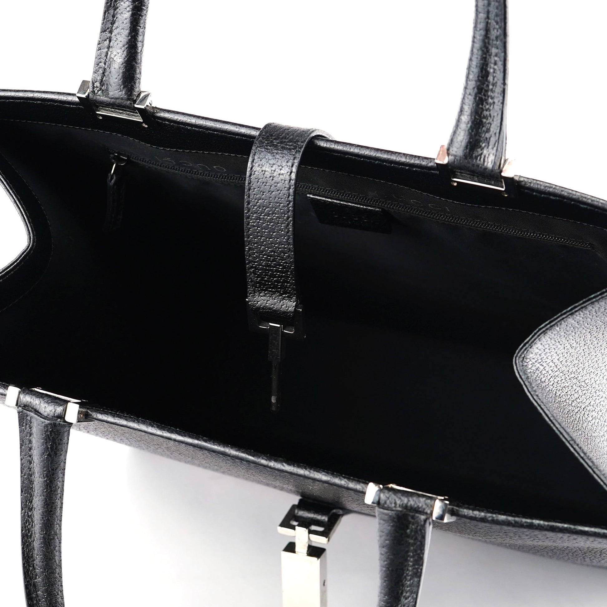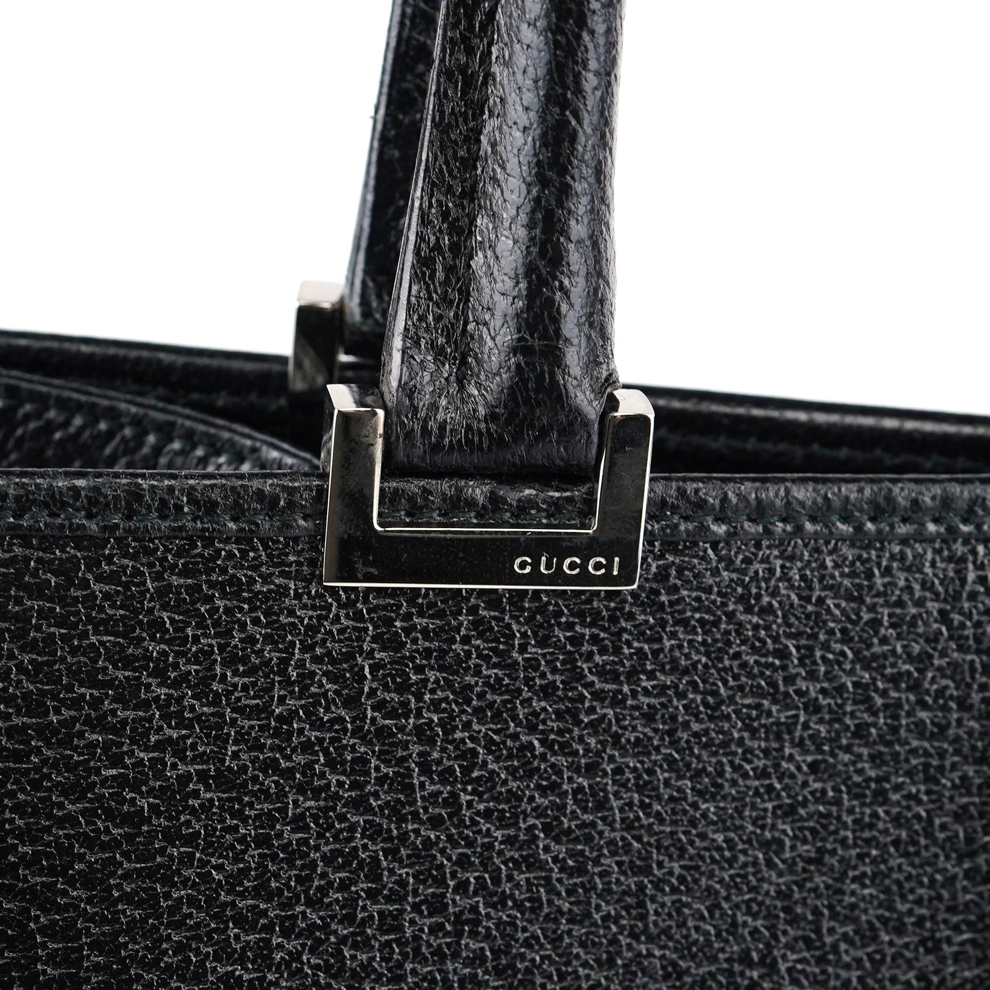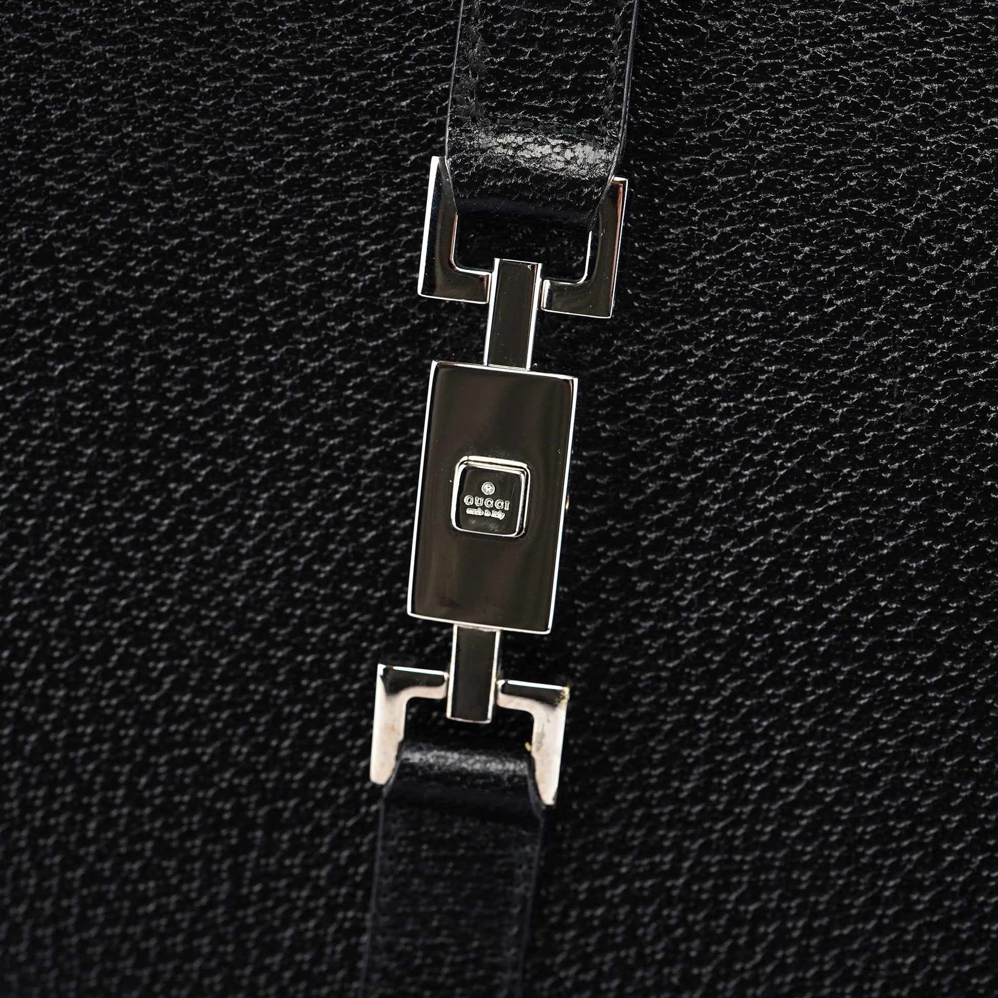 Designed by Tom Ford in the late 1990s, the Gucci Jackie tote is handcrafted from black textured leather and features silver-tone hardware engraved with the Gucci logo. It has a signature Jackie closure, a satin-lined interior, and an interior zipper pocket, showcasing timeless elegance.