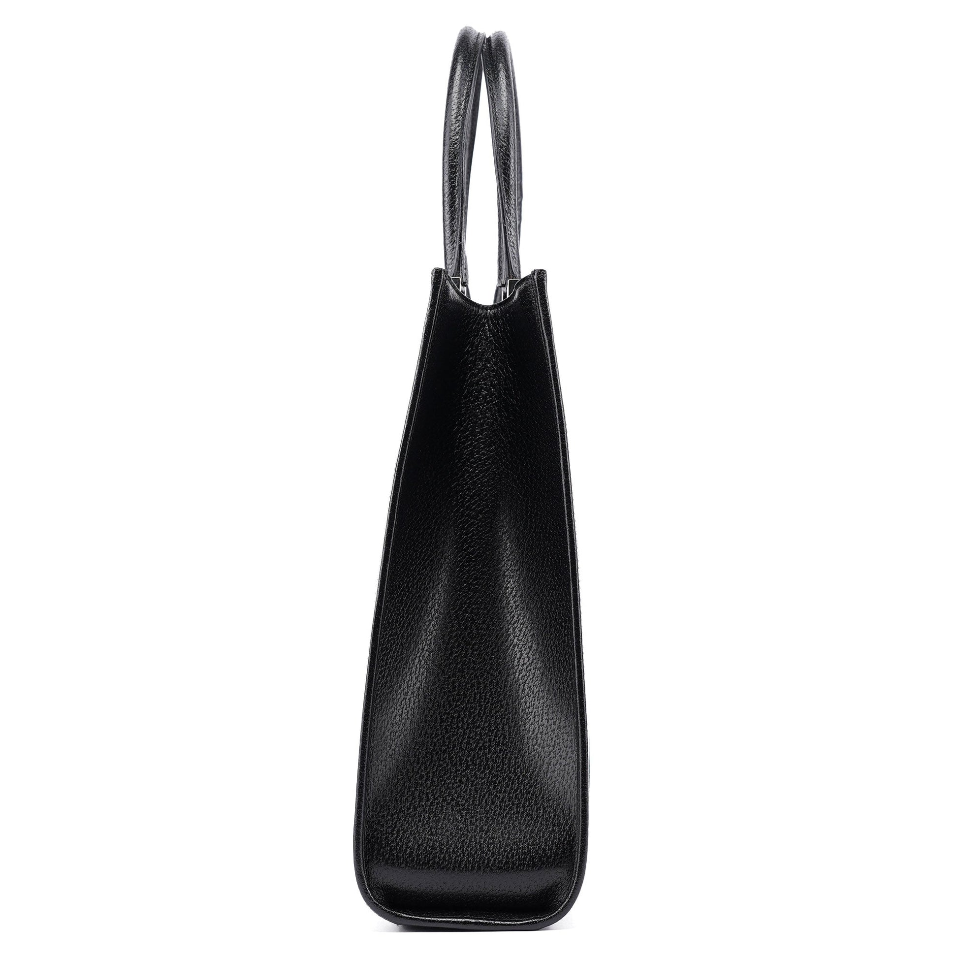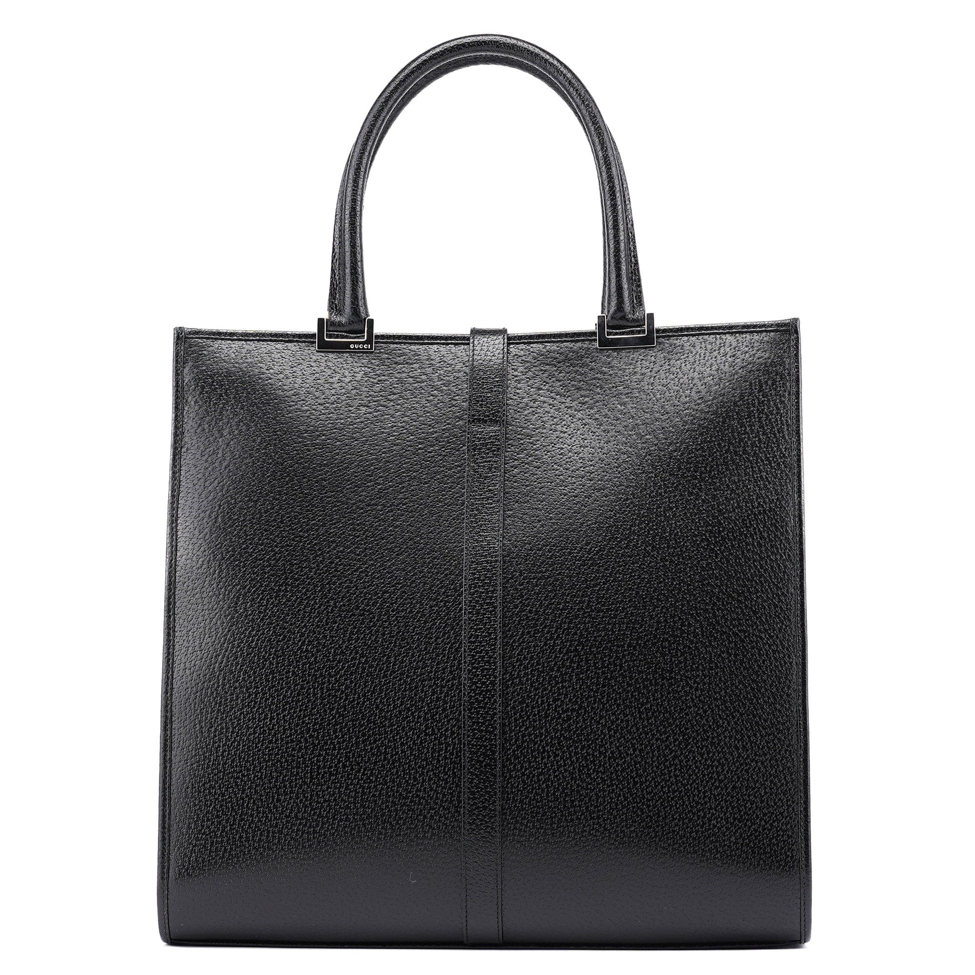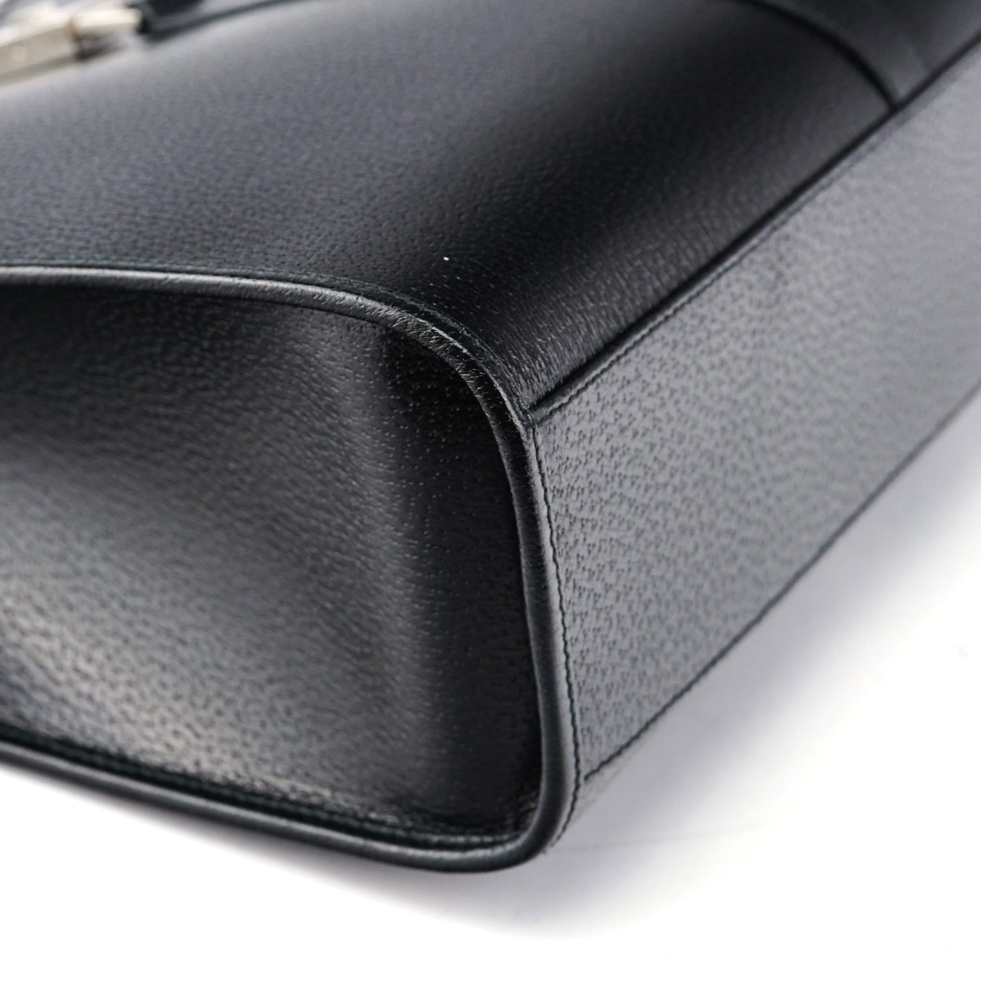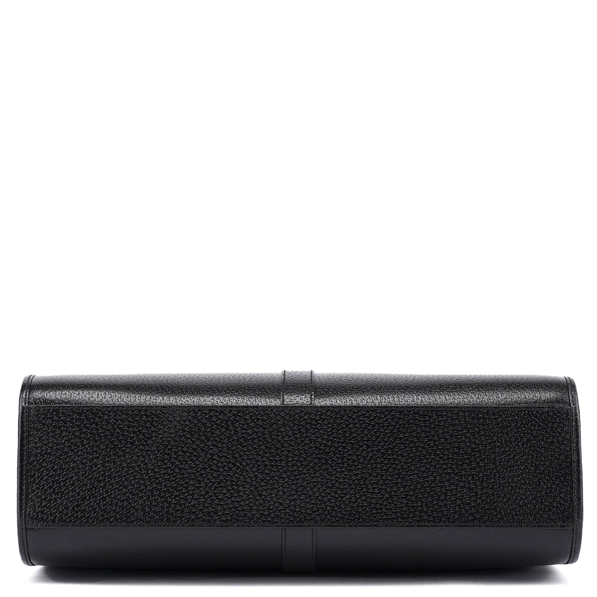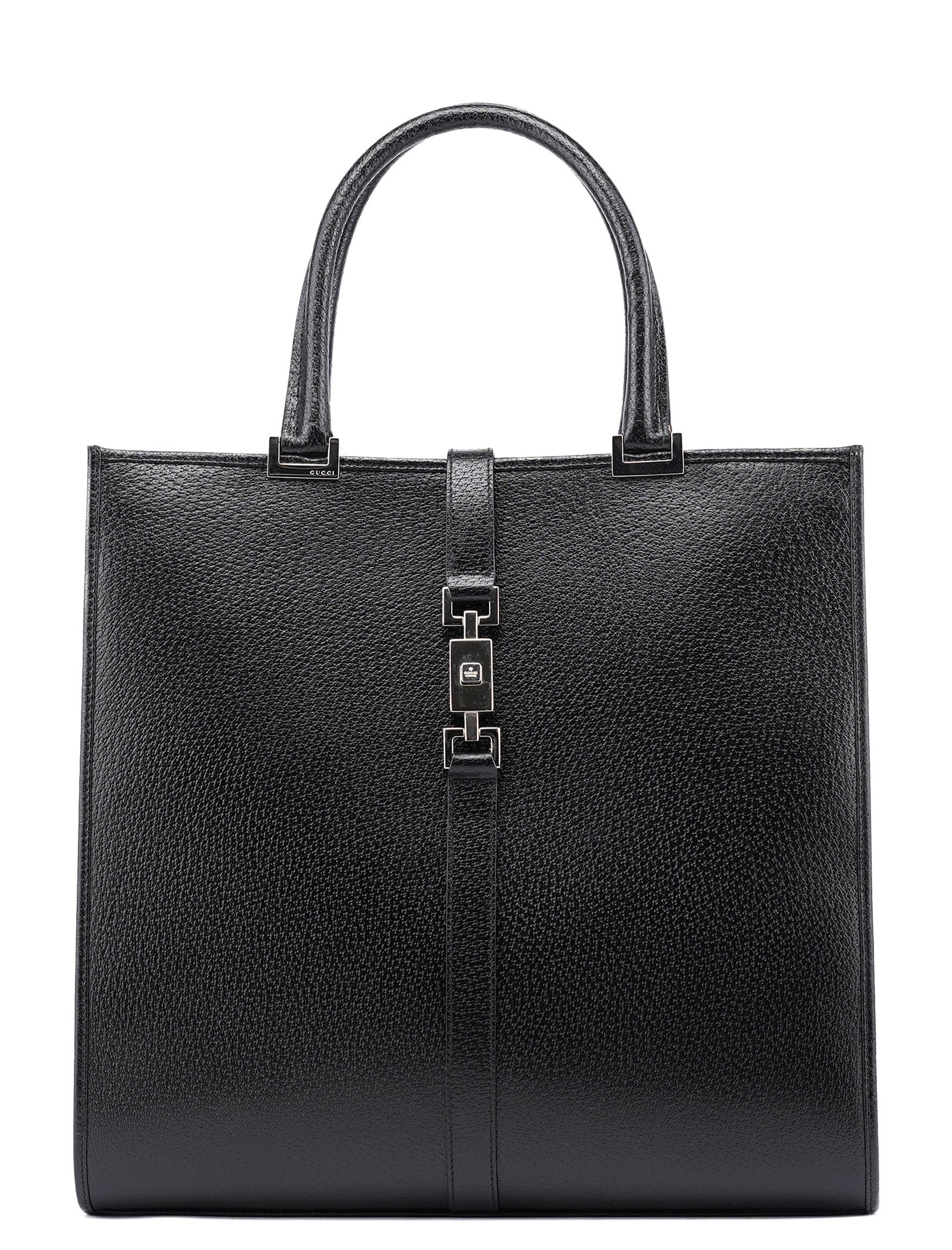 Designed by Tom Ford in the late 1990s, the Gucci Jackie tote is handcrafted from black textured leather and features silver-tone hardware engraved with the Gucci logo. It has a signature Jackie closure, a satin-lined interior, and an interior zipper pocket, showcasing timeless elegance.