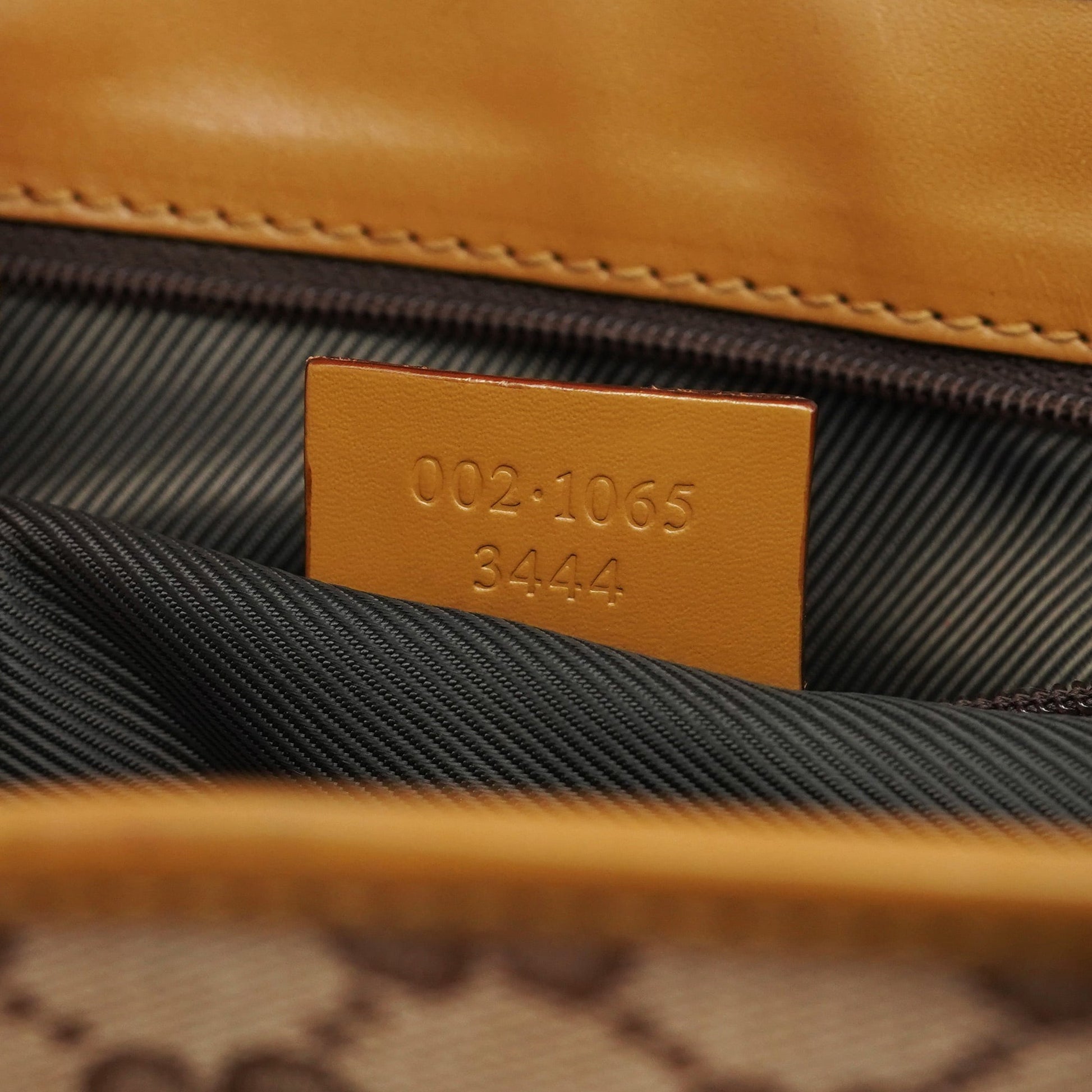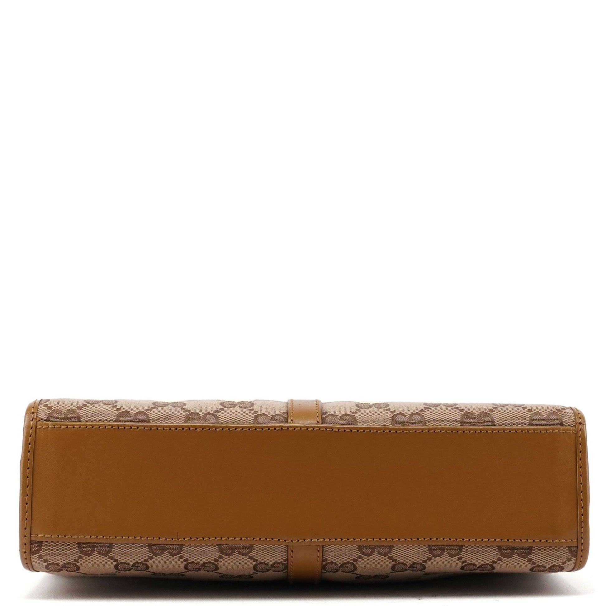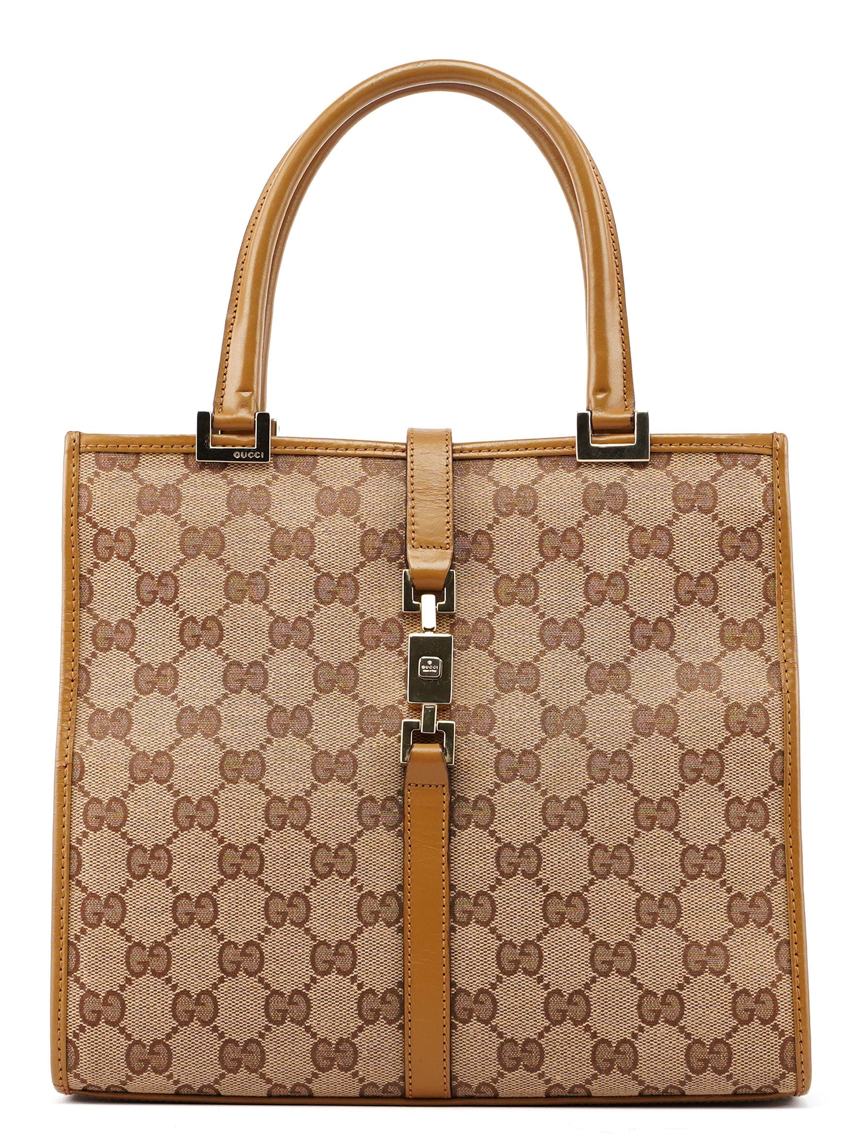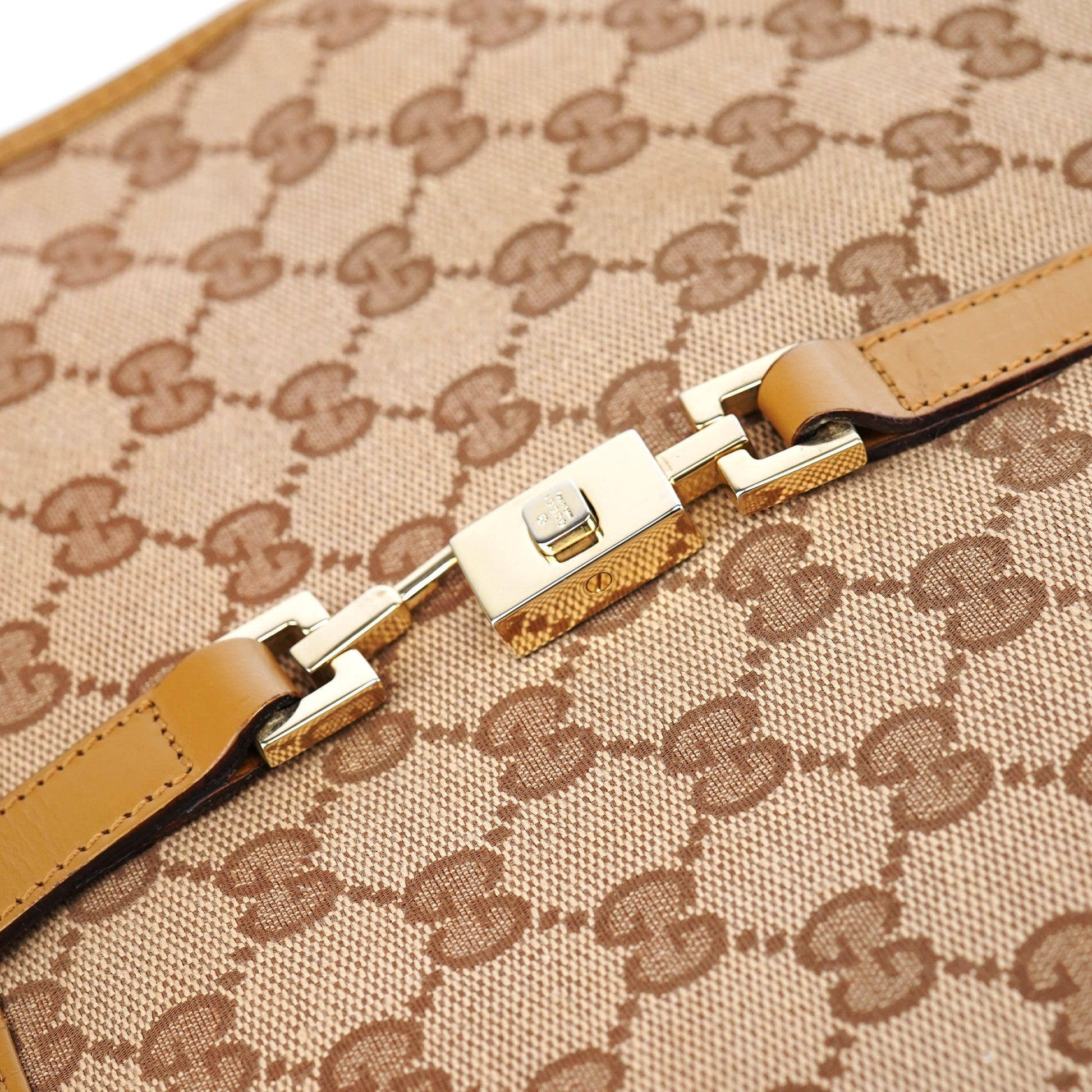 Introducing the Gucci GG Jackie tote bag, designed by Tom Ford in the late 1990s. Handcrafted from beige GG monogram canvas with tonal leather trim, it features gold-tone hardware, Jackie clasp closure, satin-lined interior, and an interior zipper pocket.