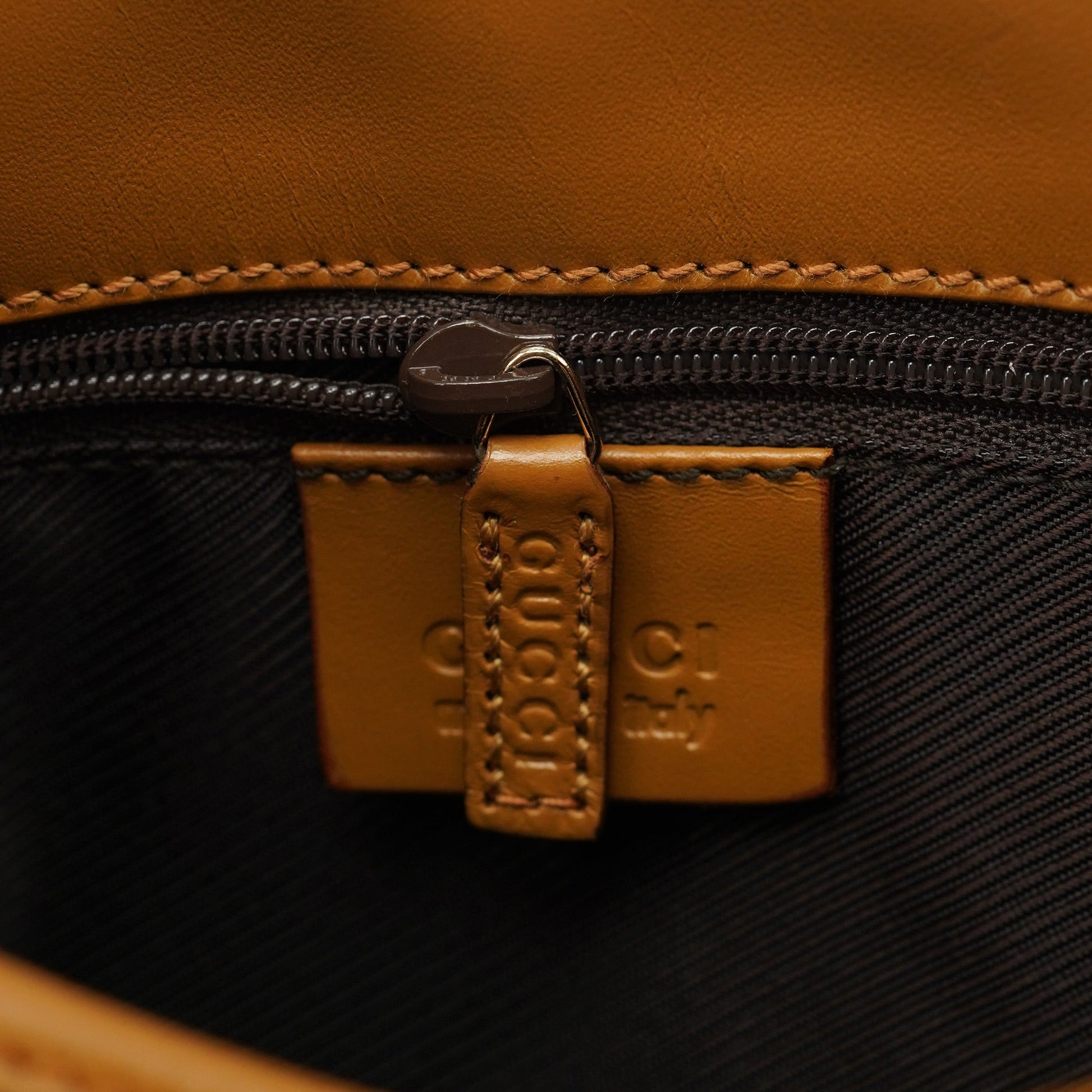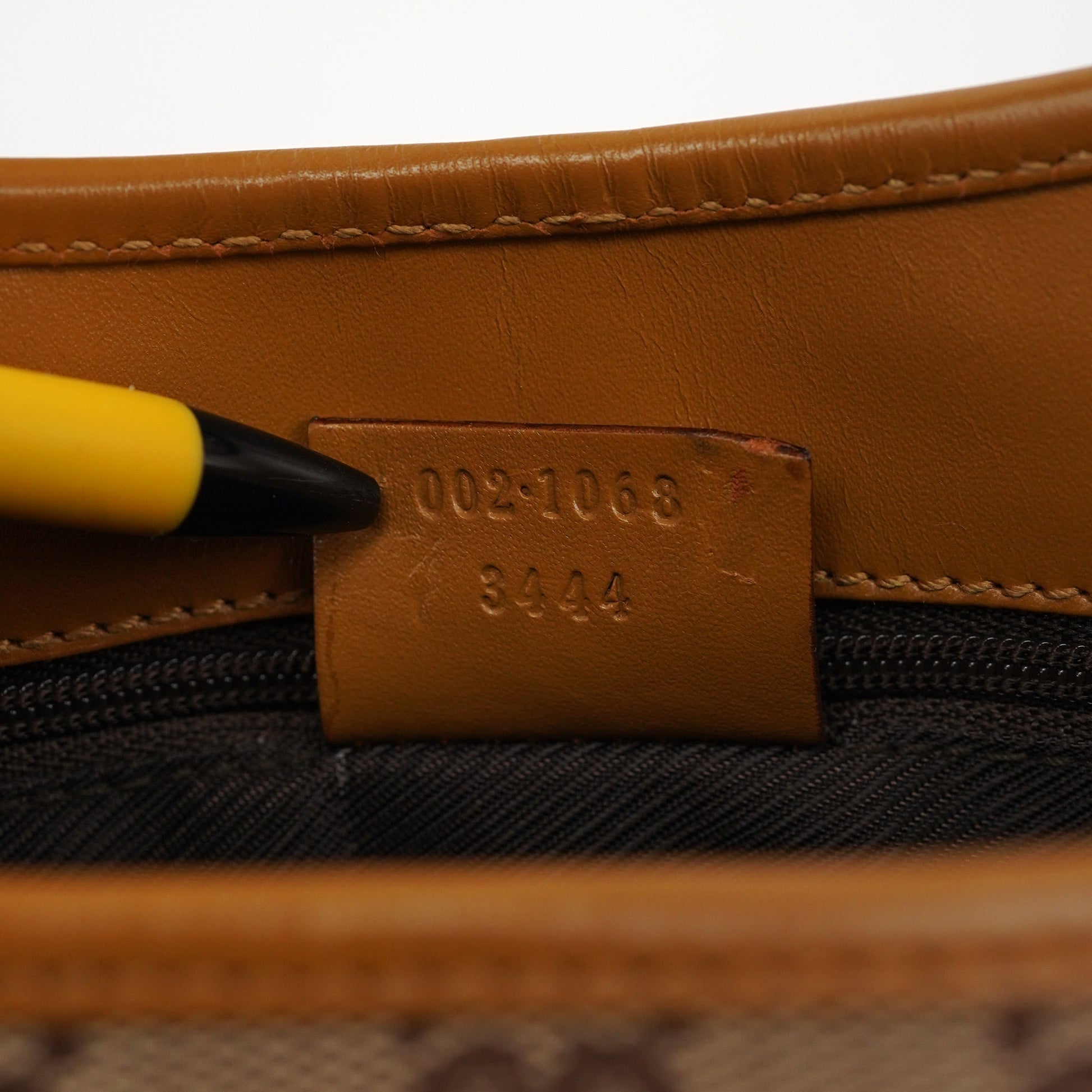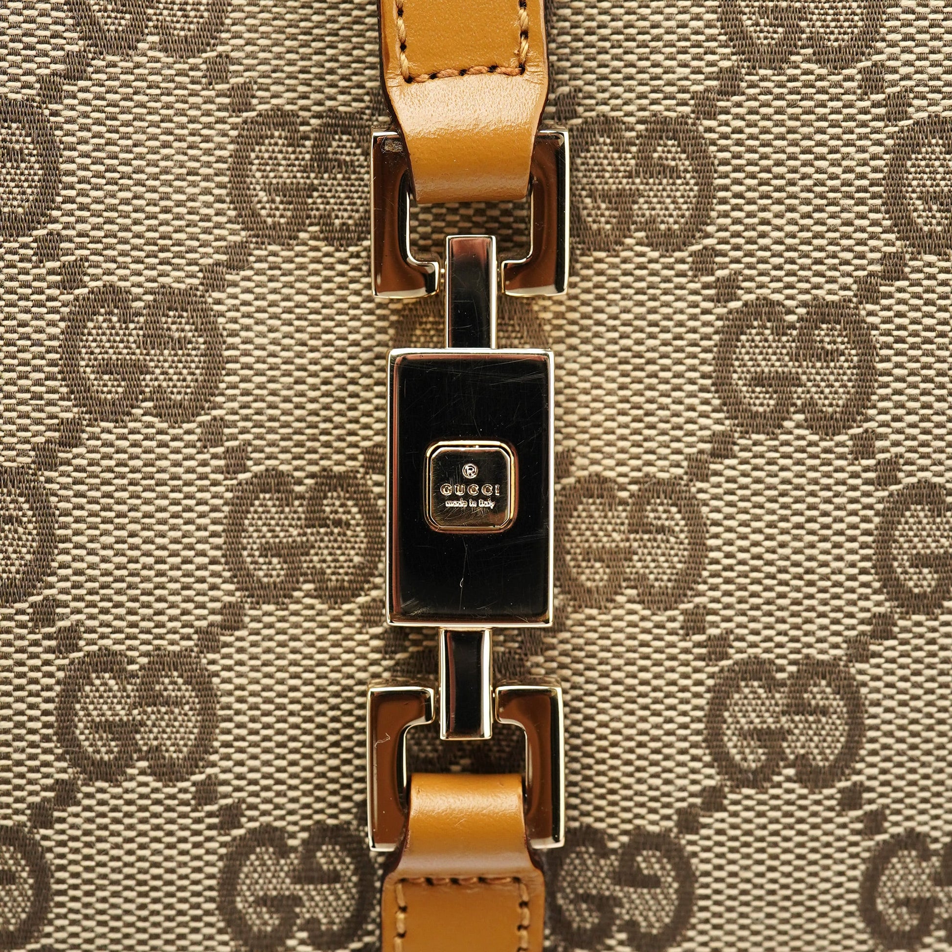 Designed by Tom Ford in the late 1990s, this Gucci GG Jackie shoulder bag is handcrafted from beige GG monogram canvas with beige calfskin leather trim. It features gold-toned hardware engraved with the Gucci logo and the iconic Jackie clasp closure. The satin-lined interior includes an interior zipper pocket, embodying timeless elegance and sophisticated style.