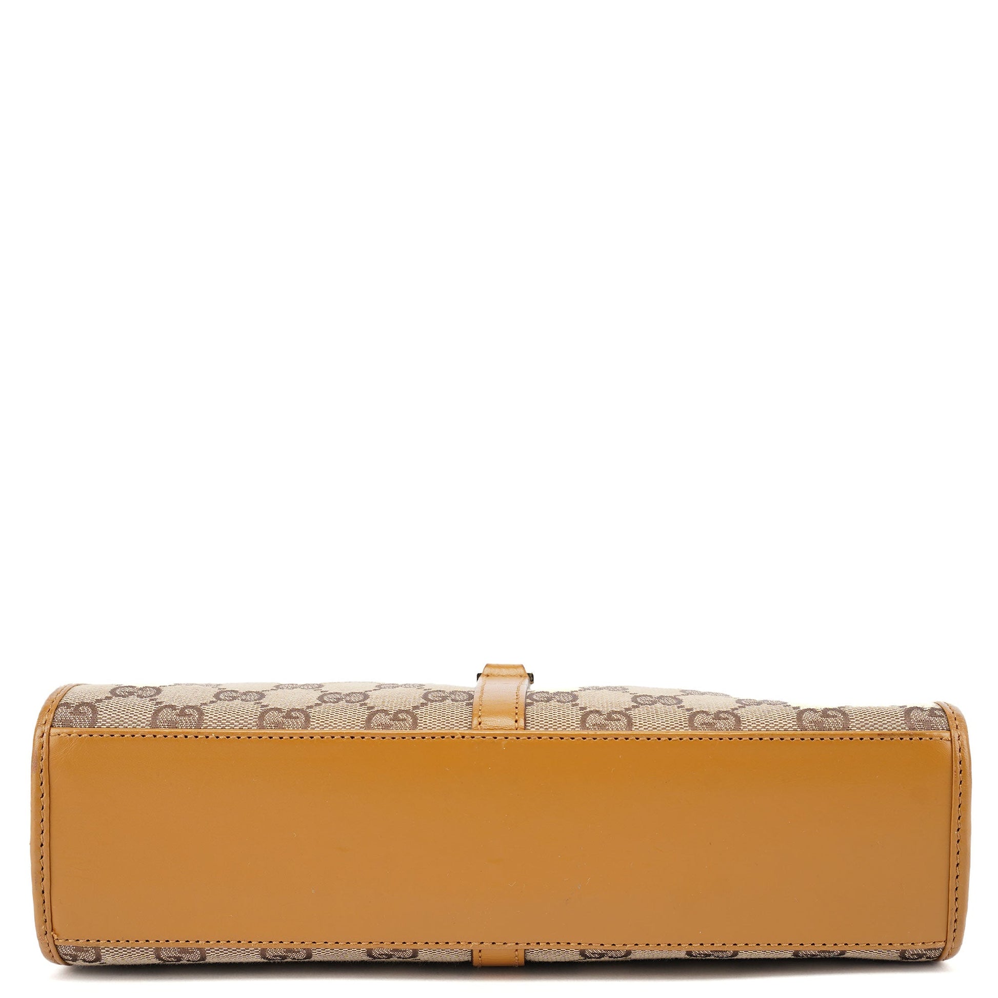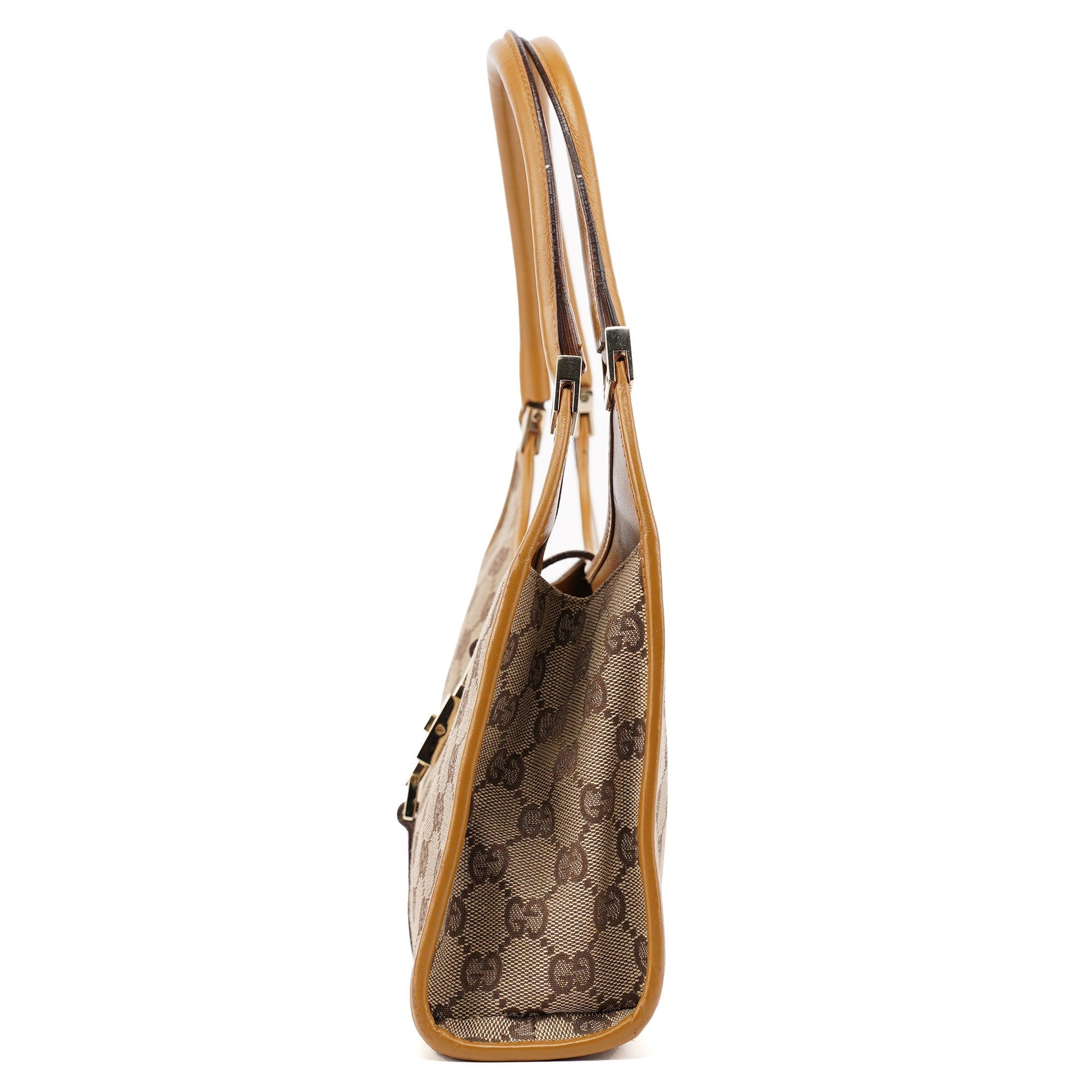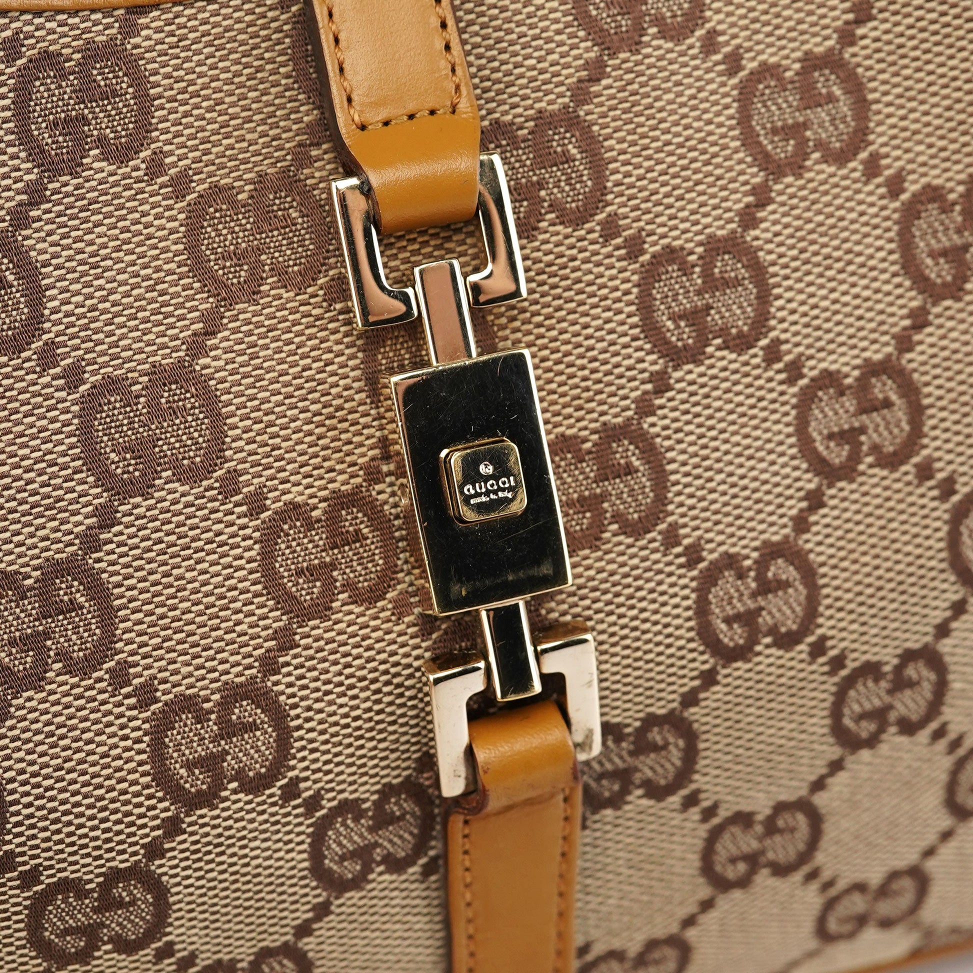 Designed by Tom Ford in the late 1990s, this Gucci GG Jackie shoulder bag is handcrafted from beige GG monogram canvas with yellow calfskin leather trim. It features brass hardware engraved with the Gucci logo and the iconic Jackie clasp closure. The satin-lined interior includes an interior zipper pocket, embodying timeless elegance and sophisticated style.