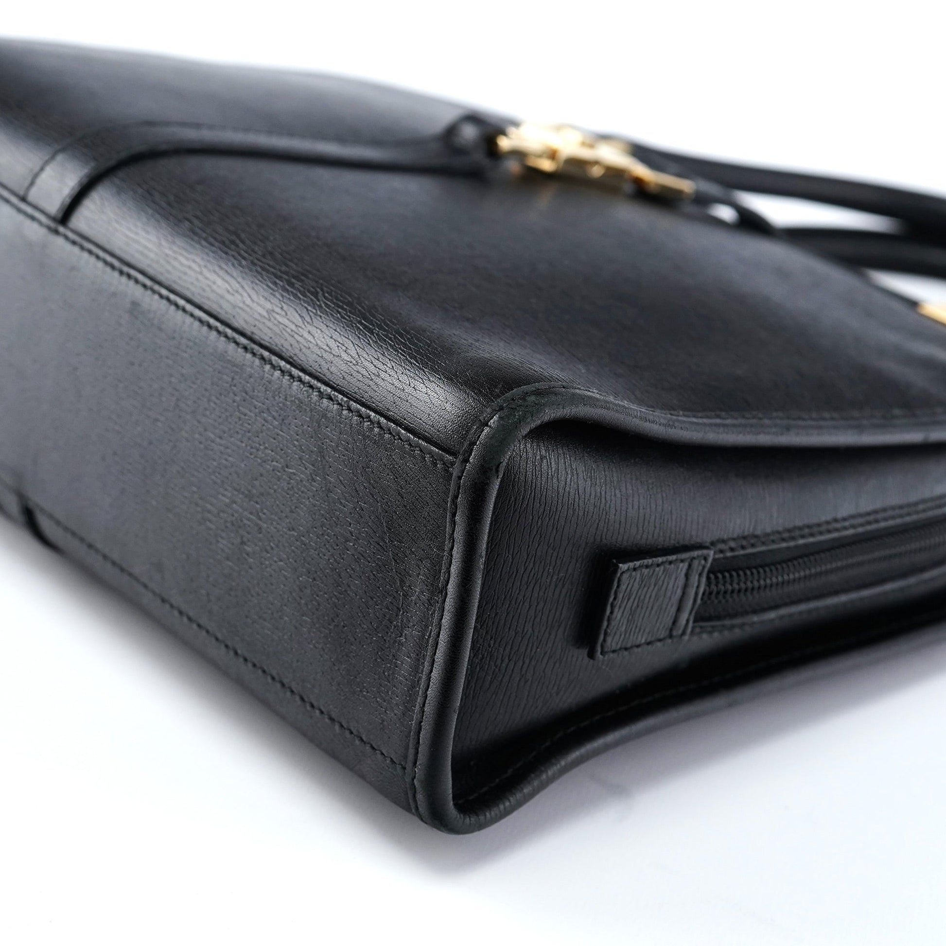 Discover the Gucci Jackie tote bag, a timeless design by Tom Ford from the late 1990s. Handcrafted in sleek black leather, it features the iconic Jackie clasp closure, complemented by gold-tone hardware engraved with the Gucci logo. The satin-lined interior, complete with a zipper pocket, ensures organized storage, making this piece a perfect blend of elegance and functionality.