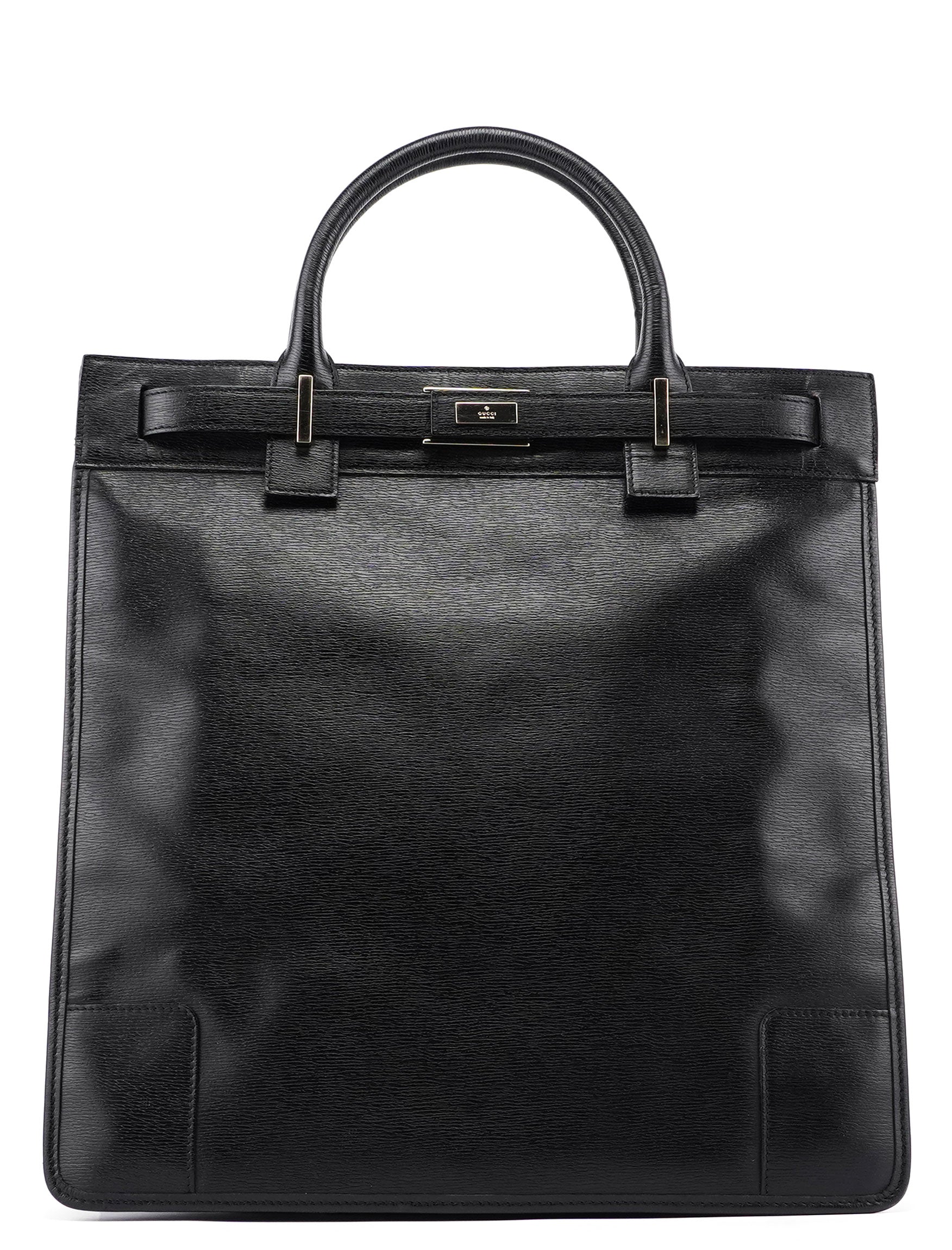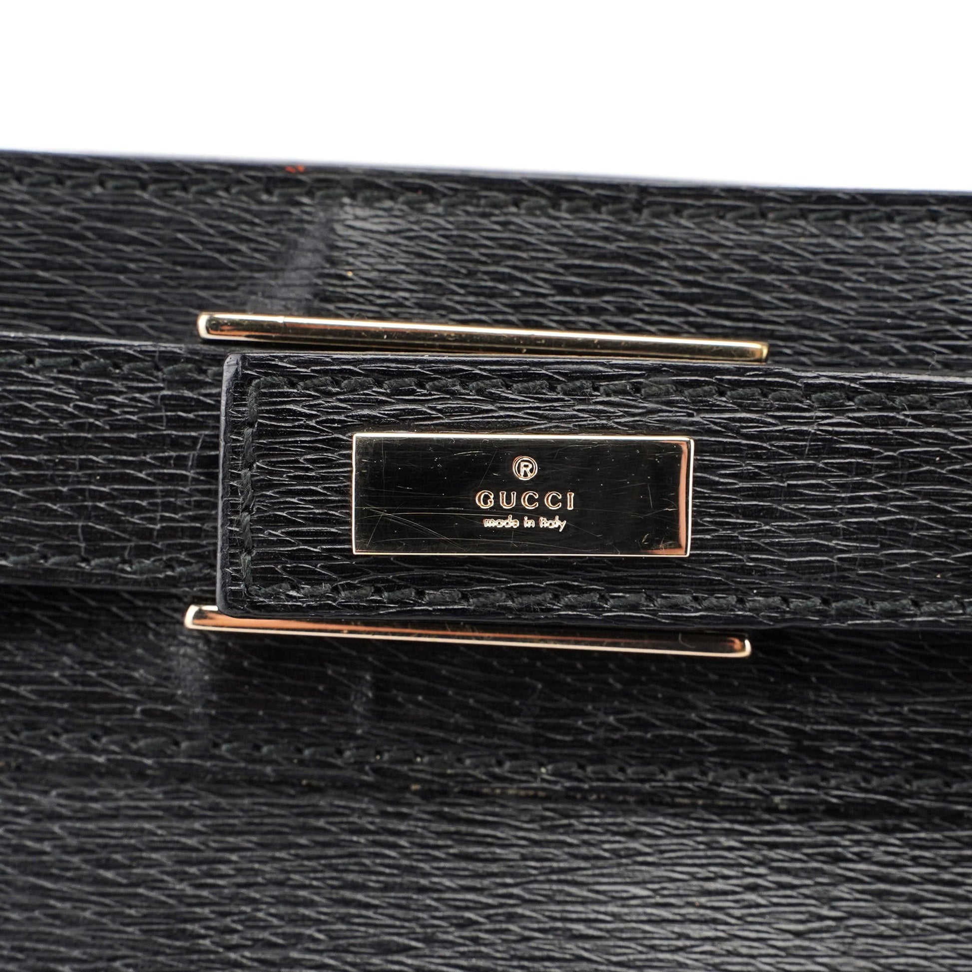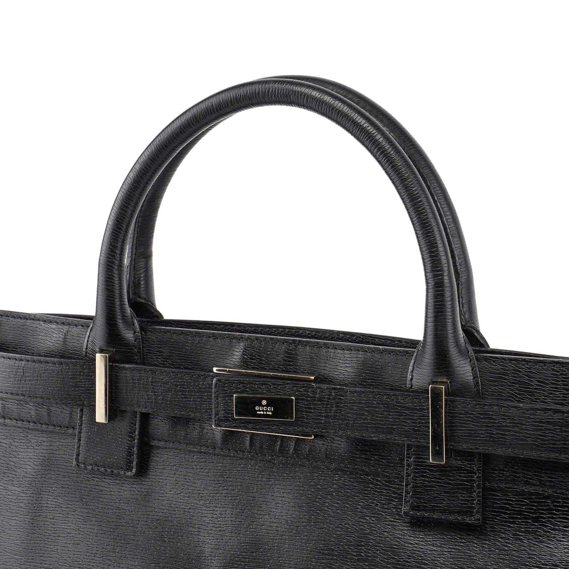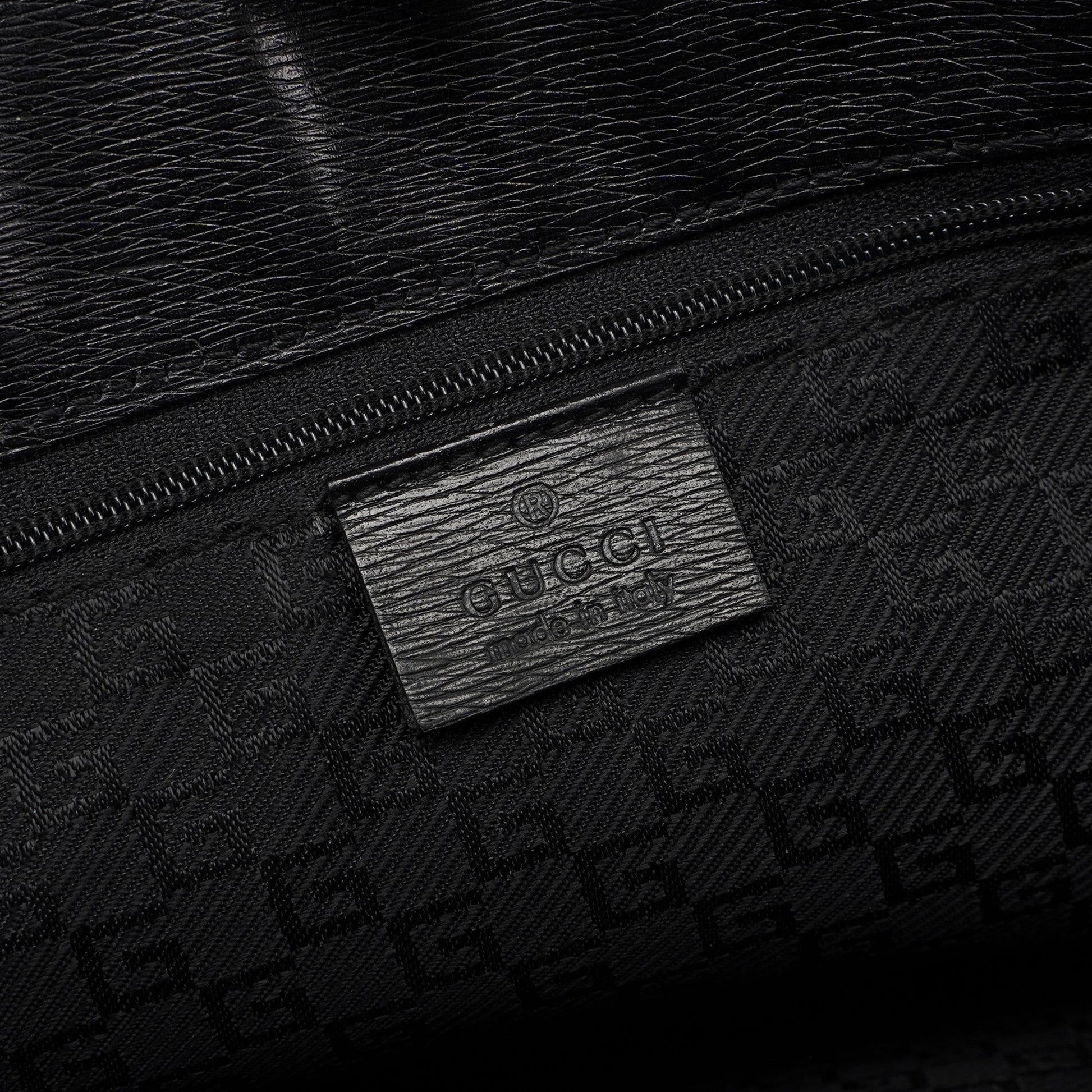 This late 1990s Gucci tote bag, designed by Tom Ford, is meticulously crafted from black leather and features elegant gold-tone hardware embossed with the Gucci logo. Its interior is lined with satin and includes a zipper pocket, exemplifying classic sophistication.