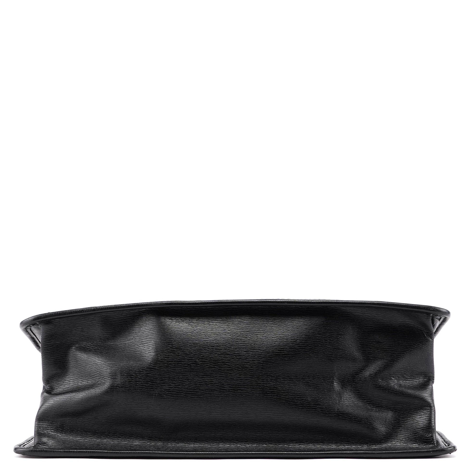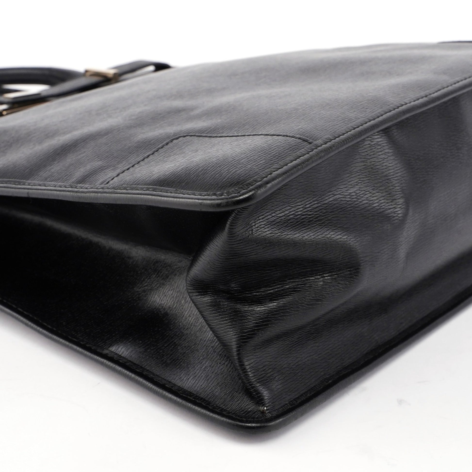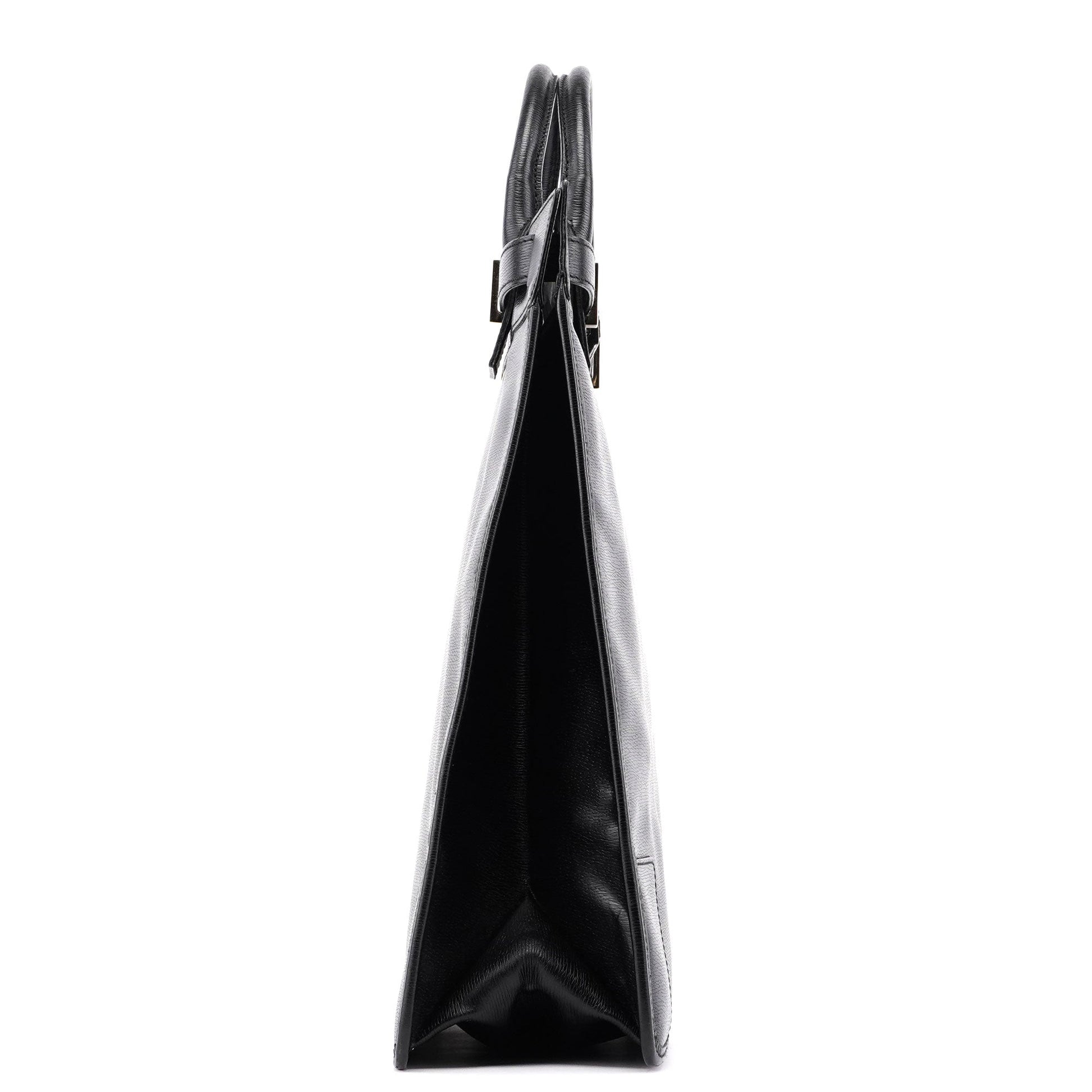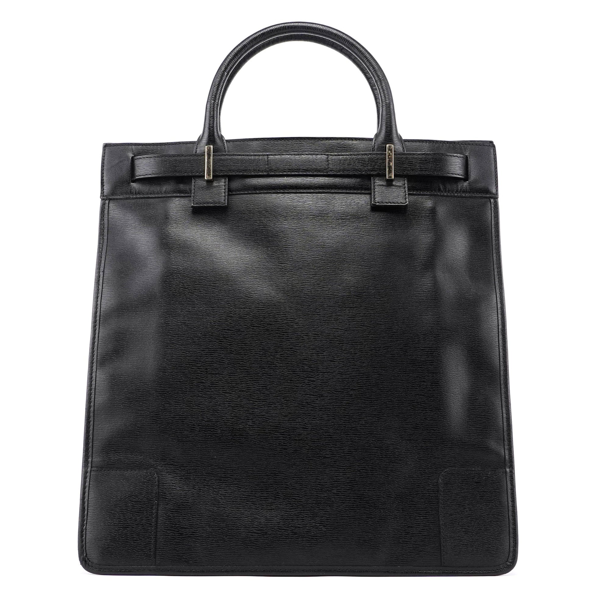This late 1990s Gucci tote bag, designed by Tom Ford, is meticulously crafted from black leather and features elegant gold-tone hardware embossed with the Gucci logo. Its interior is lined with satin and includes a zipper pocket, exemplifying classic sophistication.