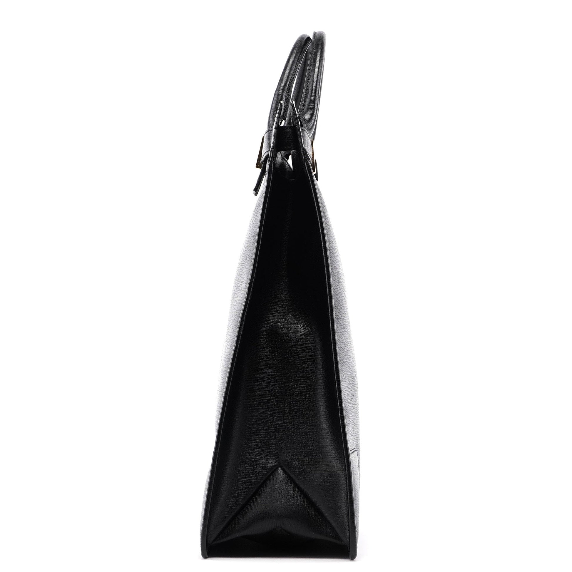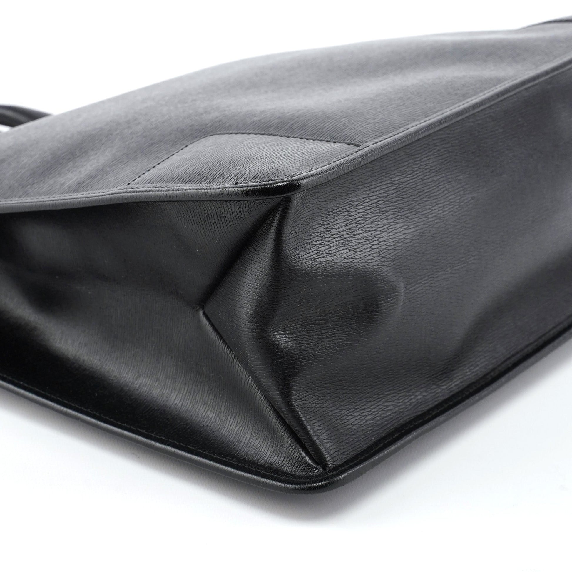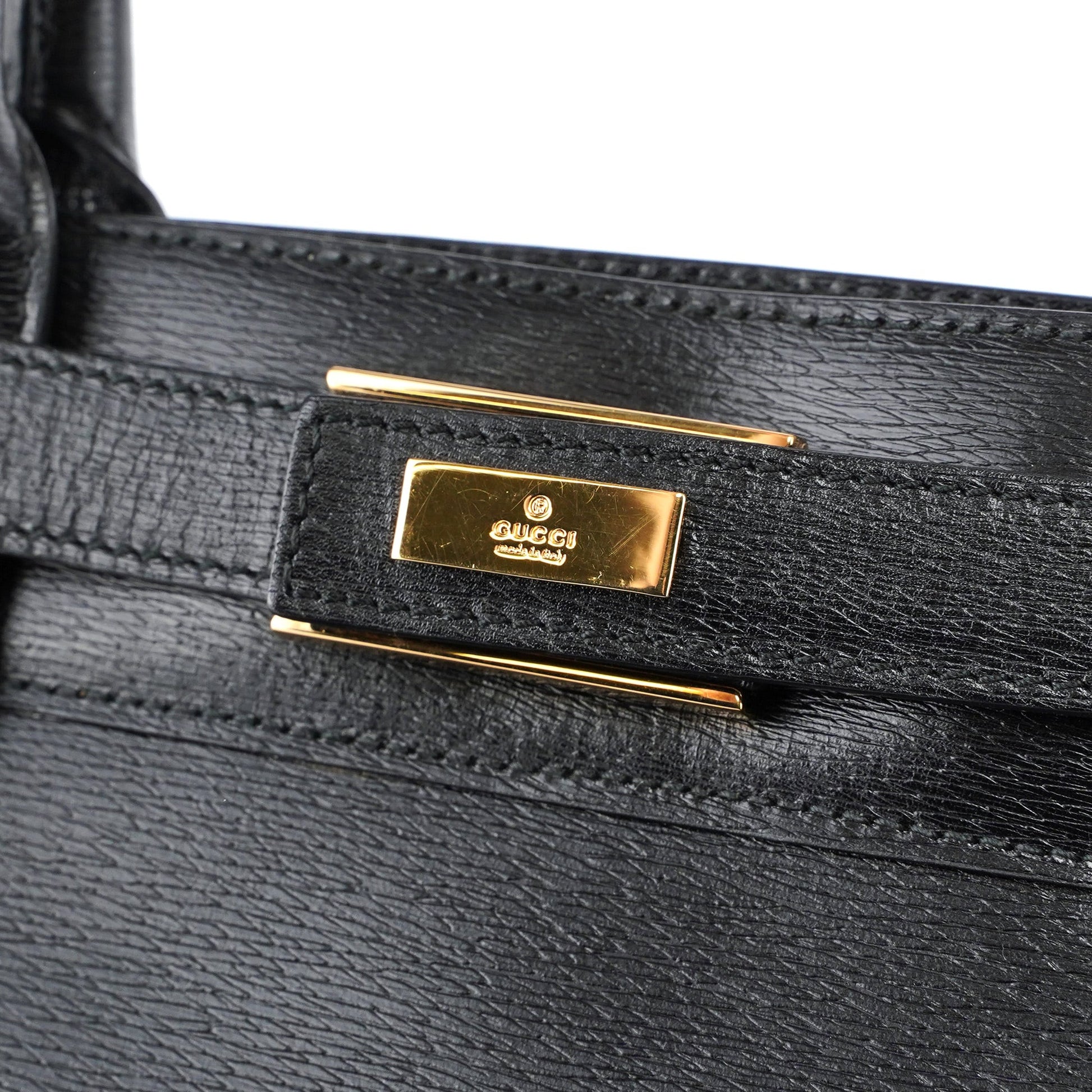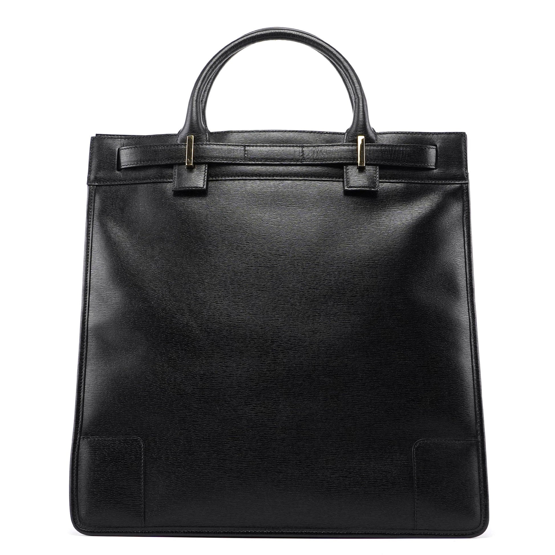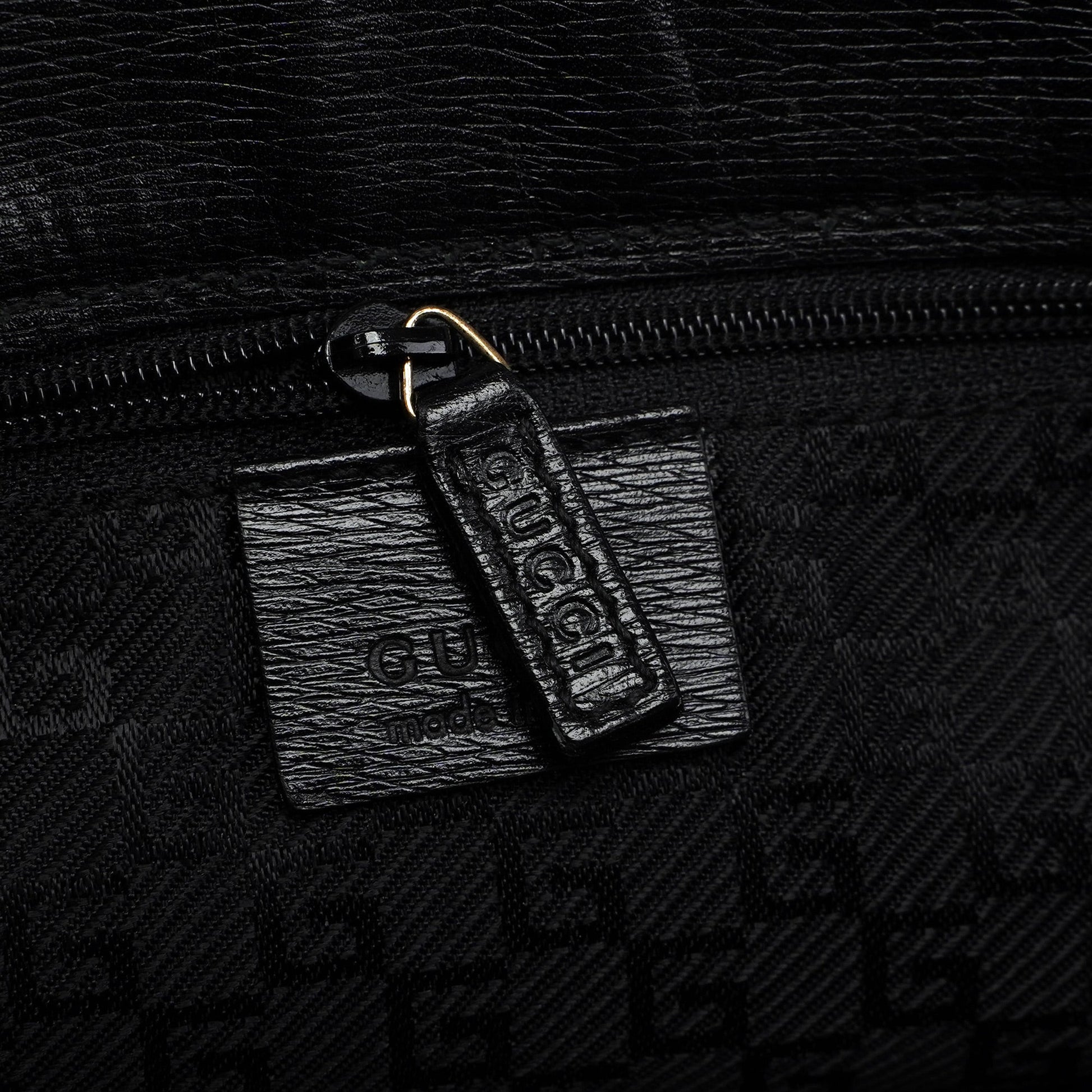 Handcrafted from gloss textured black leather, this Gucci tote bag by Tom Ford from the late 1990s features gold-tone hardware engraved with the Gucci logo. The interior is lined in satin and includes an interior zipper pocket, showcasing timeless elegance.