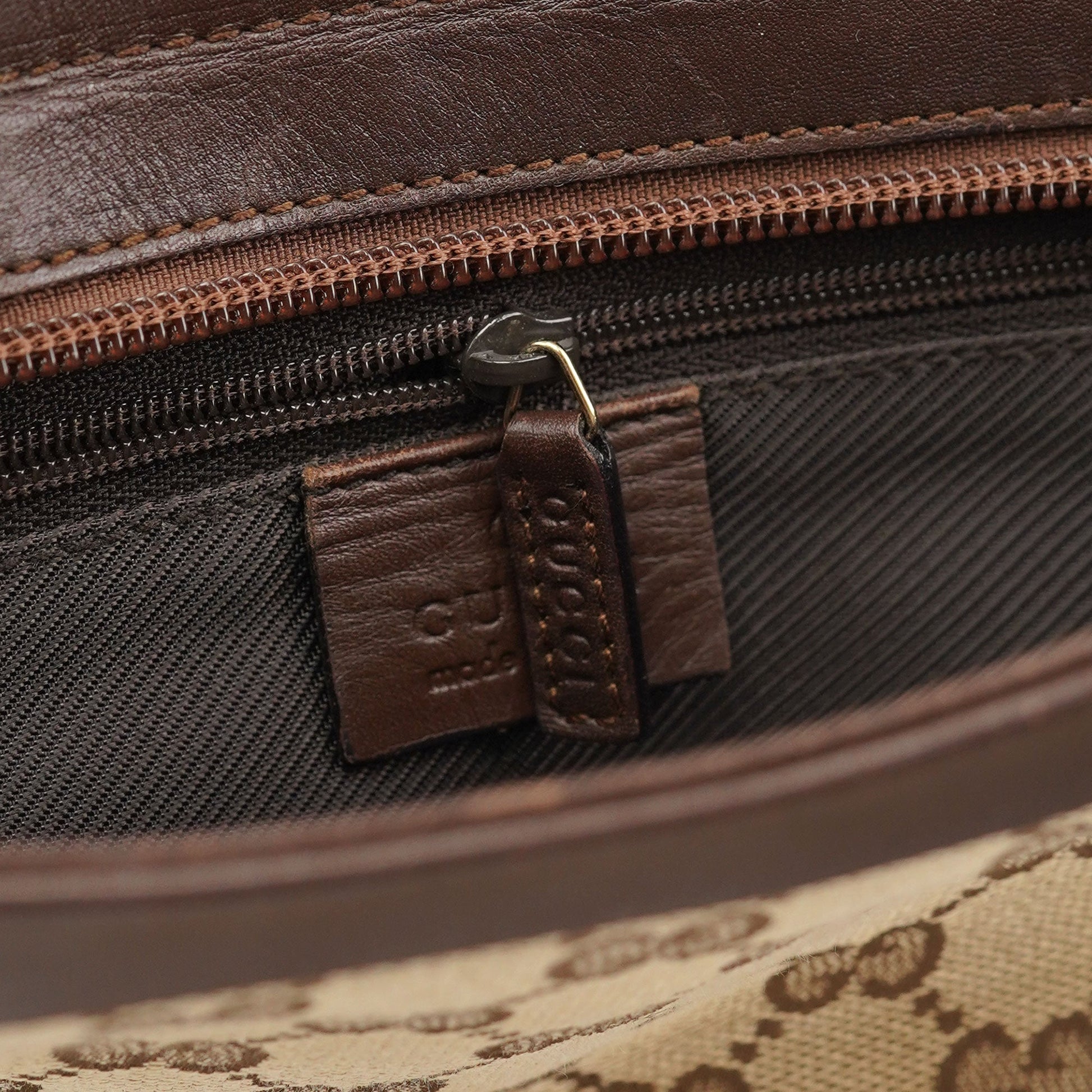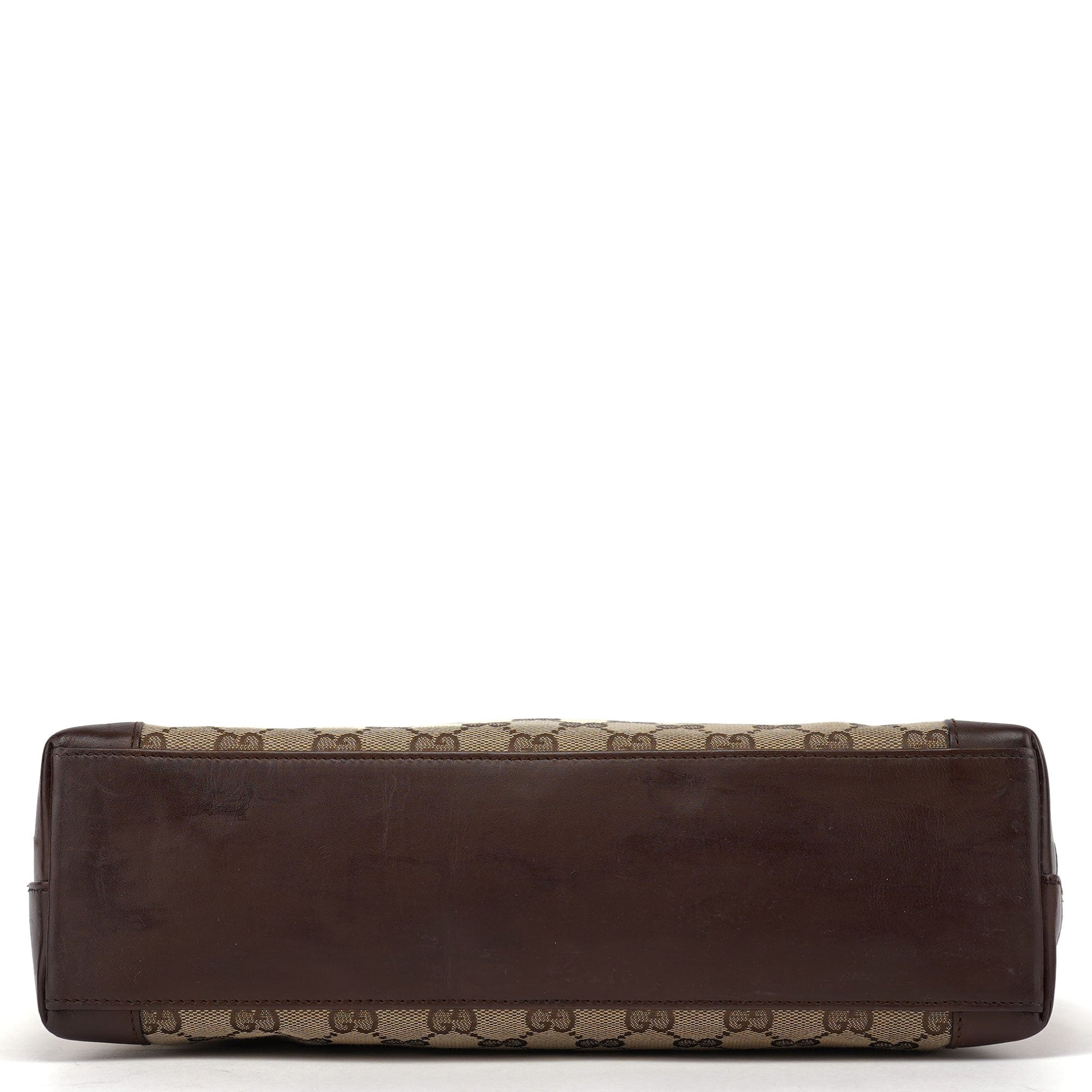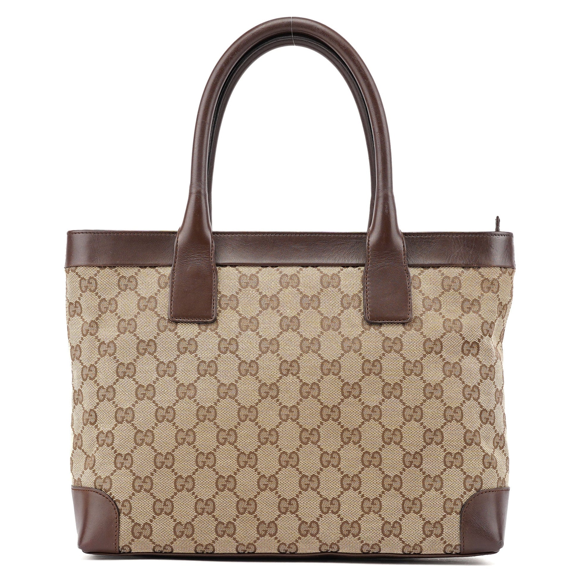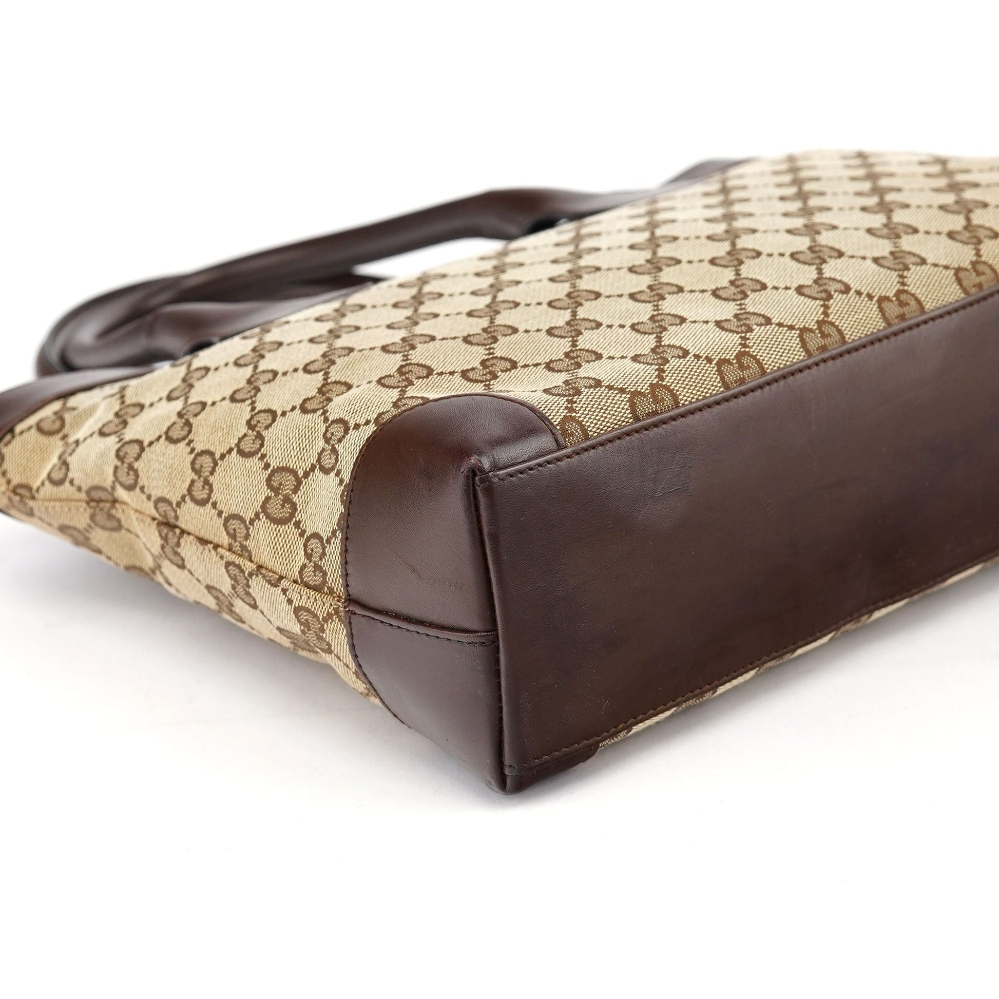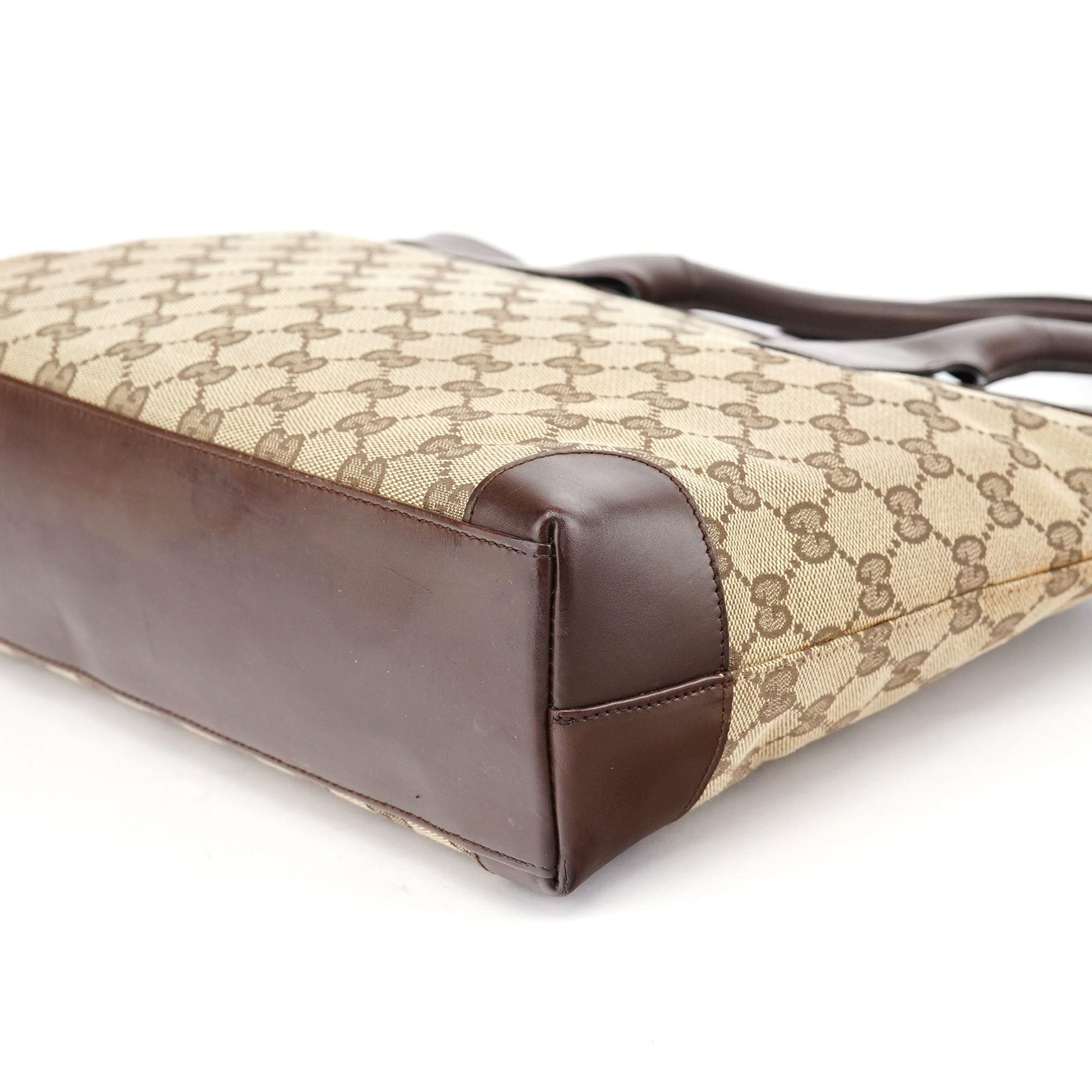 Designed by Tom Ford in the late 1990s, this Gucci GG monogram tote bag is handcrafted from beige GG monogram canvas with brown calfskin leather trim. It features silver-tone hardware, a secure zipper closure, and a cotton-lined interior with an interior zipper pocket, blending timeless elegance with practicality.