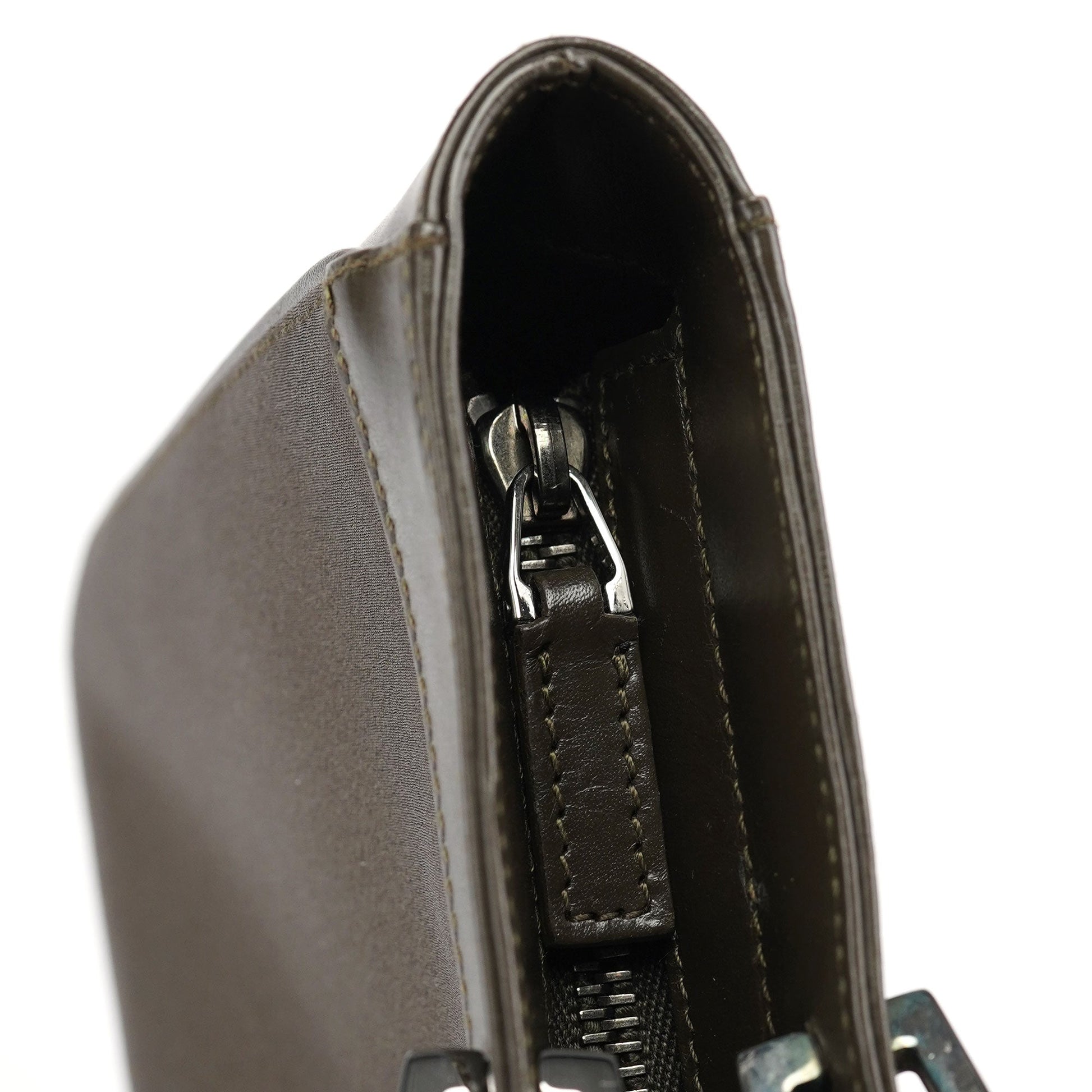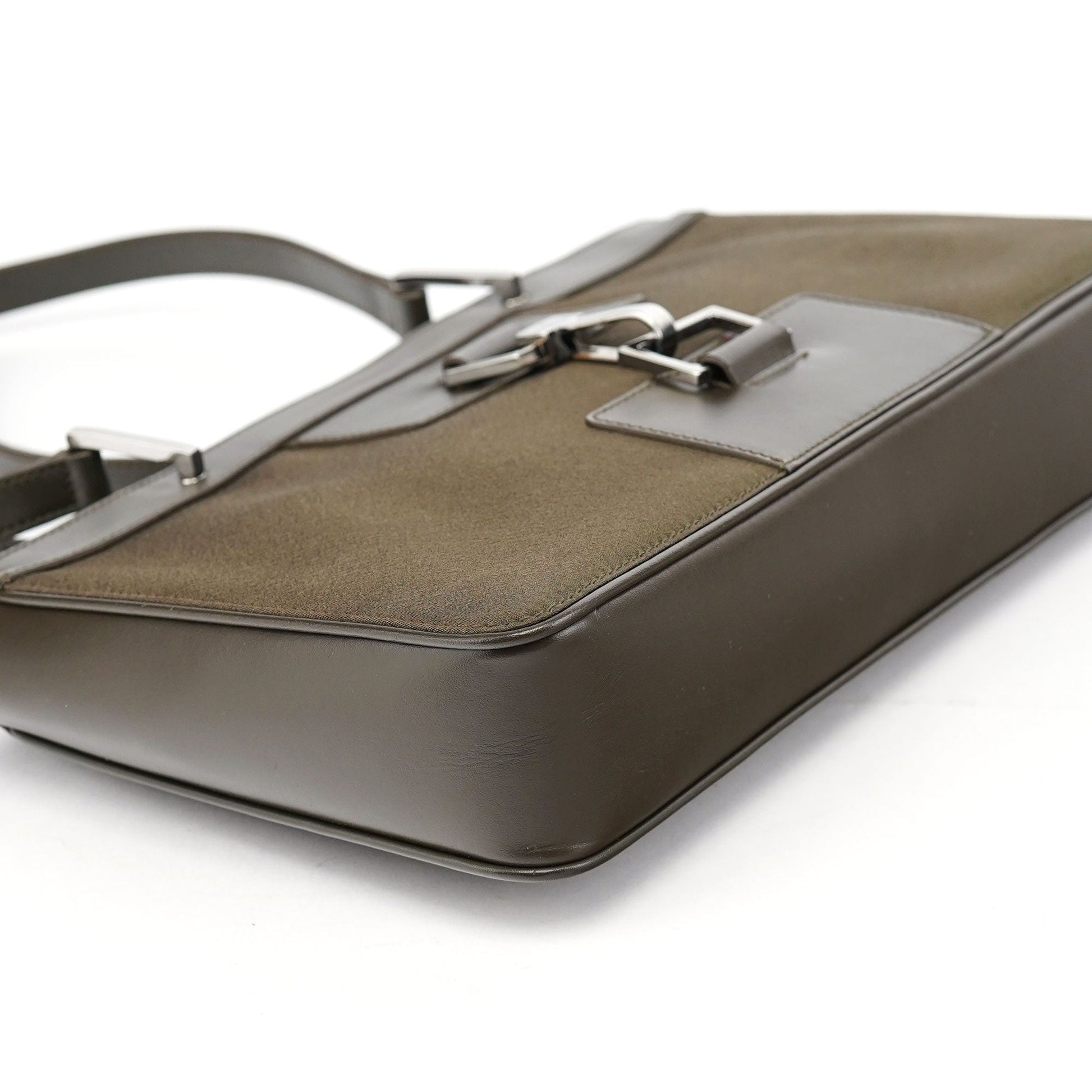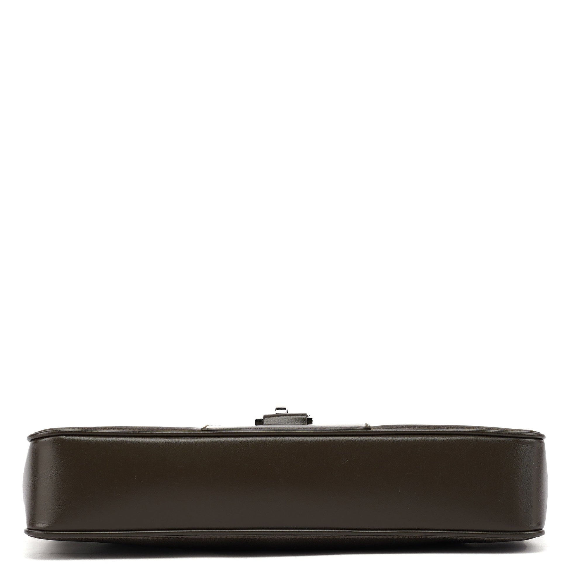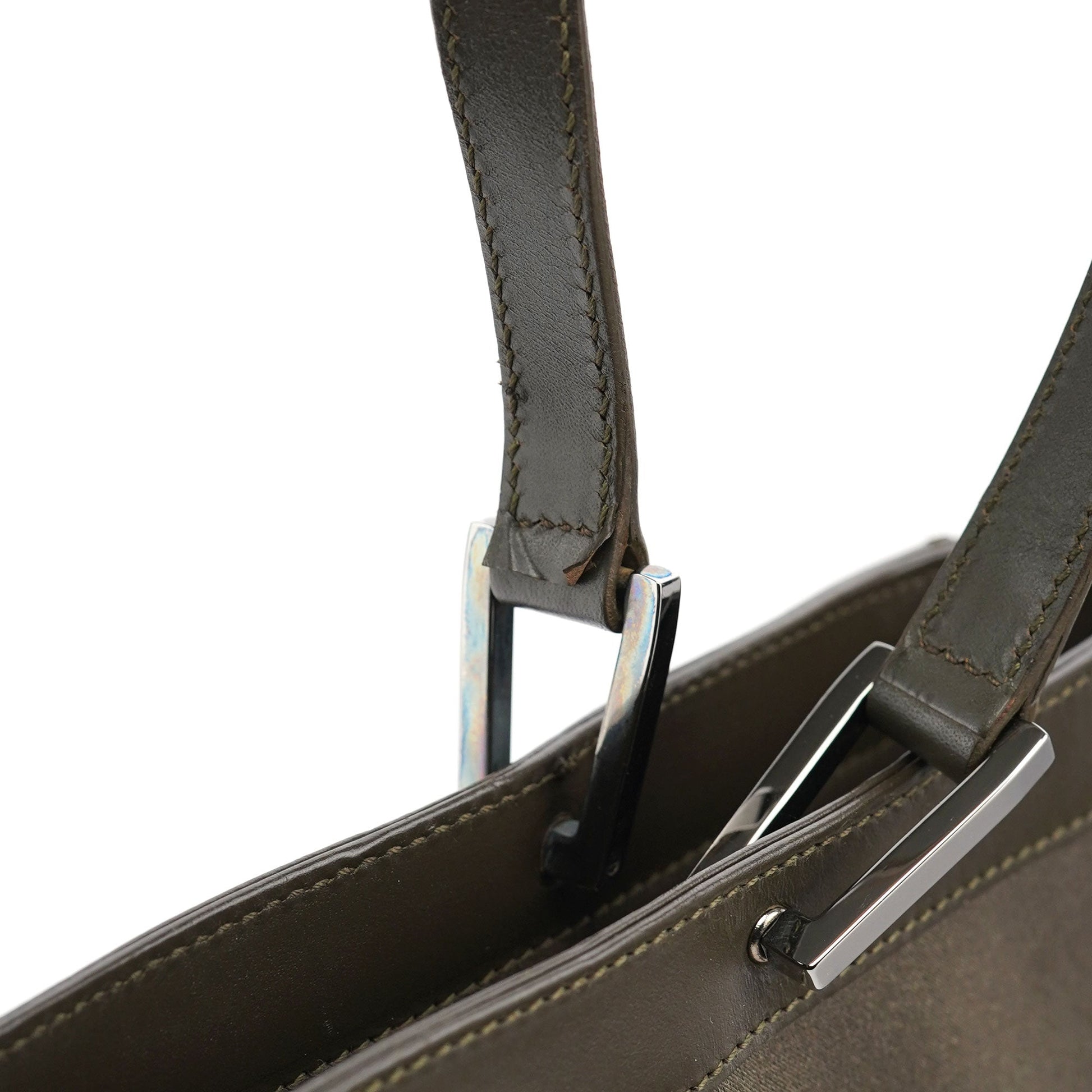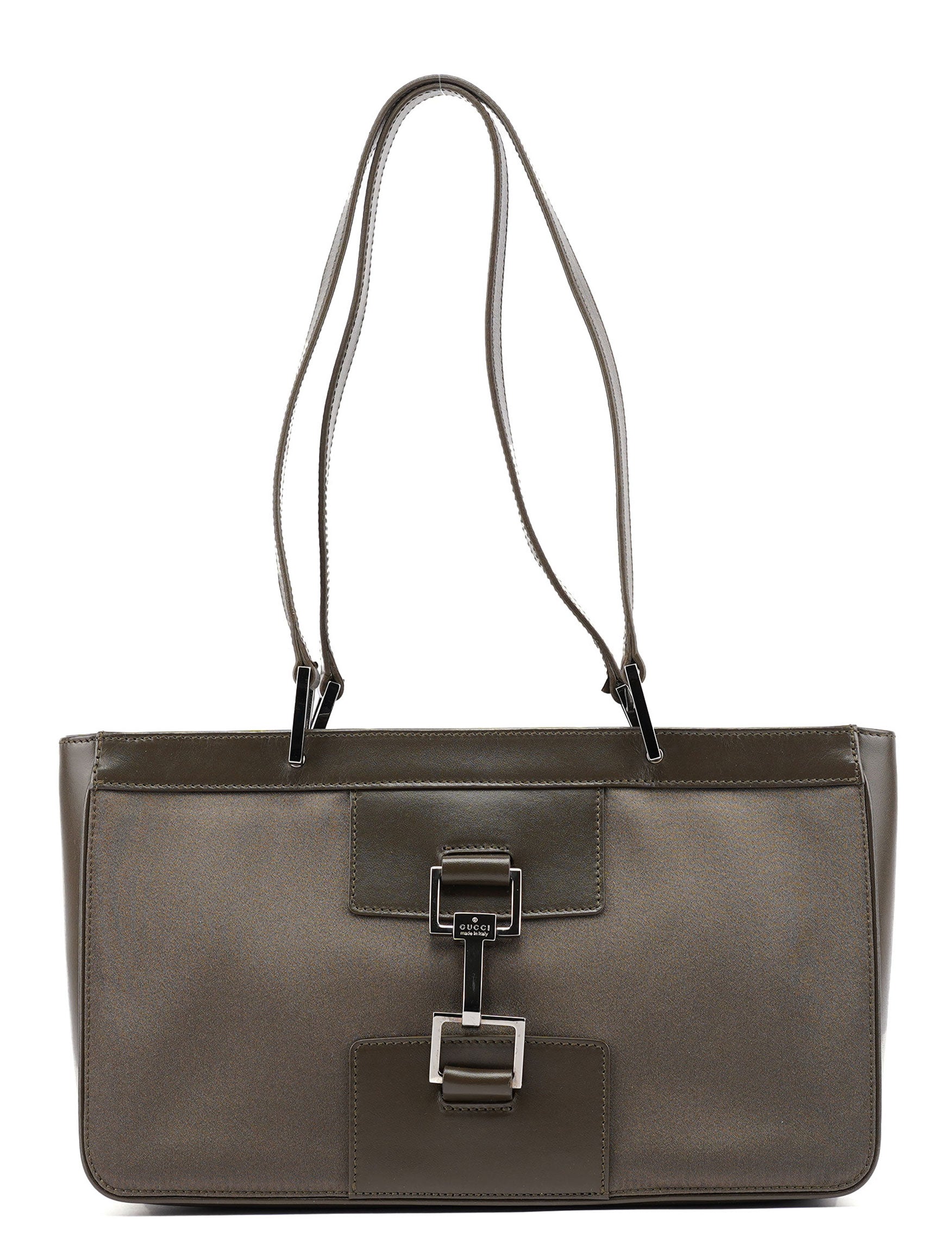 Designed by Tom Ford in the early 2000s, this Gucci Jackie tote is handcrafted from olive green satin with matching calfskin leather trim. It features silver-tone hardware engraved with the Gucci logo, the iconic Jackie clasp, and a practical zipper closure. The calfskin-lined interior includes a zipper pocket for essentials.