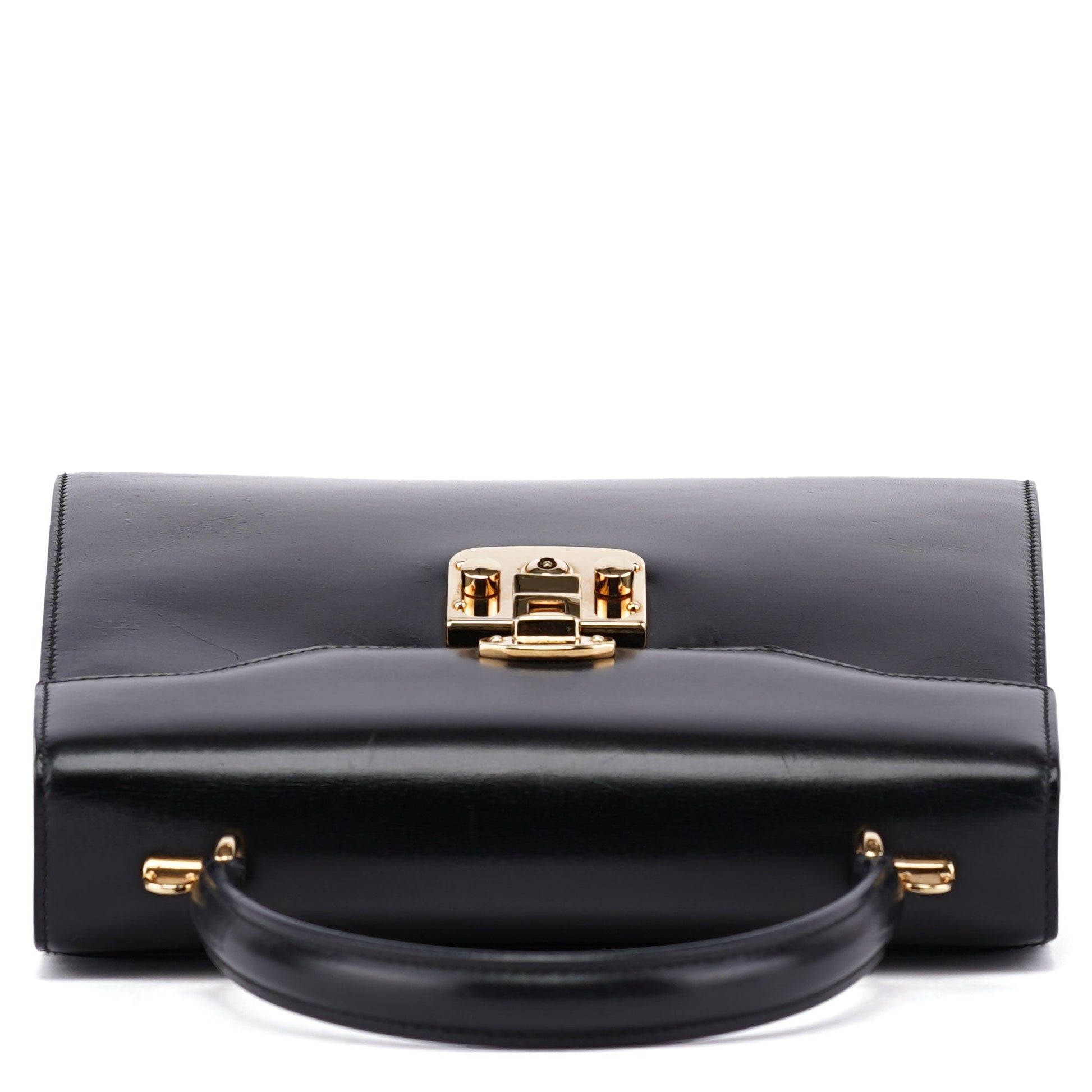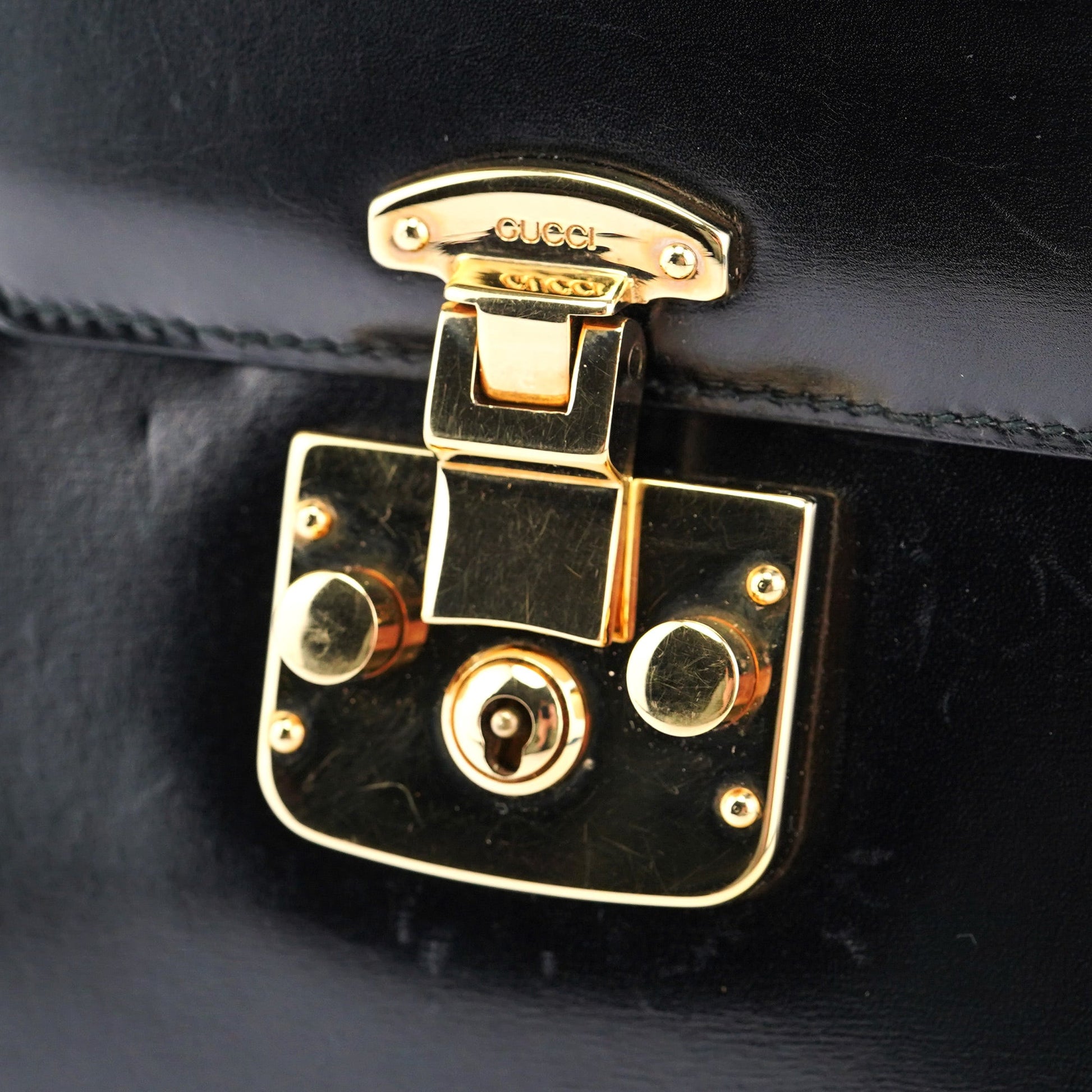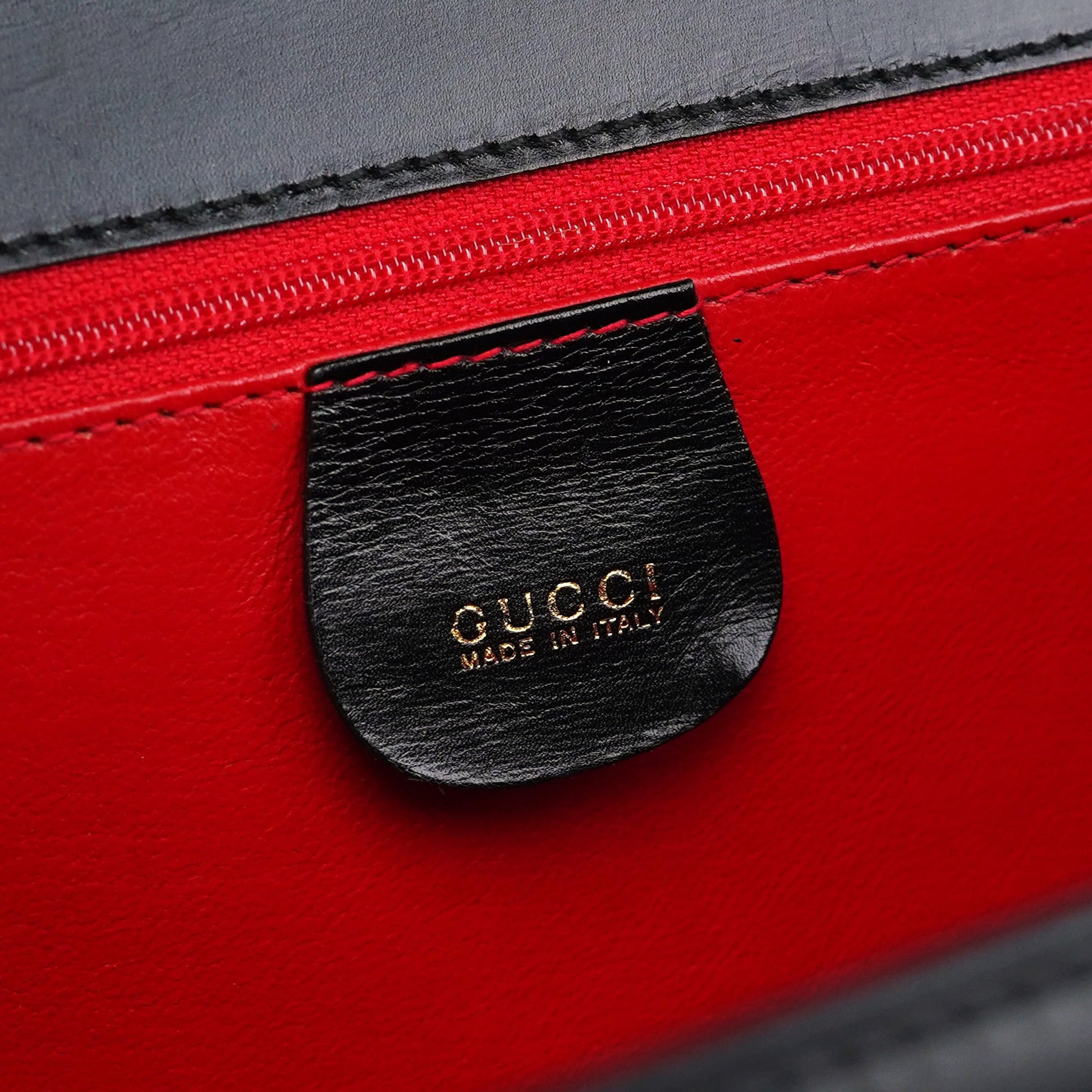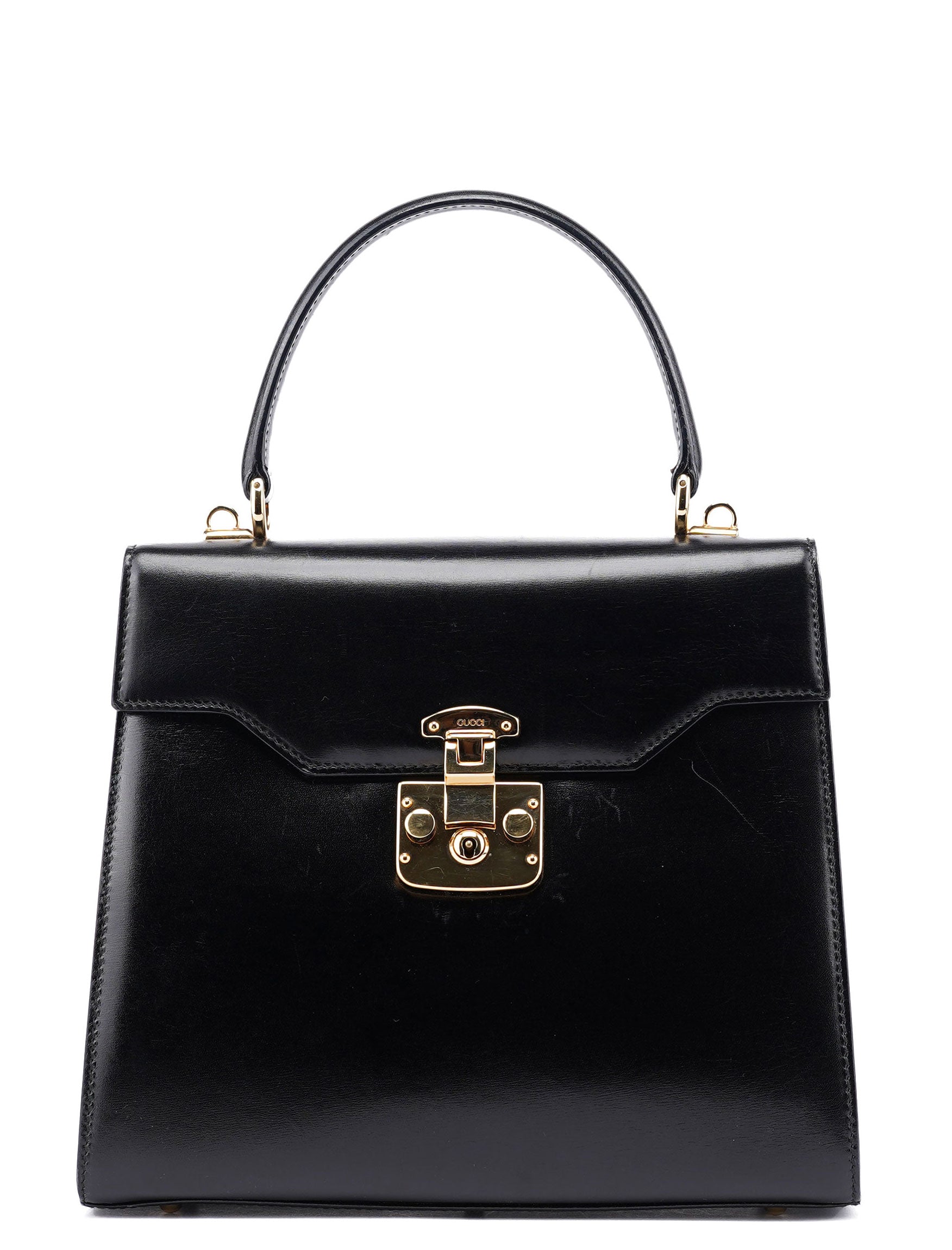 Designed by Tom Ford in the mid-1990s, the Gucci Lady Lock top handle bag is handcrafted from black calfskin leather and adorned with gold-tone hardware engraved with the Gucci logo. It features the classic Lady Lock closure and a versatile top handle. The interior, lined in vibrant red calfskin leather, adds a striking touch of luxury to this iconic design.
