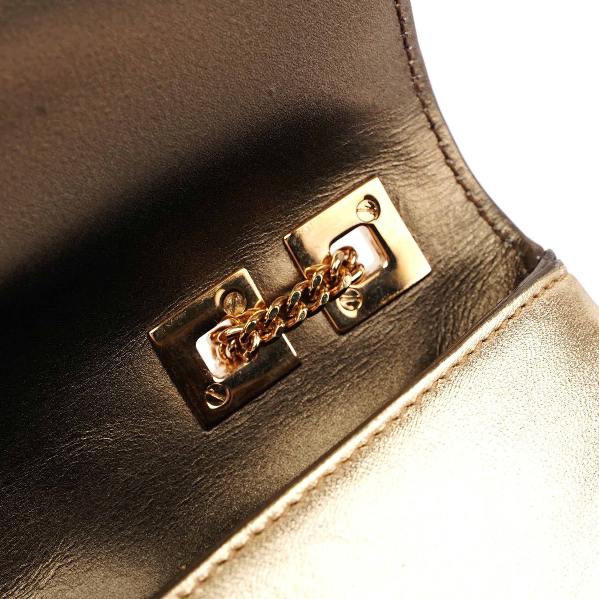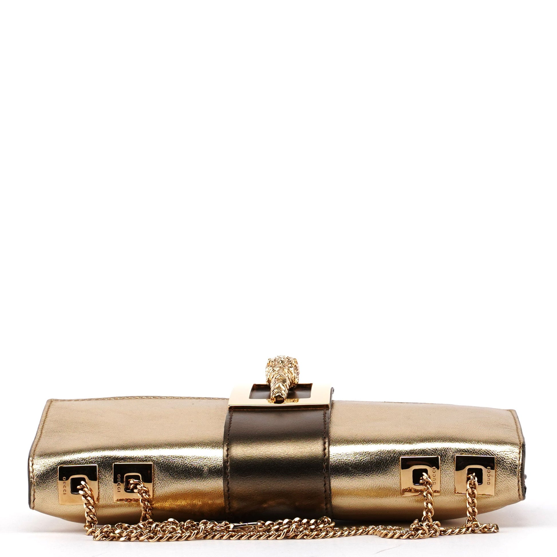 Handcrafted from golden calfskin leather, this Gucci Vitello Tiger bag by Tom Ford designed for the iconic 2004 collection features a gold-tone chain handle and a tiger front buckle. The magnetic closure opens to a satin-lined interior with an interior pocket, showcasing timeless elegance. The chain handle allows you to wear the bag as a shoulder bag, a handbag and as a crossbody bag.