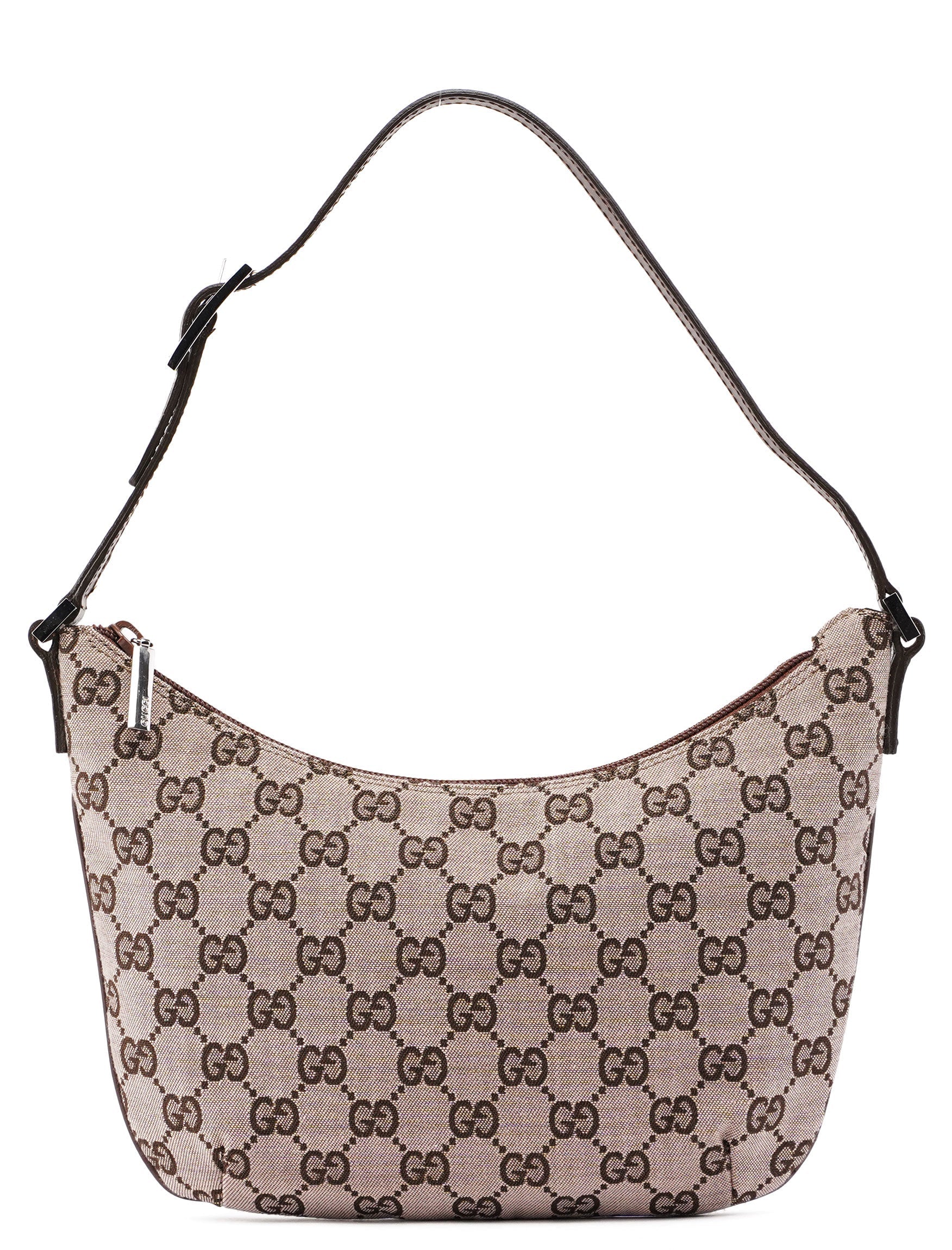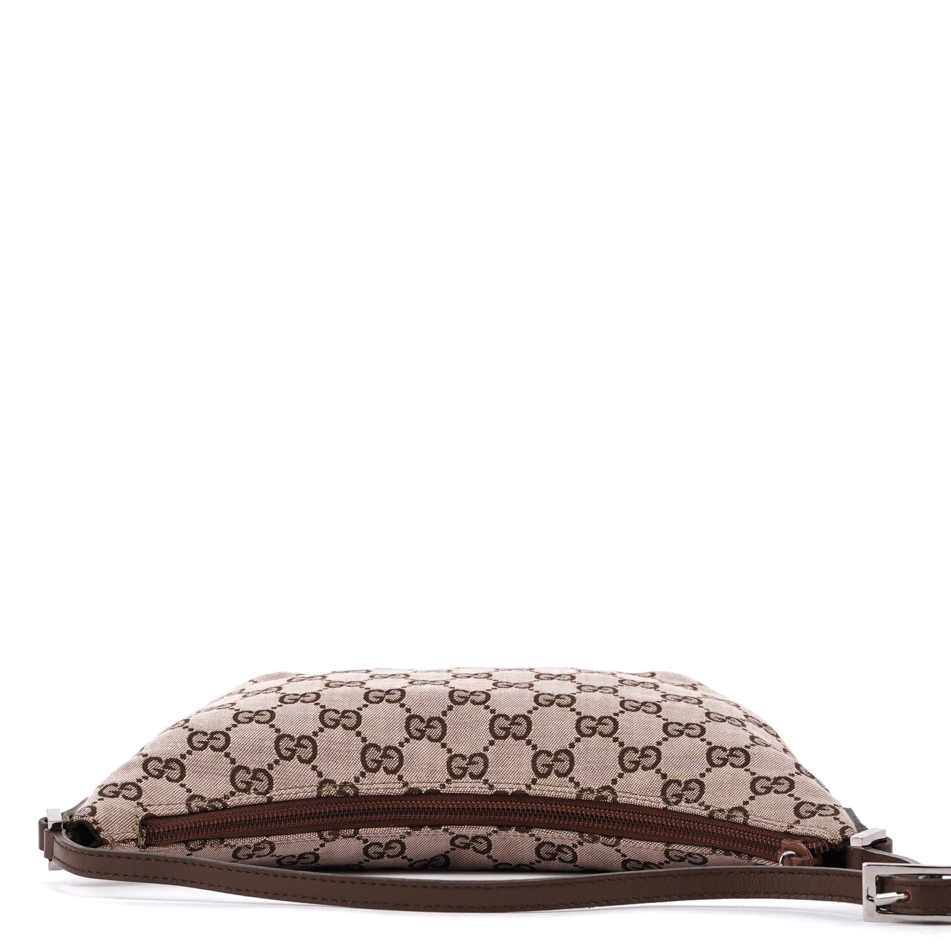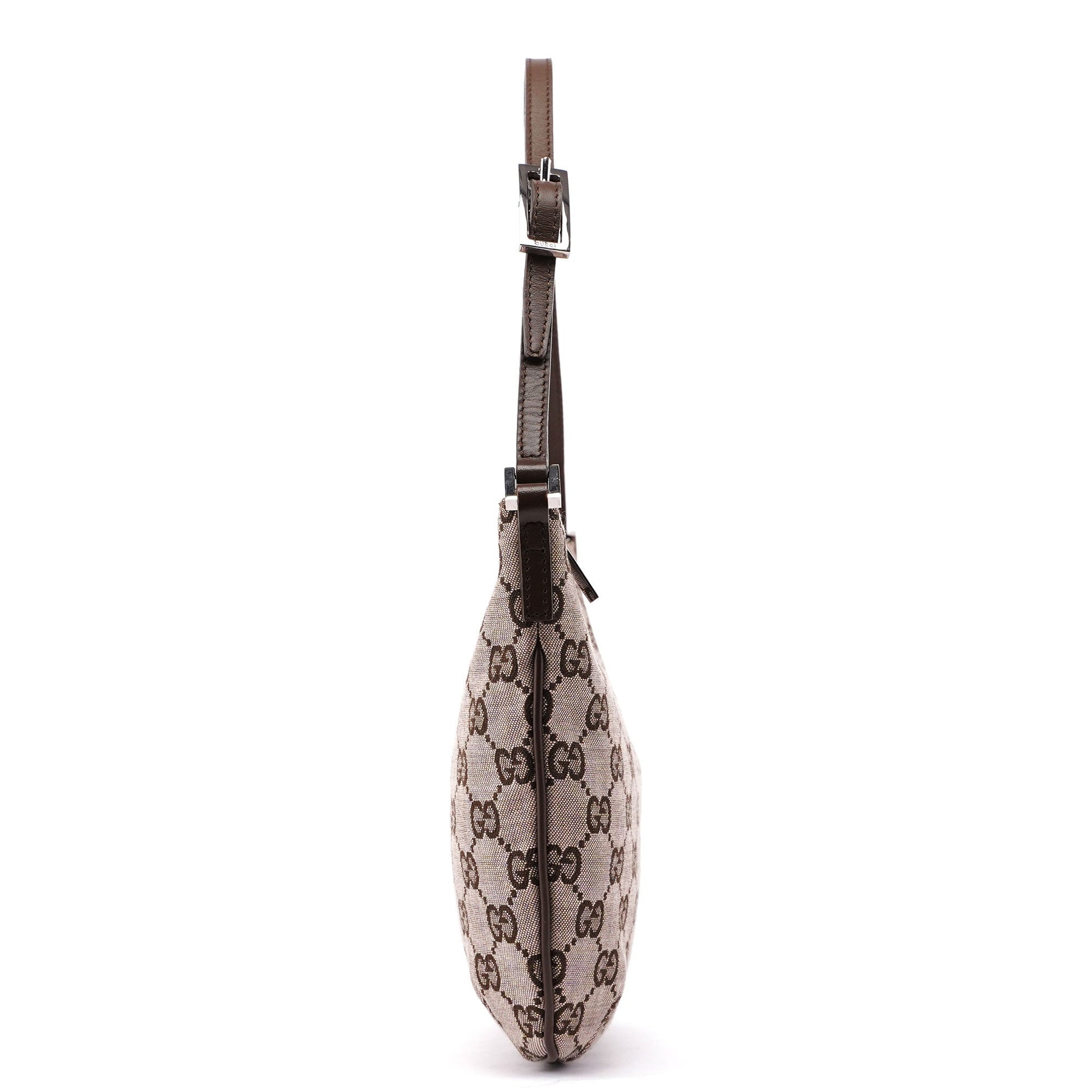 Designed by Tom Ford in the late 1990's, this Gucci GG shoulder bag is crafted from the iconic beige GG monogram canvas with brown leather trim. Its silver-tone hardware adds a touch of elegance, while the satin-lined interior features a convenient pocket for organization.