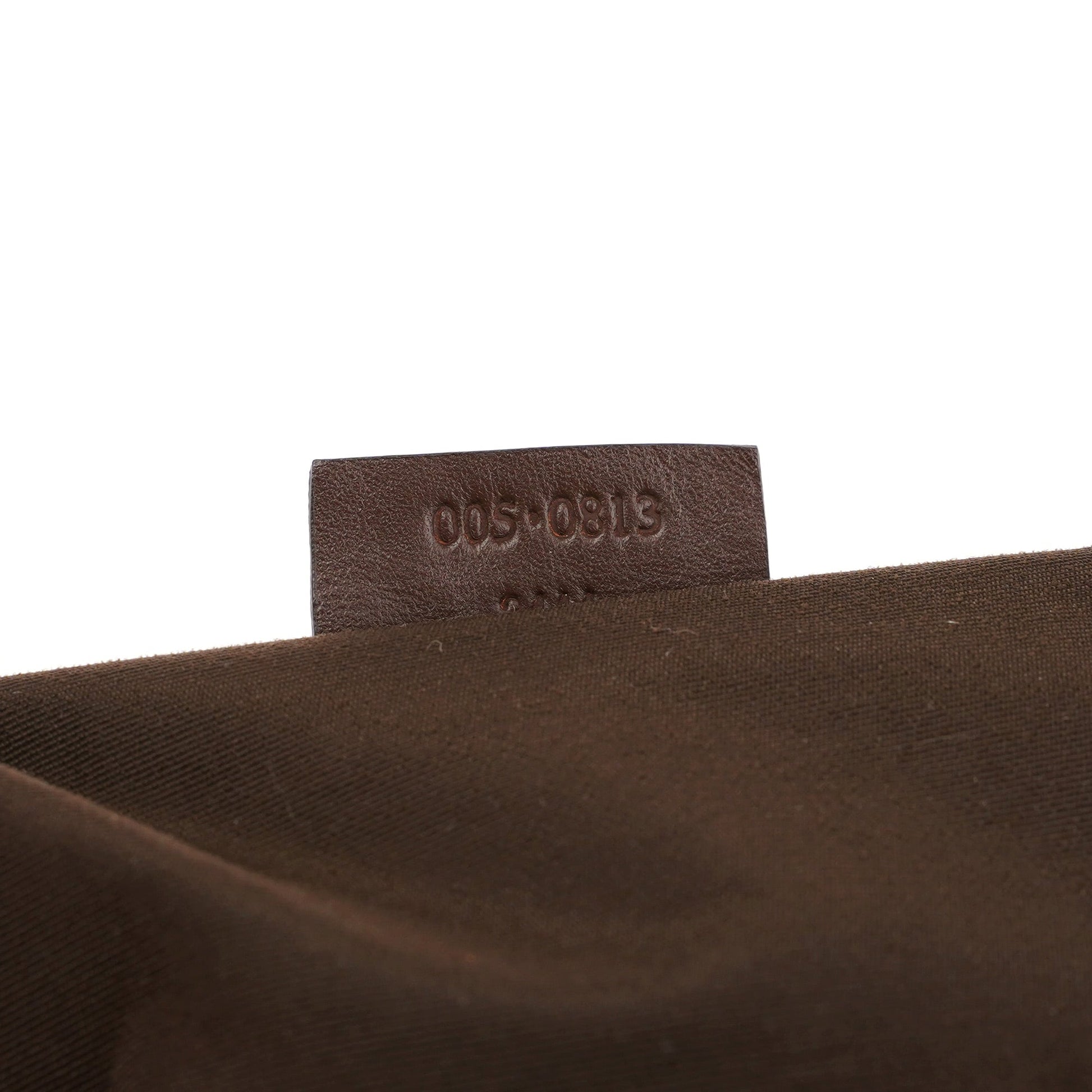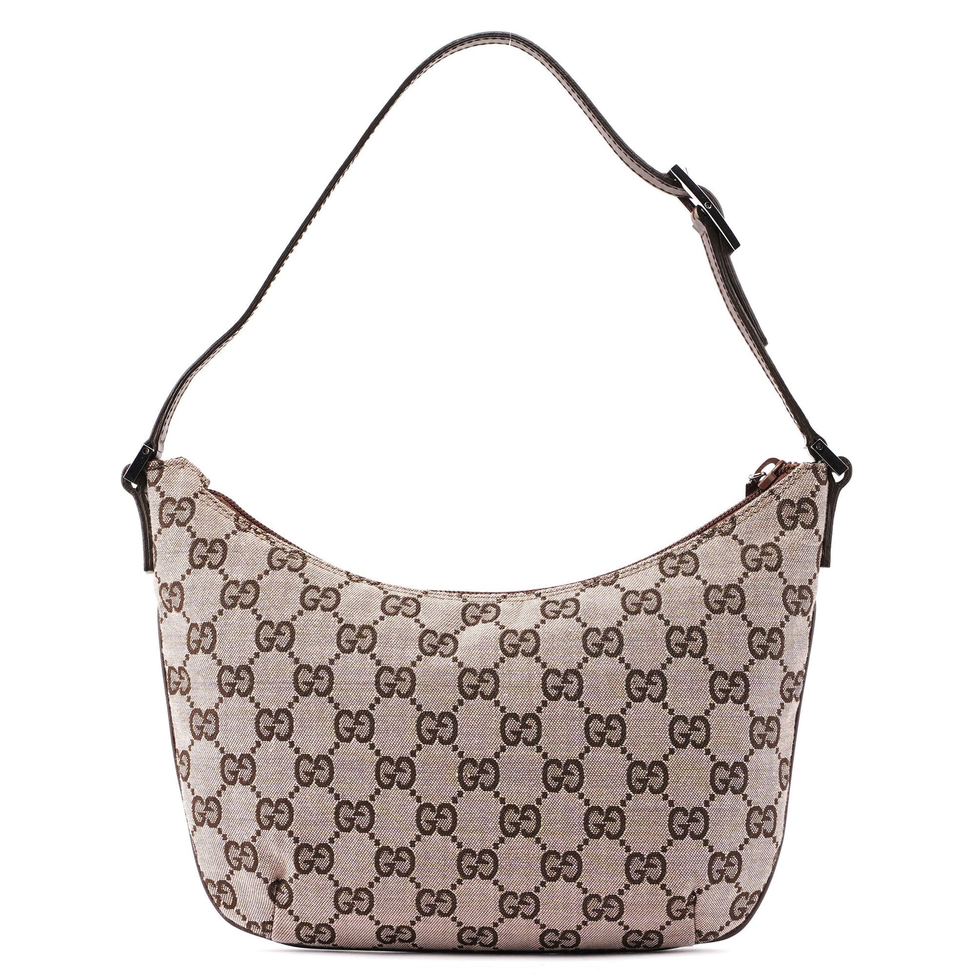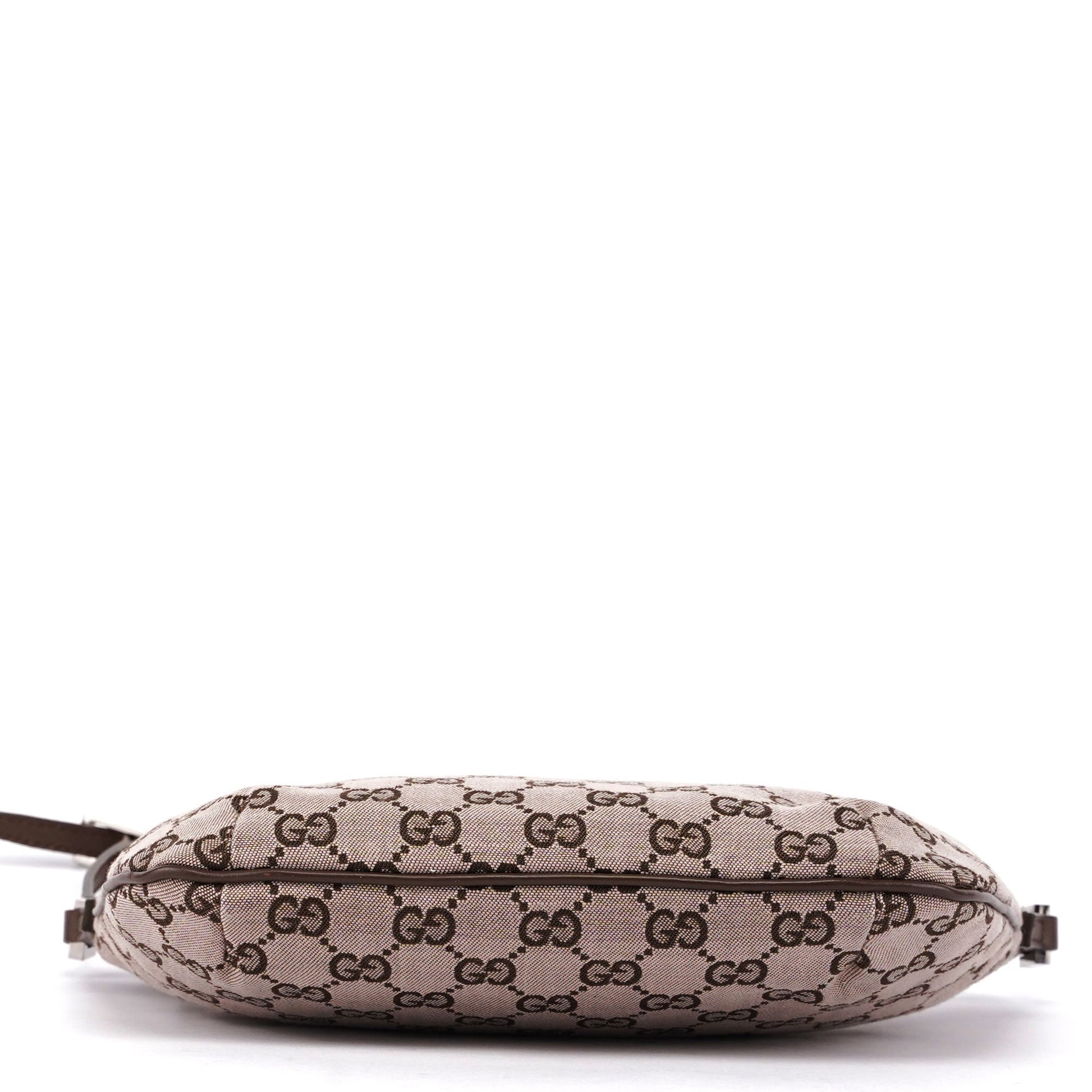 Designed by Tom Ford in the late 1990's, this Gucci GG shoulder bag is crafted from the iconic beige GG monogram canvas with brown leather trim. Its silver-tone hardware adds a touch of elegance, while the satin-lined interior features a convenient pocket for organization.