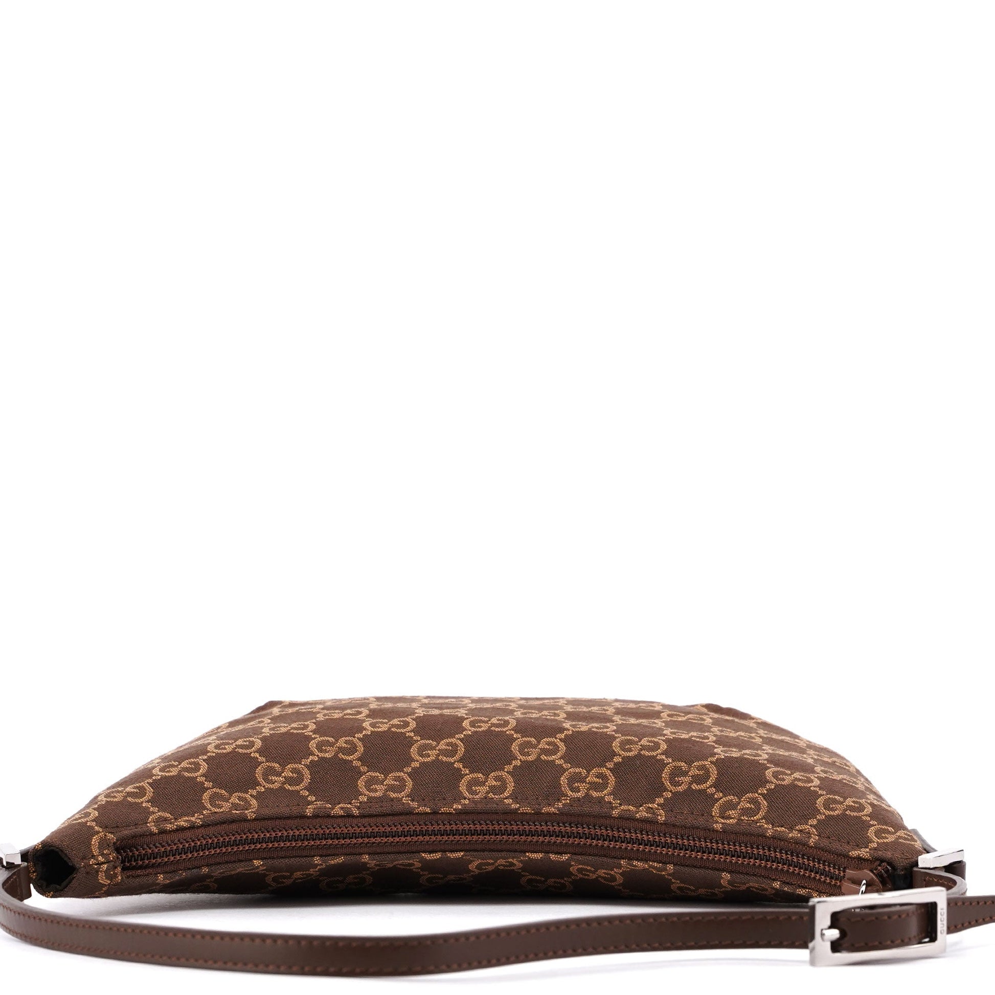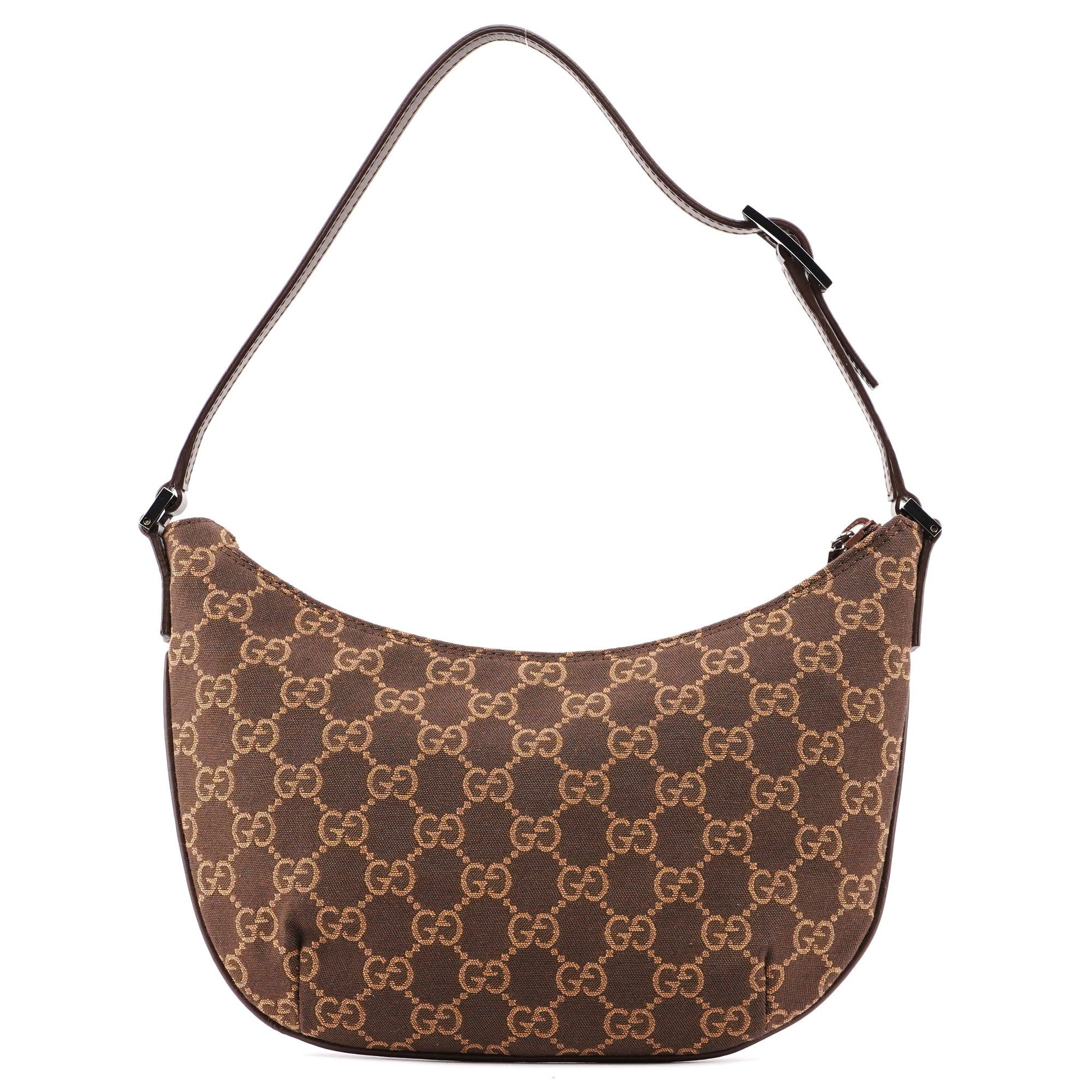 Designed by Tom Ford in the late 1990's, this Gucci GG shoulder bag is crafted from the iconic brown GG monogram canvas with tonal leather trim. Its silver-tone hardware adds a touch of elegance, while the satin-lined interior features a convenient pocket for organization.