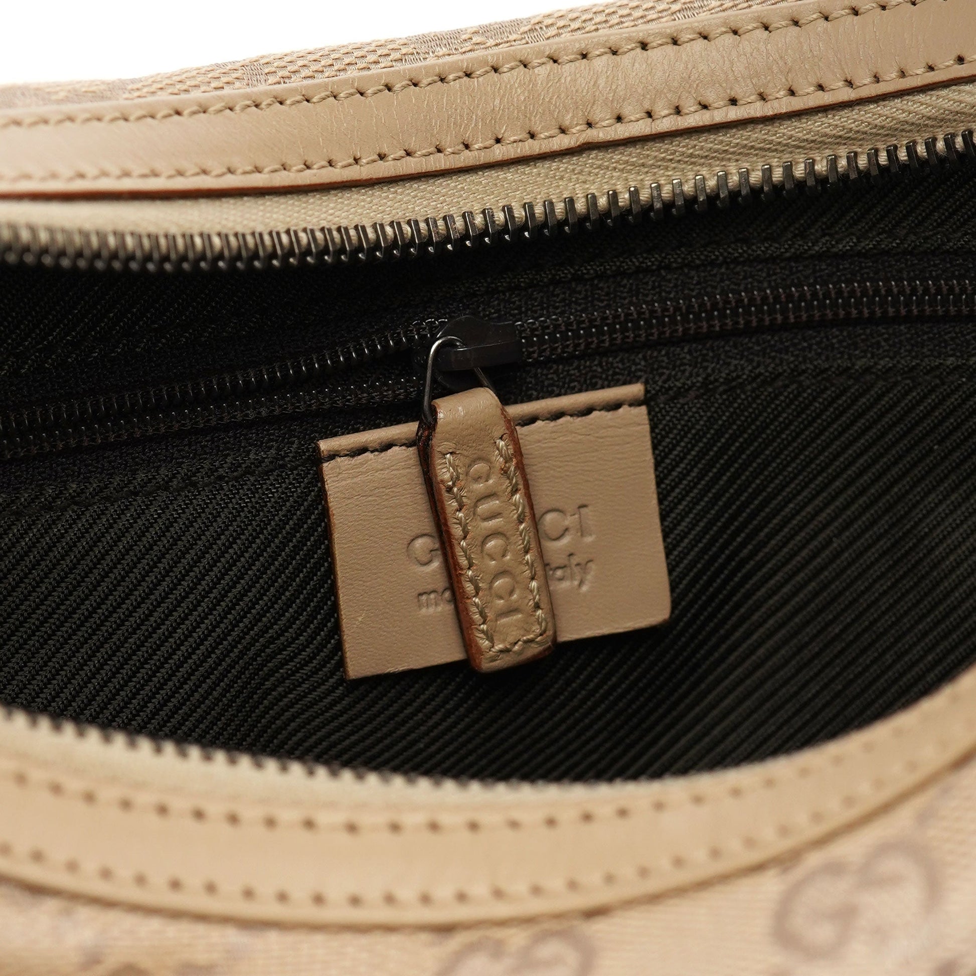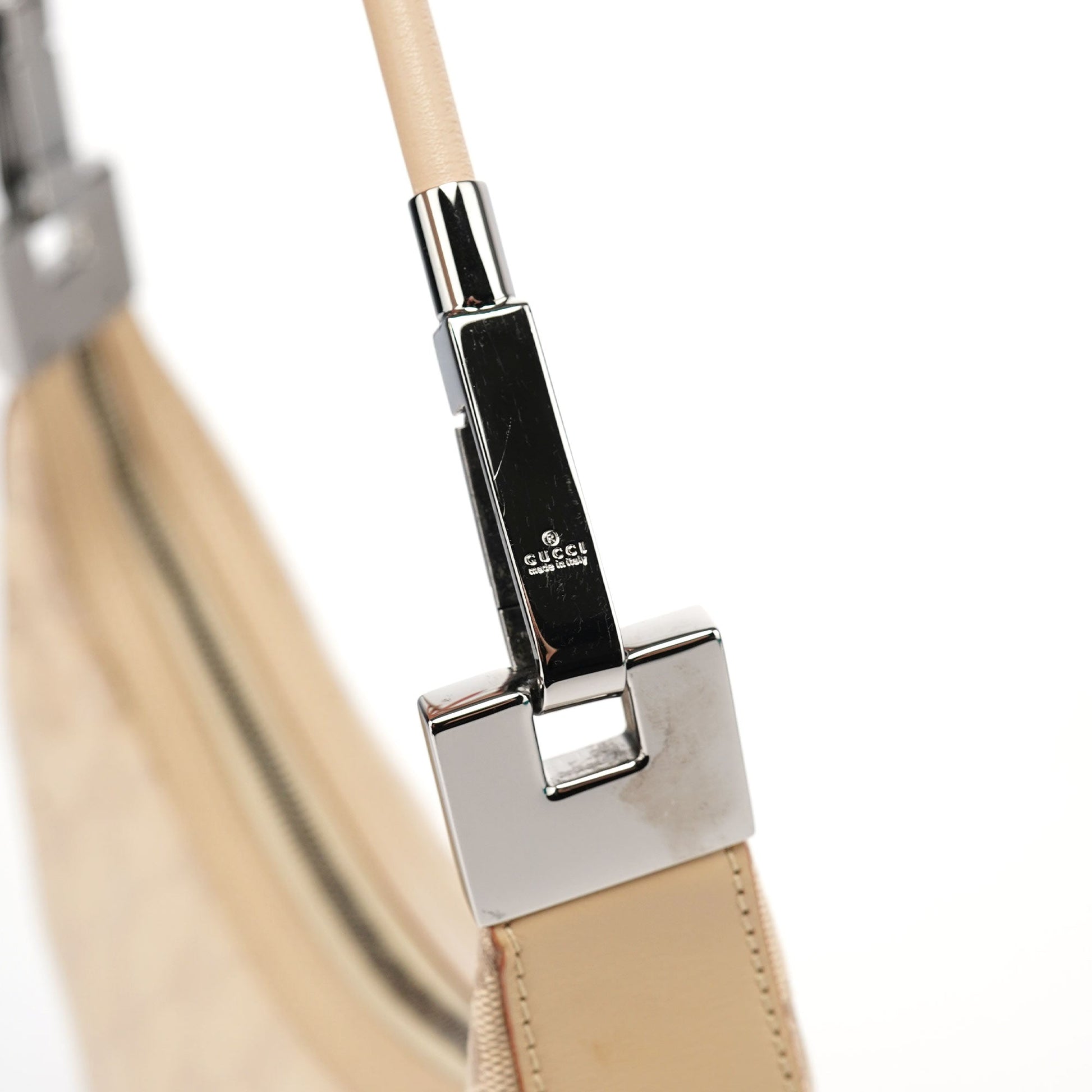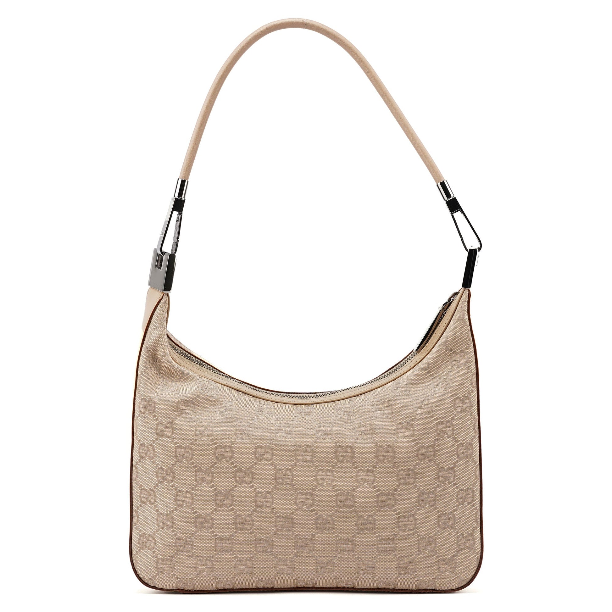 Designed by Tom Ford in the late 1990s, this Gucci GG monogram bag is crafted from beige GG canvas with tonal leather calfskin trim and silver-tone hardware engraved with the Gucci logo. It features a zipper closure, a cotton-lined interior, and an interior zipper pocket, showcasing timeless style and functional elegance.