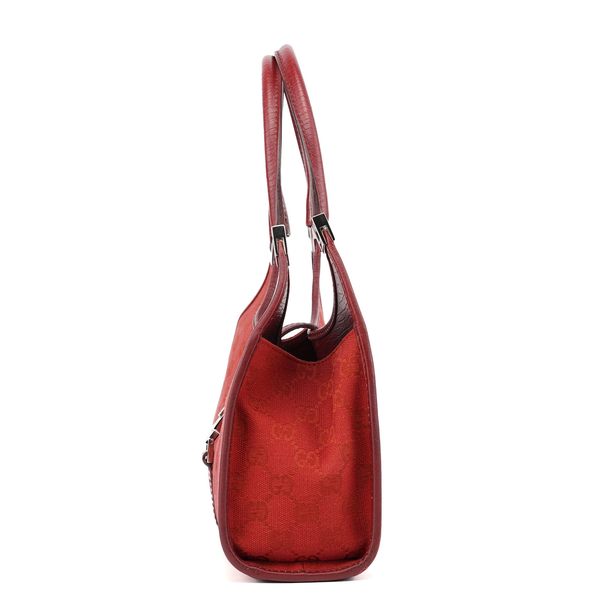 Designed by Tom Ford in the early 2000's, this iconic Jackie shoulder bag is handcrafted from red GG monogram canvas with tonal calfskin leather trim. It features silver-tone hardware engraved with the Gucci logo and the classic Jackie closure. The satin-lined interior includes a zipper pocket, adding to its refined design.