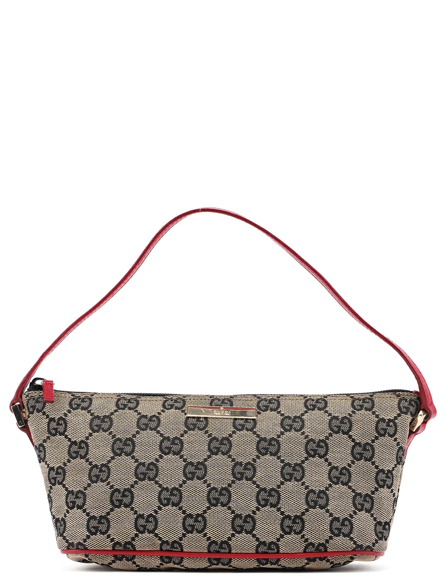 Explore timeless elegance with the Gucci GG Boat pochette by Tom Ford, circa late 1990s. This exquisite piece combines beige GG canvas with red leather trim and gold-tone hardware. Its secure zip closure and satin-lined interior offer luxury and practicality, while the subtle Gucci plaque adds a touch of heritage.