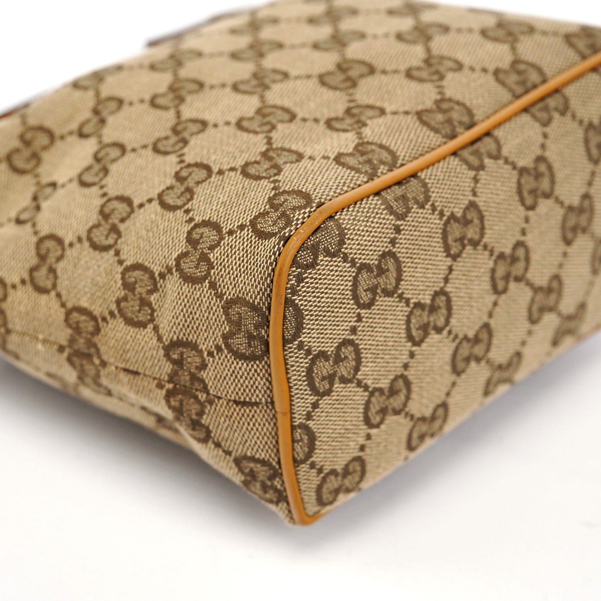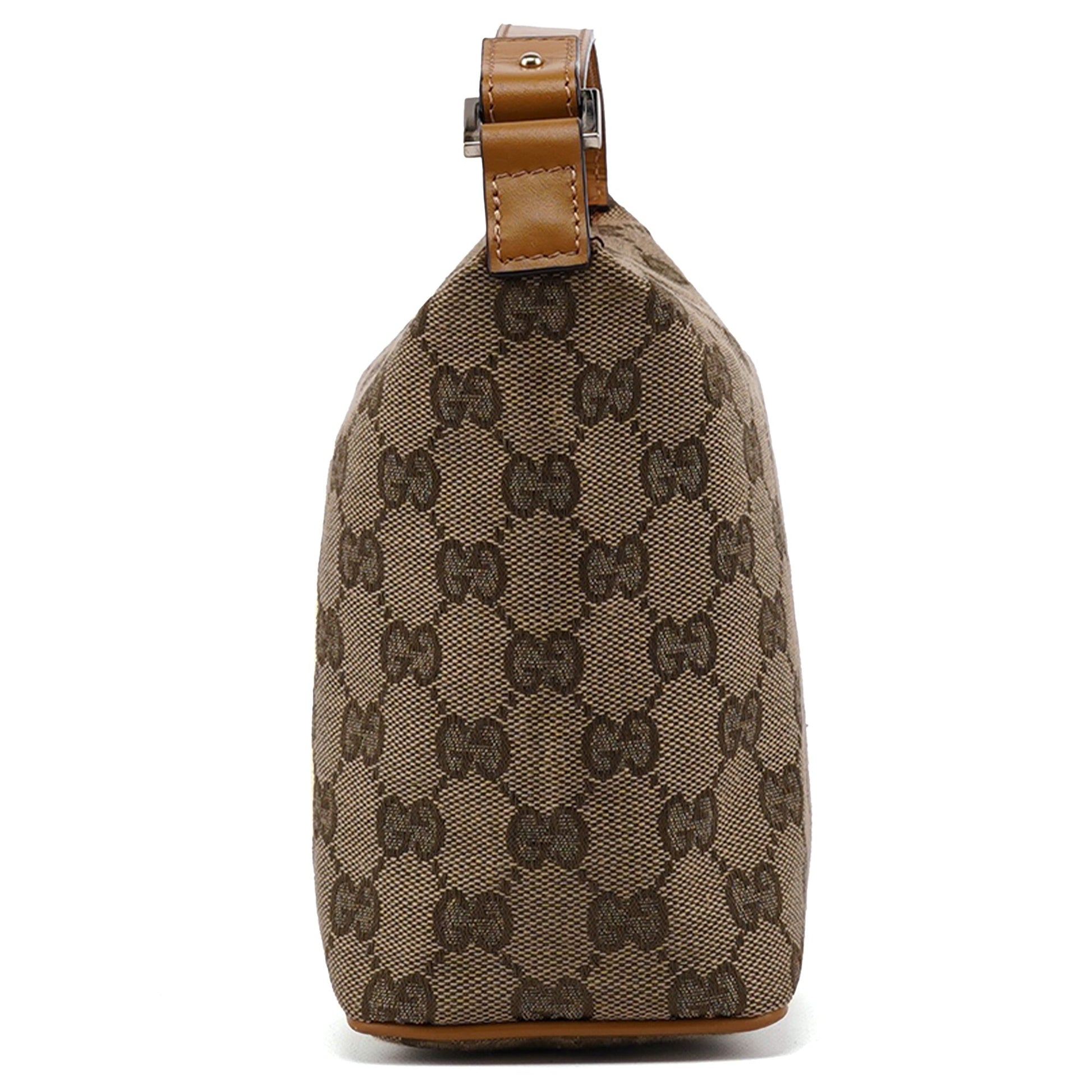 Designed by Tom Ford in the late 1990's, this Gucci GG handbag is handcrafted from the iconic beige GG monogram canvas with beige leather trim. Its silver-tone hardware adds a touch of elegance, while the satin-lined interior features a convenient pocket for organization.