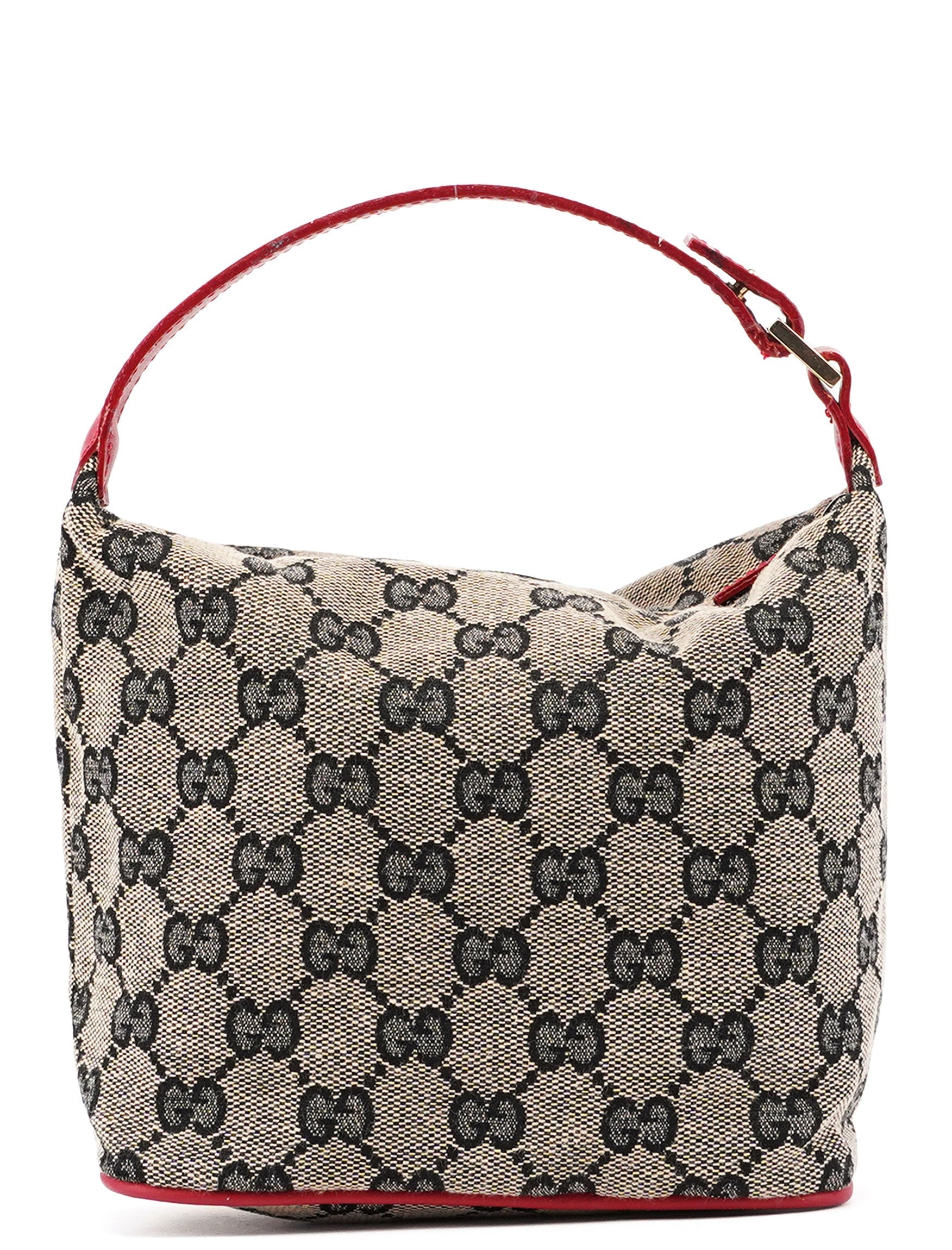 Designed by Tom Ford in the late 1990's, this Gucci GG shoulder bag is crafted from the iconic beige GG monogram canvas with red leather trim. Its silver-tone hardware adds a touch of elegance, while the satin-lined interior features a convenient pocket for organization.