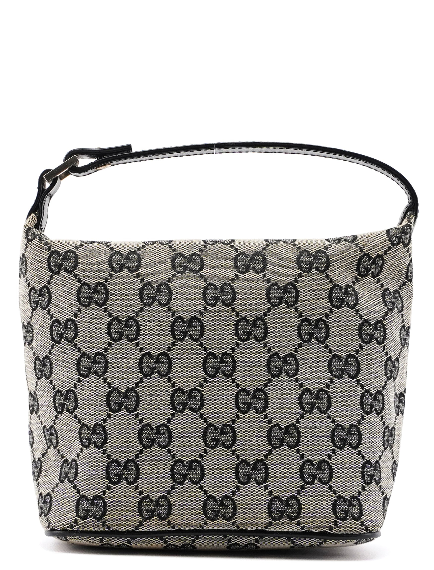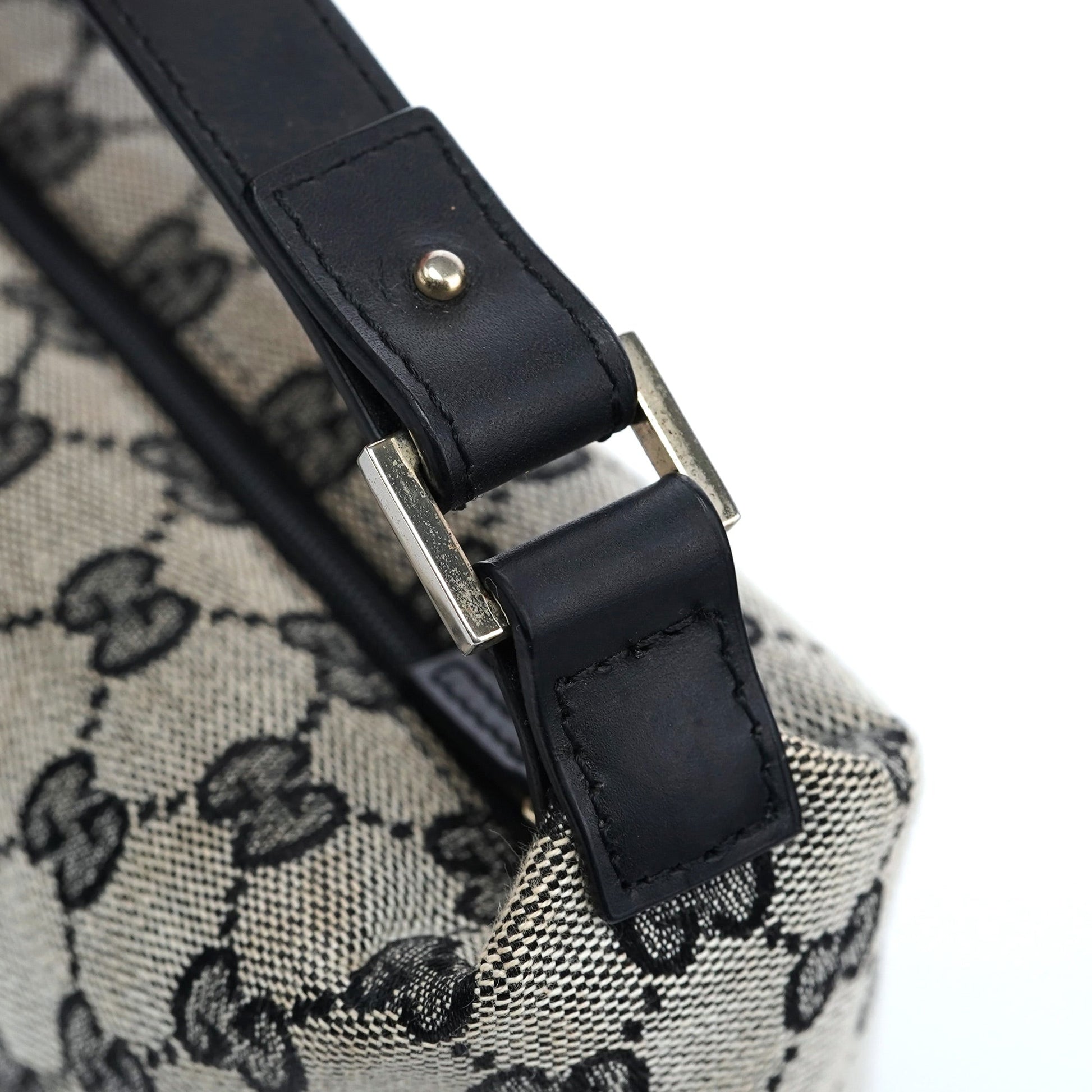 Designed by Tom Ford in the late 1990's, this Gucci GG shoulder bag is crafted from the iconic grey GG monogram canvas with black leather trim. Its silver-tone hardware adds a touch of elegance, while the satin-lined interior features a convenient pocket for organization.