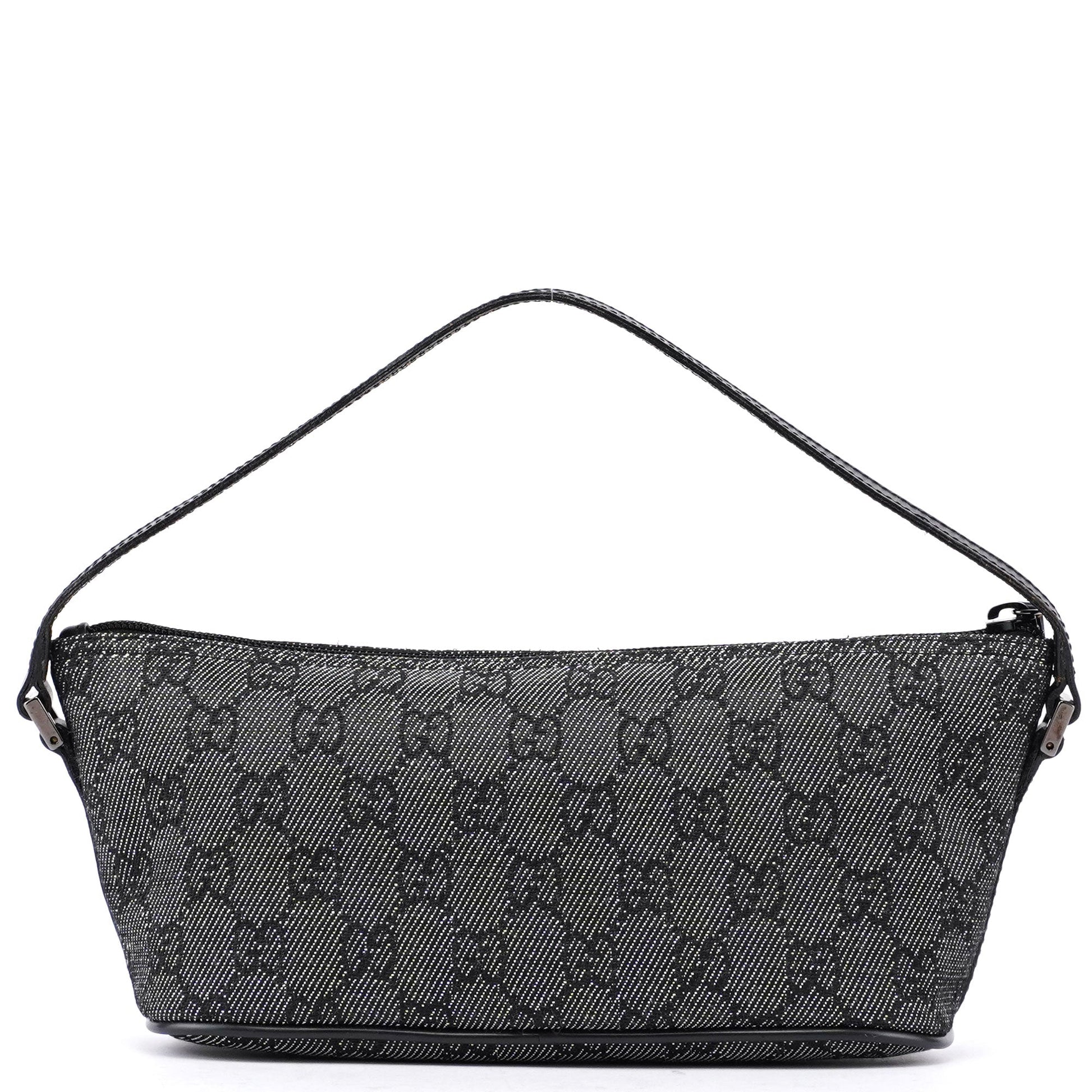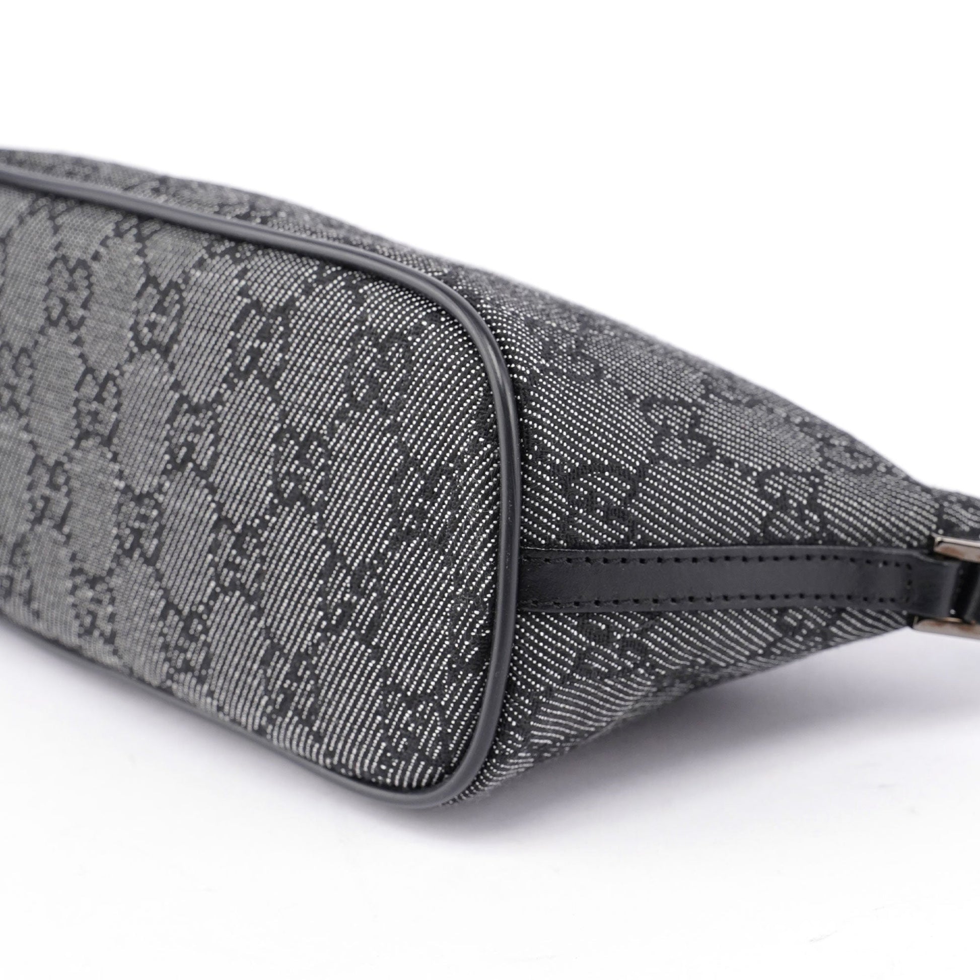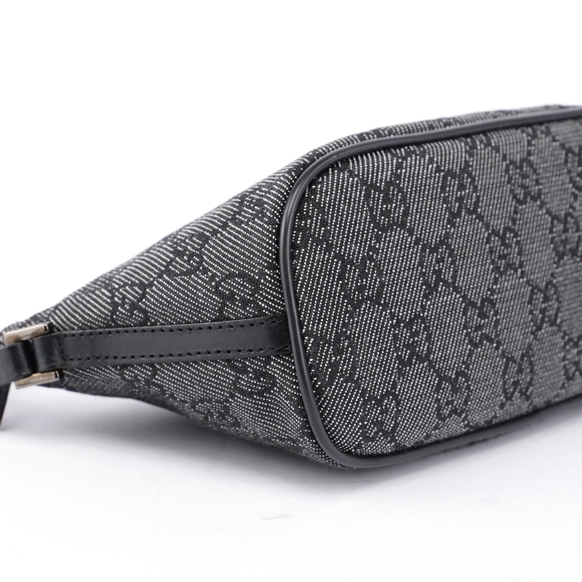 Explore timeless elegance with the Gucci GG Boat Pochette designed by Tom Ford, circa late 1990s. This exquisite piece combines anthracite GG denim with black leather trim and silver-tone hardware. Its secure zip closure and satin-lined interior offer luxury and practicality, while the subtle Gucci plaque adds a touch of heritage. A perfect blend of vintage charm and sophistication.