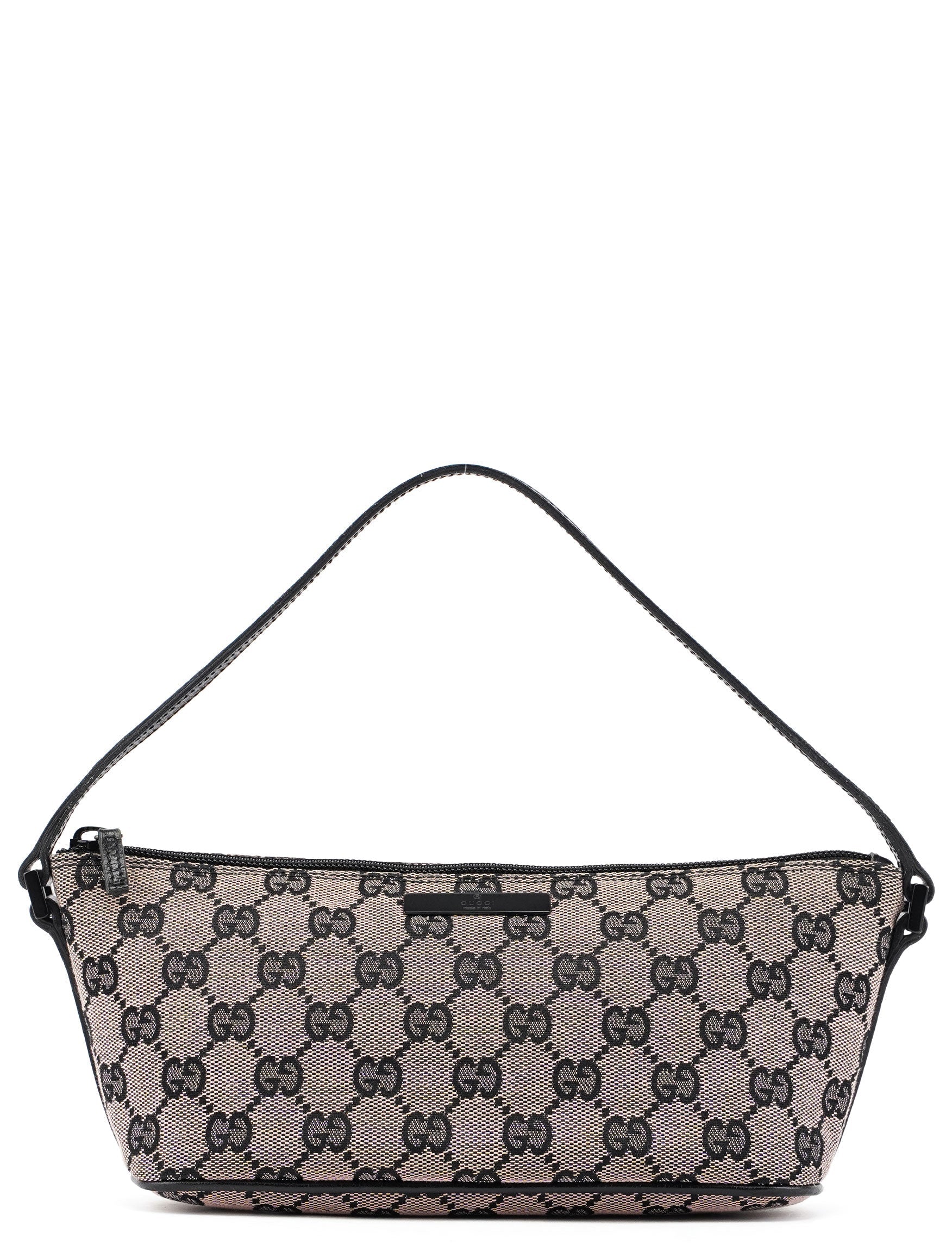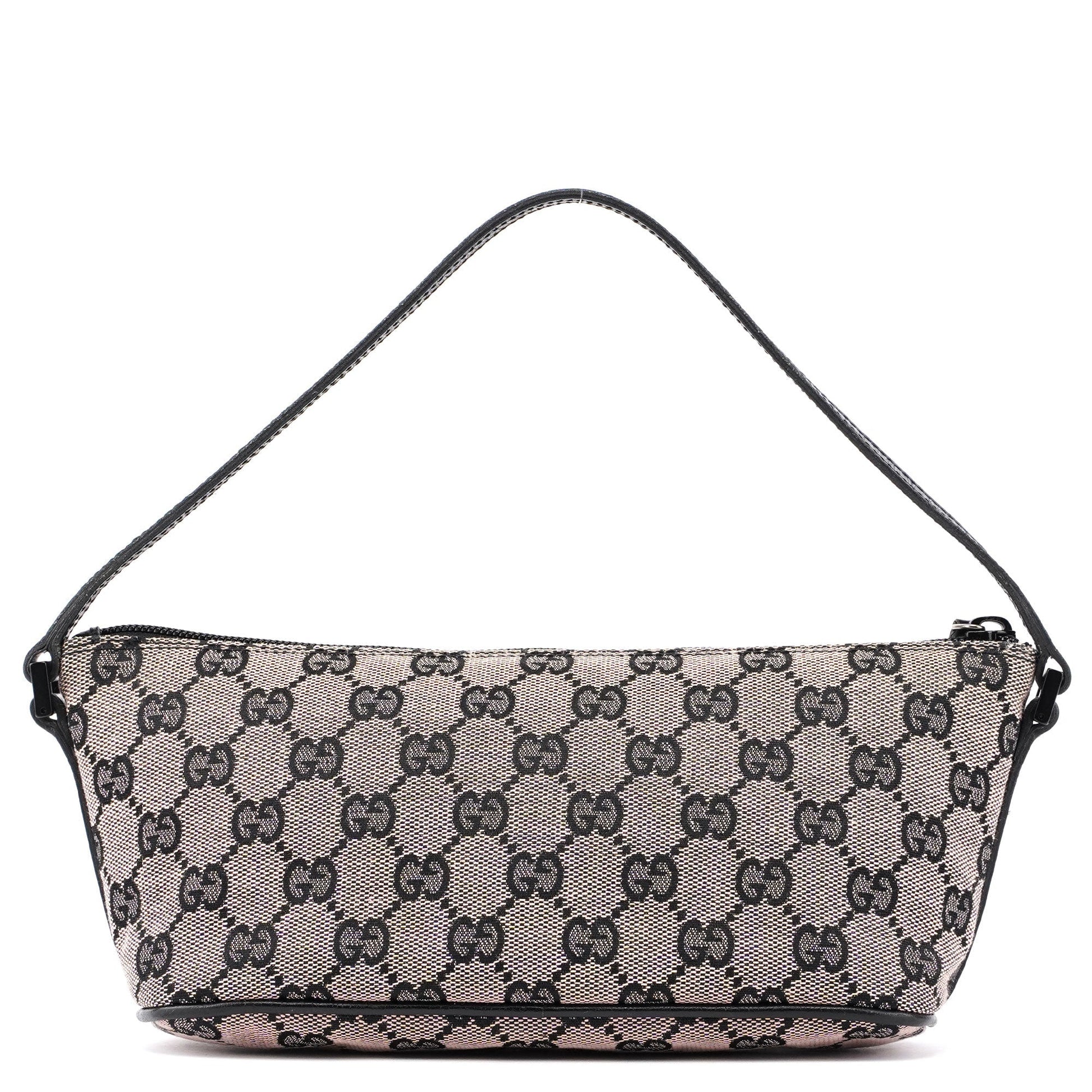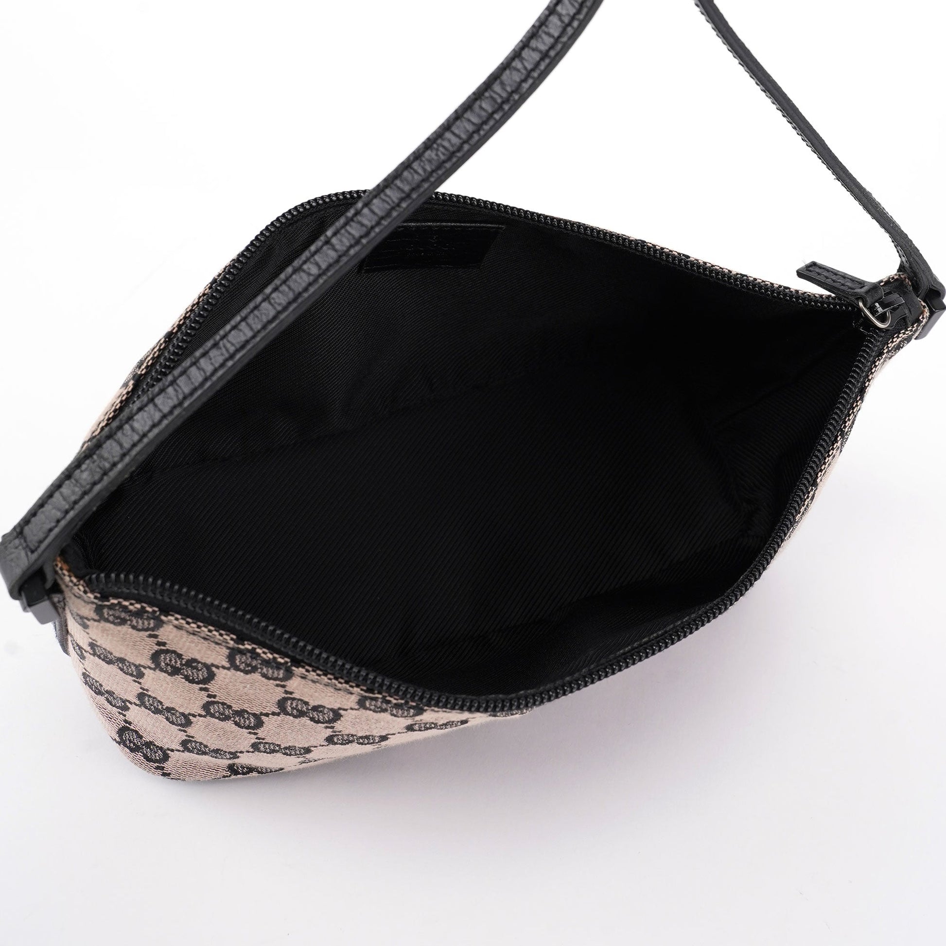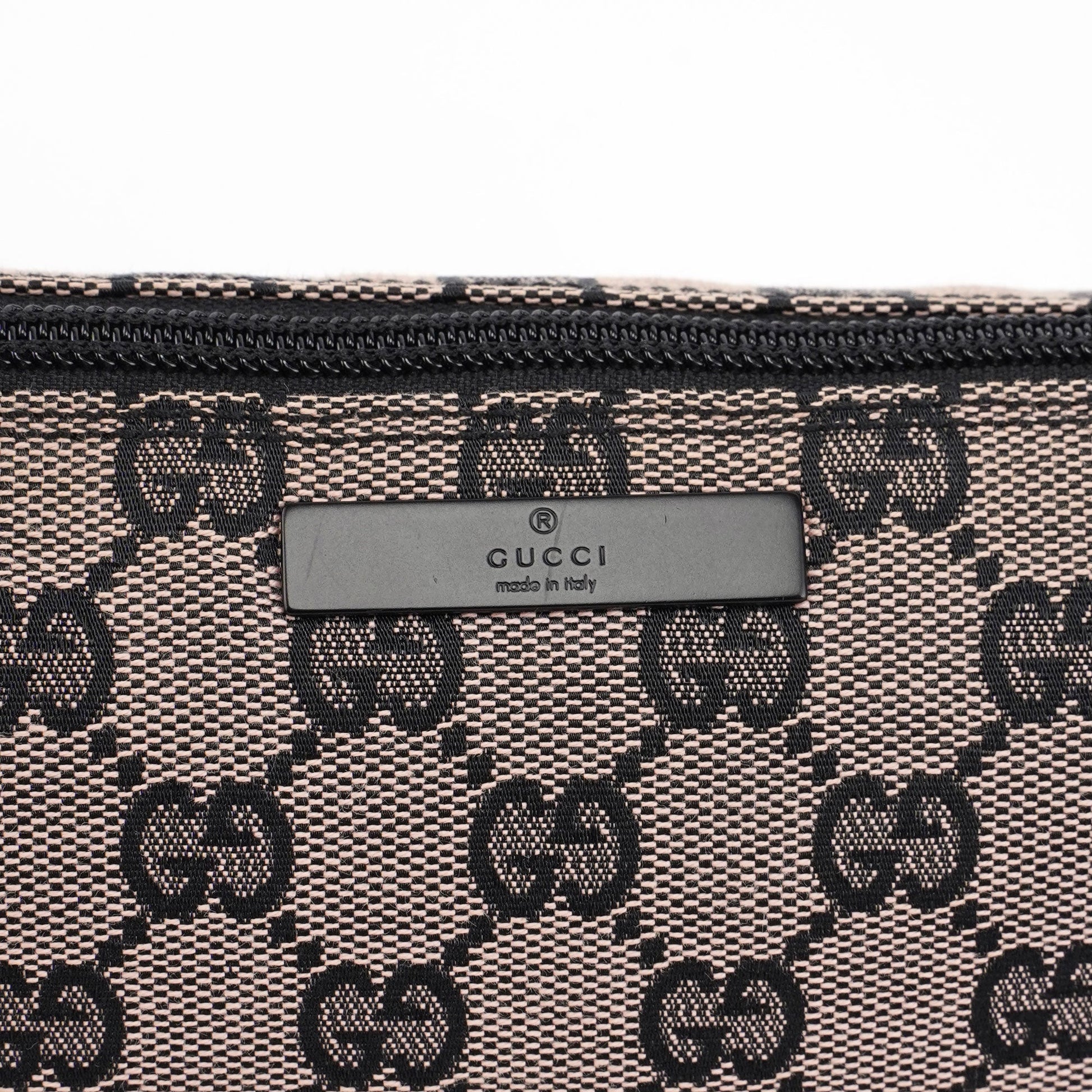 Explore timeless elegance with the Gucci GG Boat Pochette by Tom Ford, circa late 1990s. This exquisite piece combines beige GG canvas with black leather trim and matte black hardware. Its secure zip closure and satin-lined interior offer luxury and practicality, while the subtle Gucci plaque adds a touch of heritage.