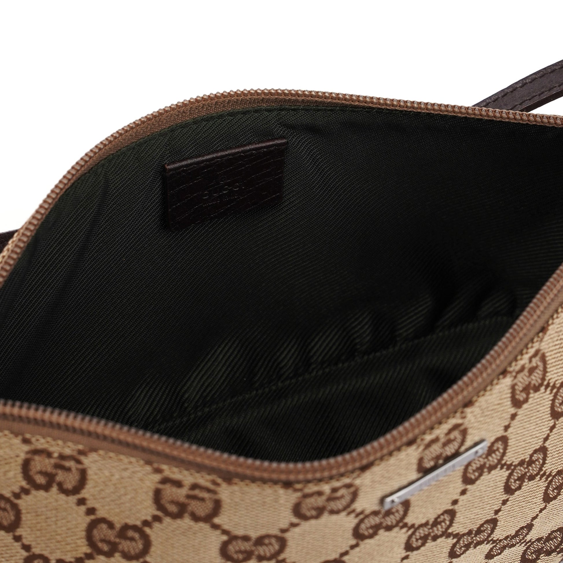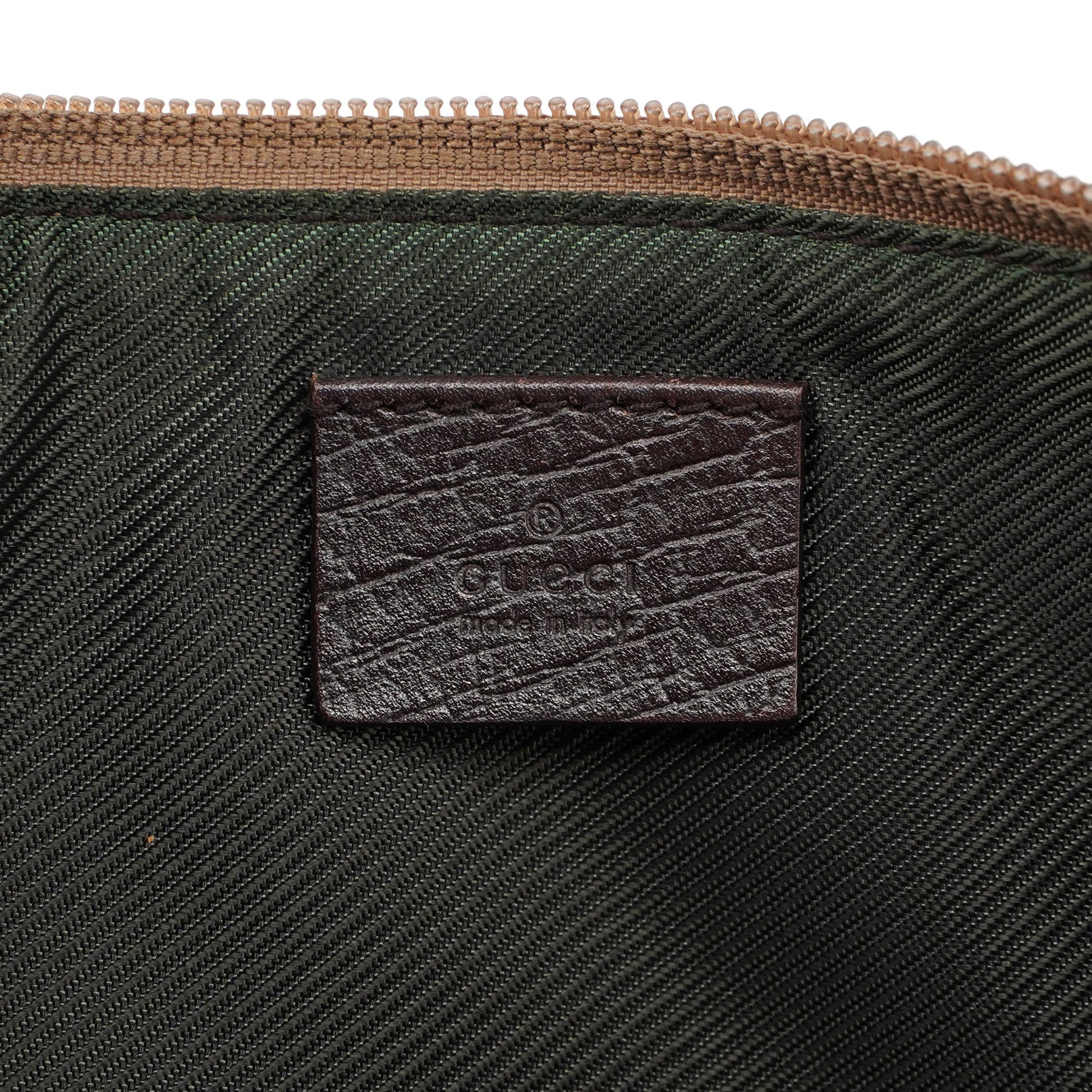 Explore timeless elegance with the Gucci GG Boat Pochette by Tom Ford, circa late 1990s. This exquisite piece combines beige GG canvas with brown leather trim and silver-tone hardware. Its secure zip closure and satin-lined interior offer luxury and practicality, while the subtle Gucci plaque adds a touch of heritage. A perfect blend of vintage charm and sophistication.