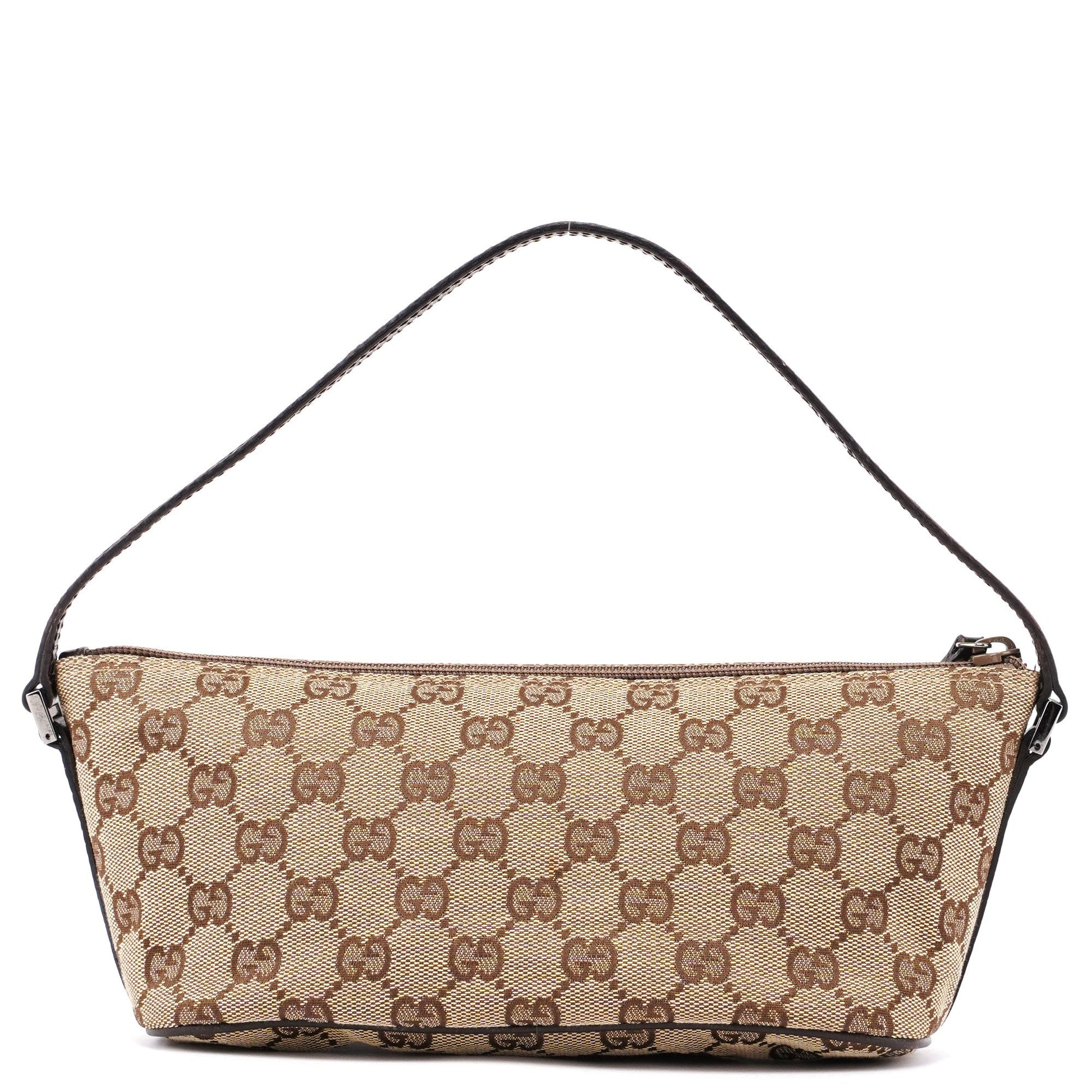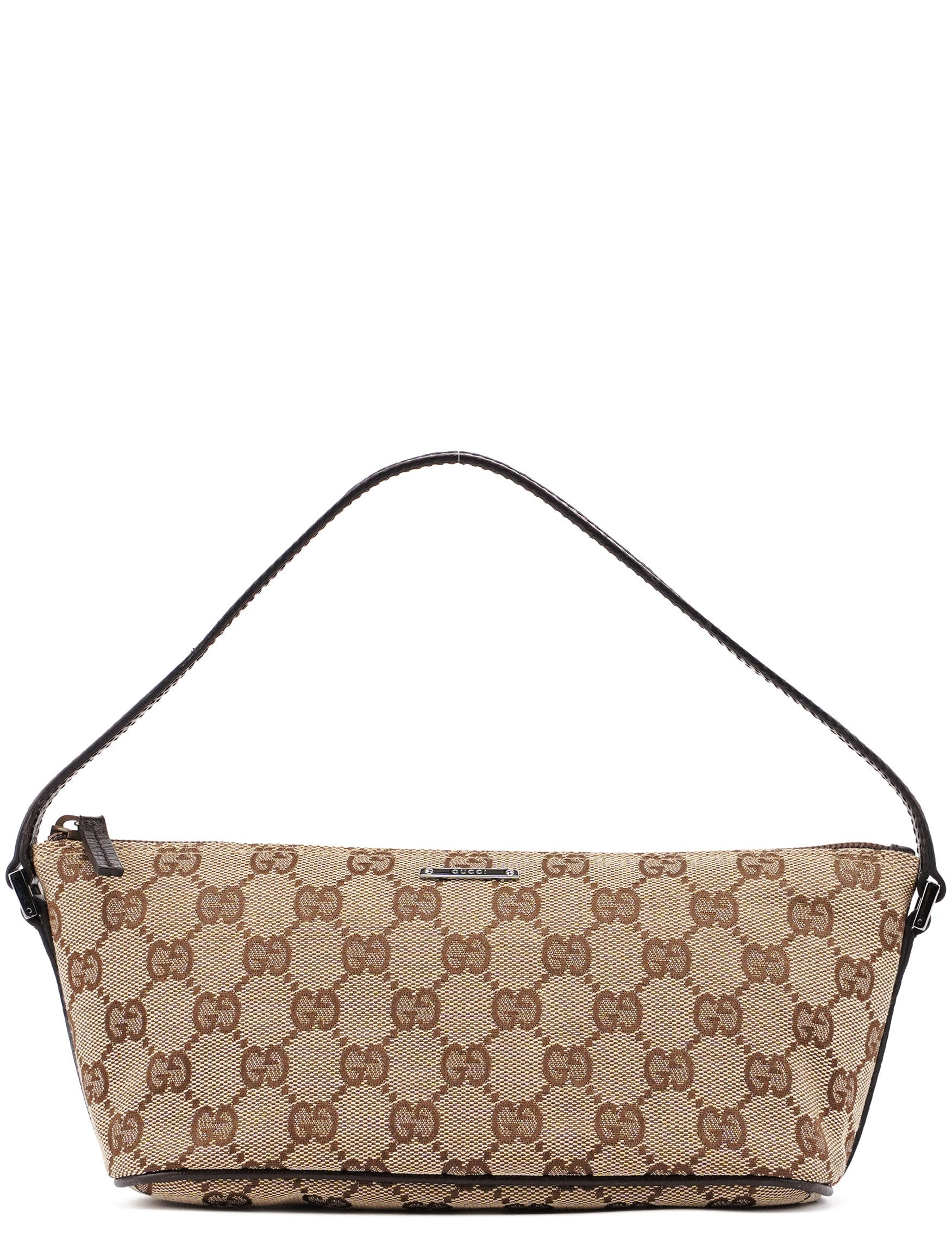 Explore timeless elegance with the Gucci GG Boat Pochette by Tom Ford, circa late 1990s. This exquisite piece combines beige GG canvas with brown leather trim and silver-tone hardware. Its secure zip closure and satin-lined interior offer luxury and practicality, while the subtle Gucci plaque adds a touch of heritage.