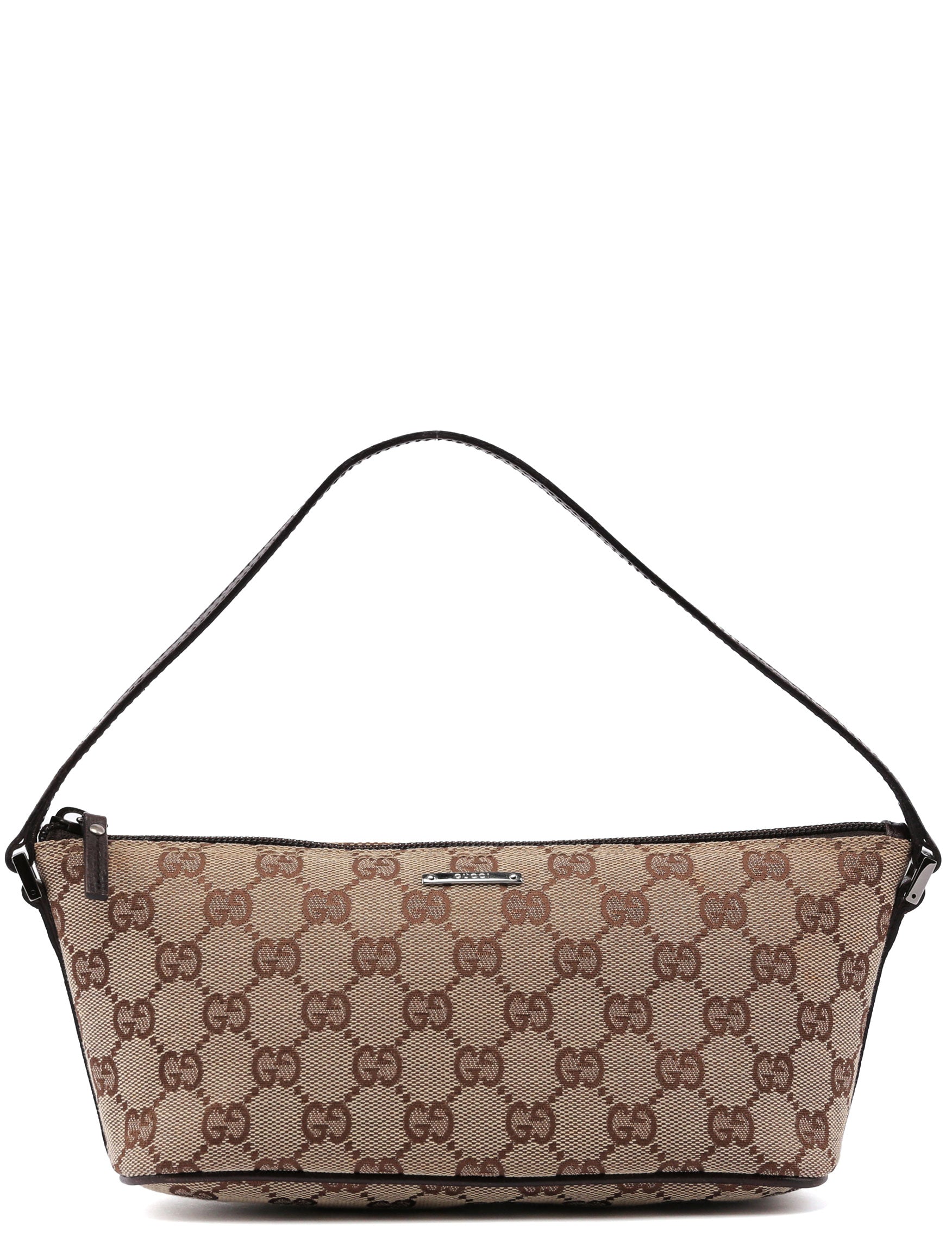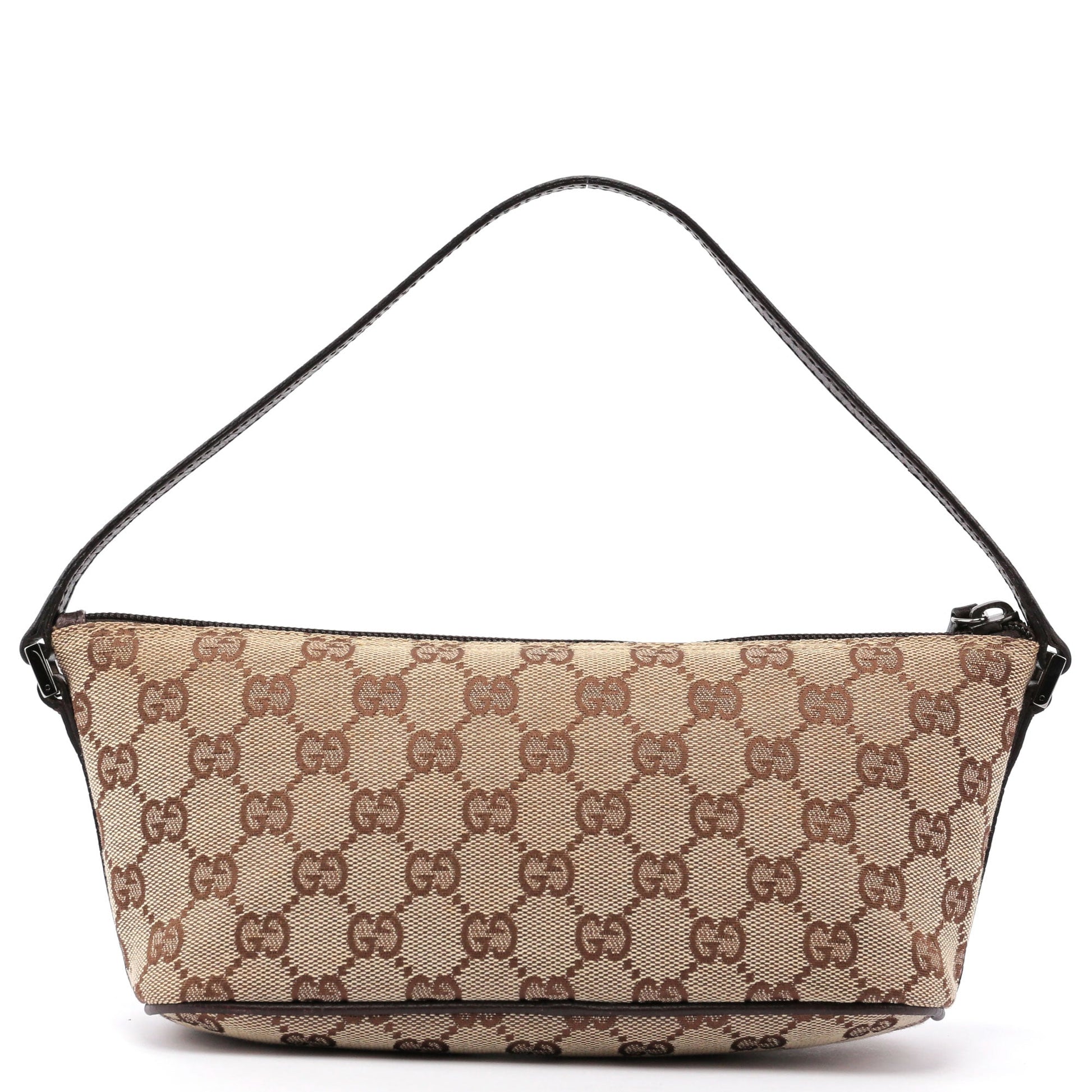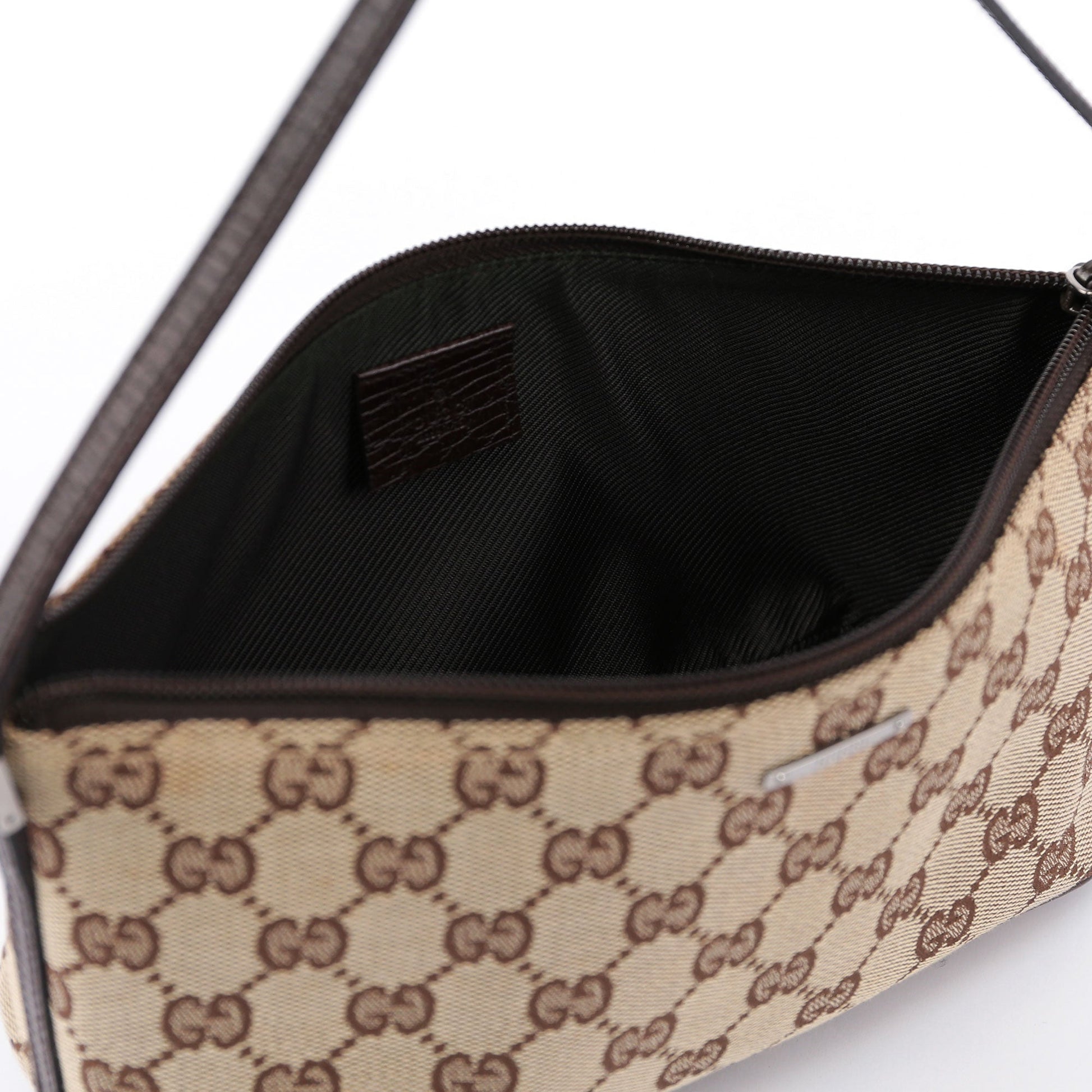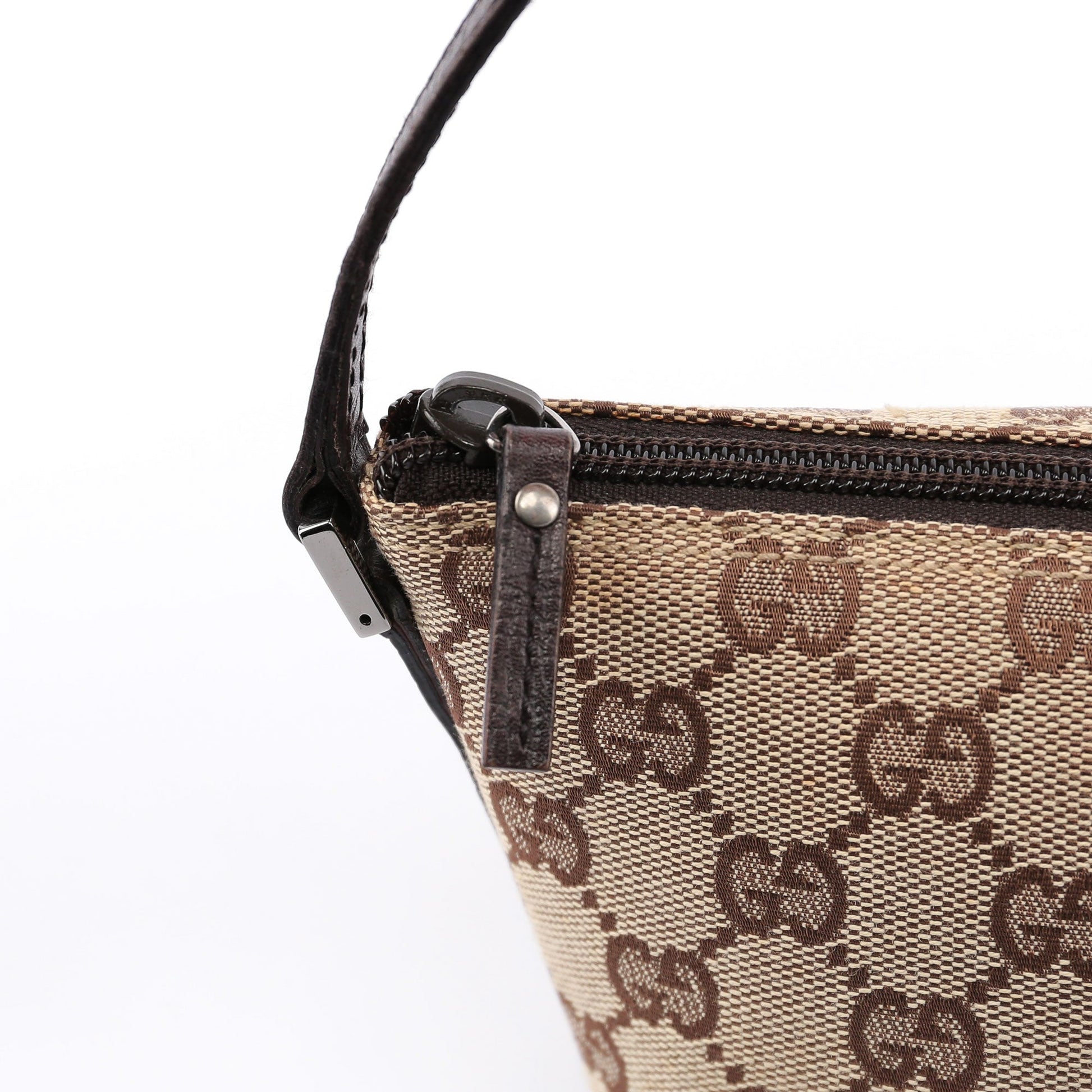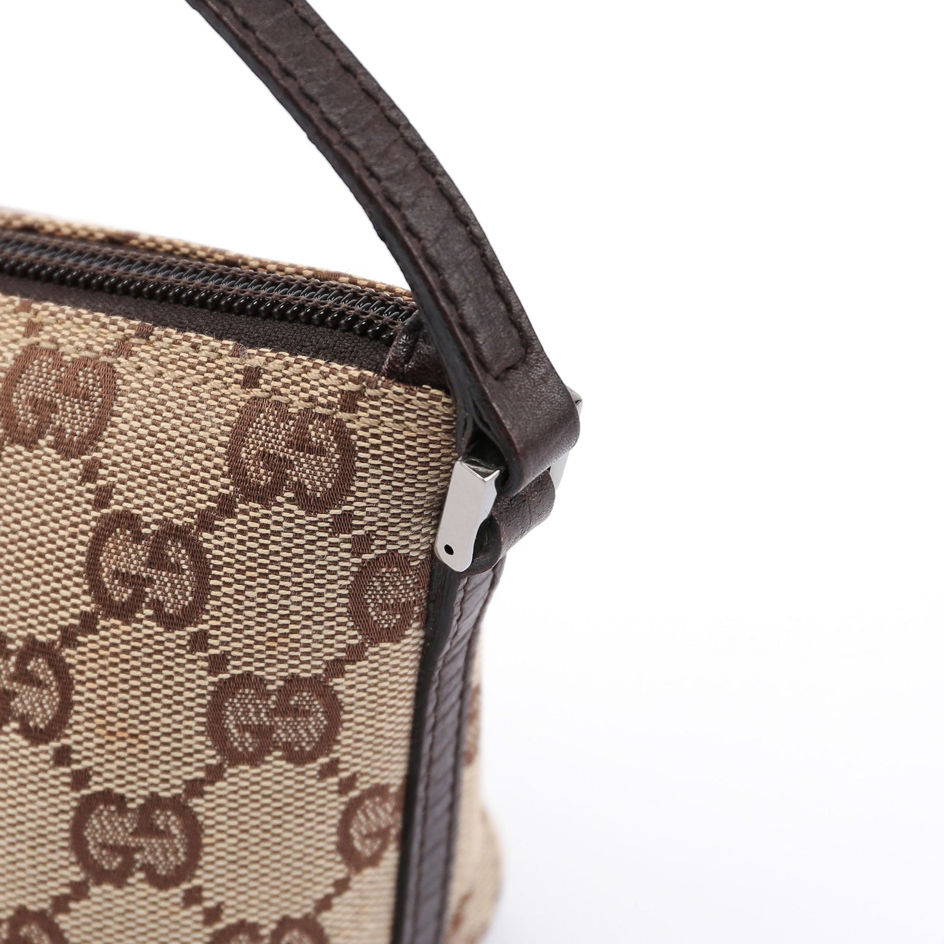 Explore timeless elegance with the Gucci GG boat pochette by Tom Ford, circa late 1990s. This exquisite piece combines beige GG monogra canvas with brown leather trim and silver-tone hardware. Its secure zip closure and satin-lined interior offer luxury and practicality, while the subtle Gucci plaque adds a touch of heritage. A perfect blend of vintage charm and sophistication.