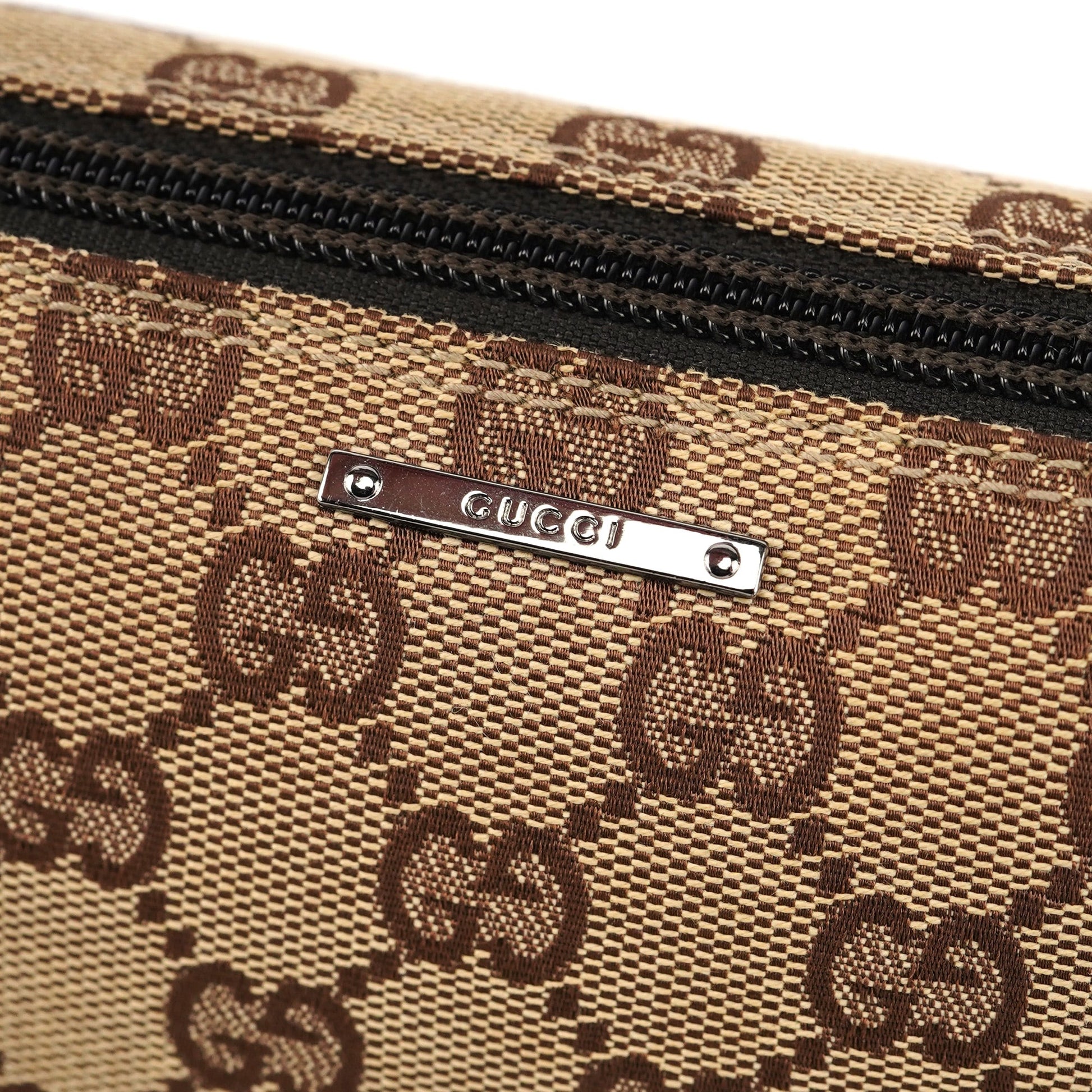 Explore timeless elegance with the Gucci GG Boat Pochette by Tom Ford, circa late 1990s. This exquisite piece combines beige GG canvas with brown leather trim and silver-tone hardware. Its secure zip closure and satin-lined interior offers luxury and practicality, while the subtle Gucci plaque adds a touch of heritage.